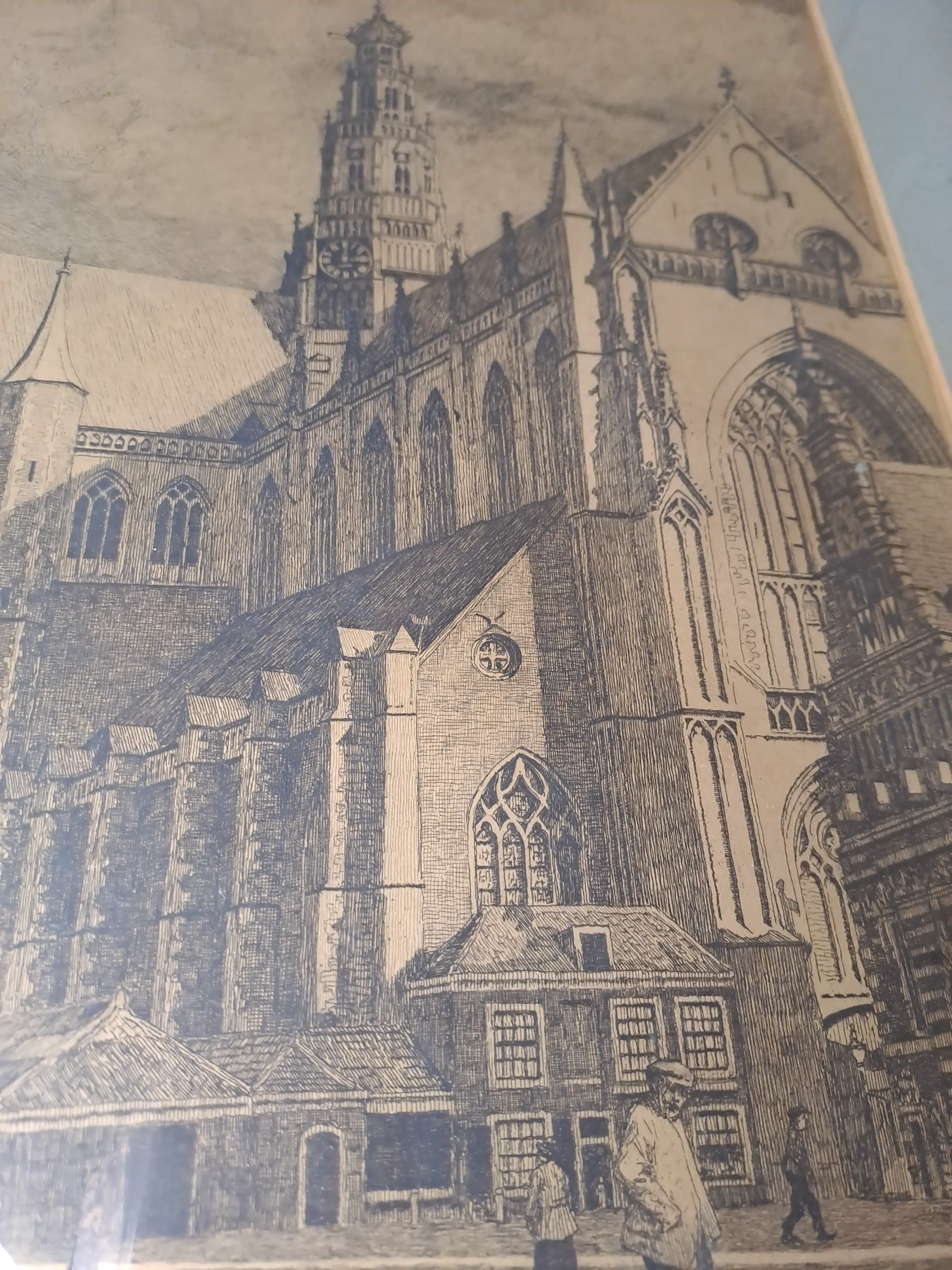 Artdeco art deco art nouveau plateel groot grote ets schilderij tekening stadsbeeld kerk noord holland