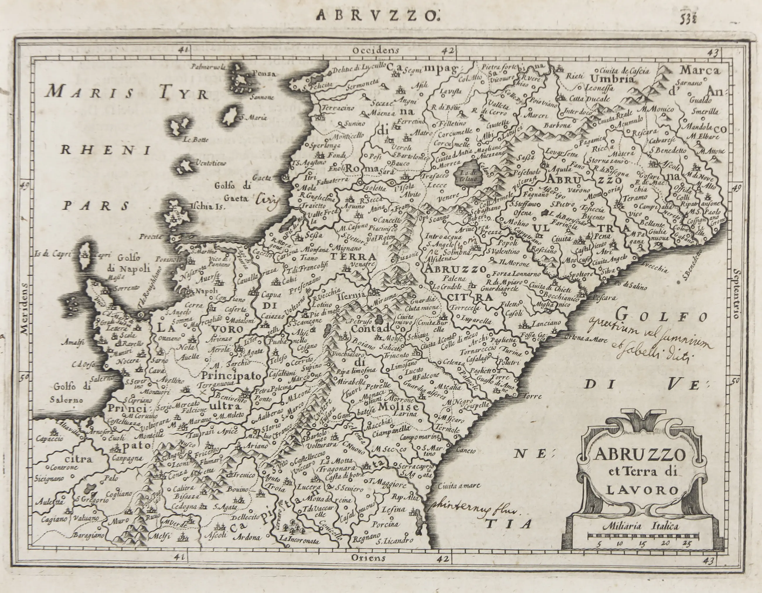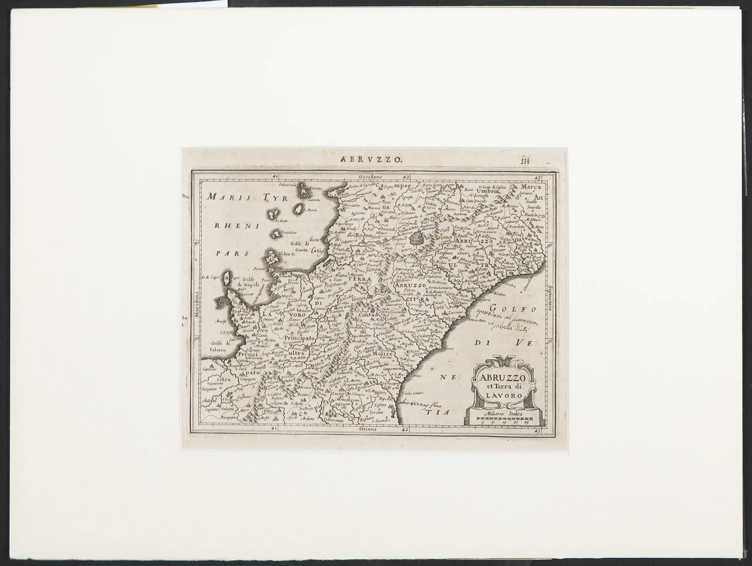 Kopergravure met enkele met pen geschreven aantekeningen, door Hendrik Hondius gegraveerd. Uit de Mercator-Hondius Atlas Minor (de kleine atlas). Deze gravure van Abruzzo et Terri di Lavoro verscheen in een editie van de Atlas rond 1636.
