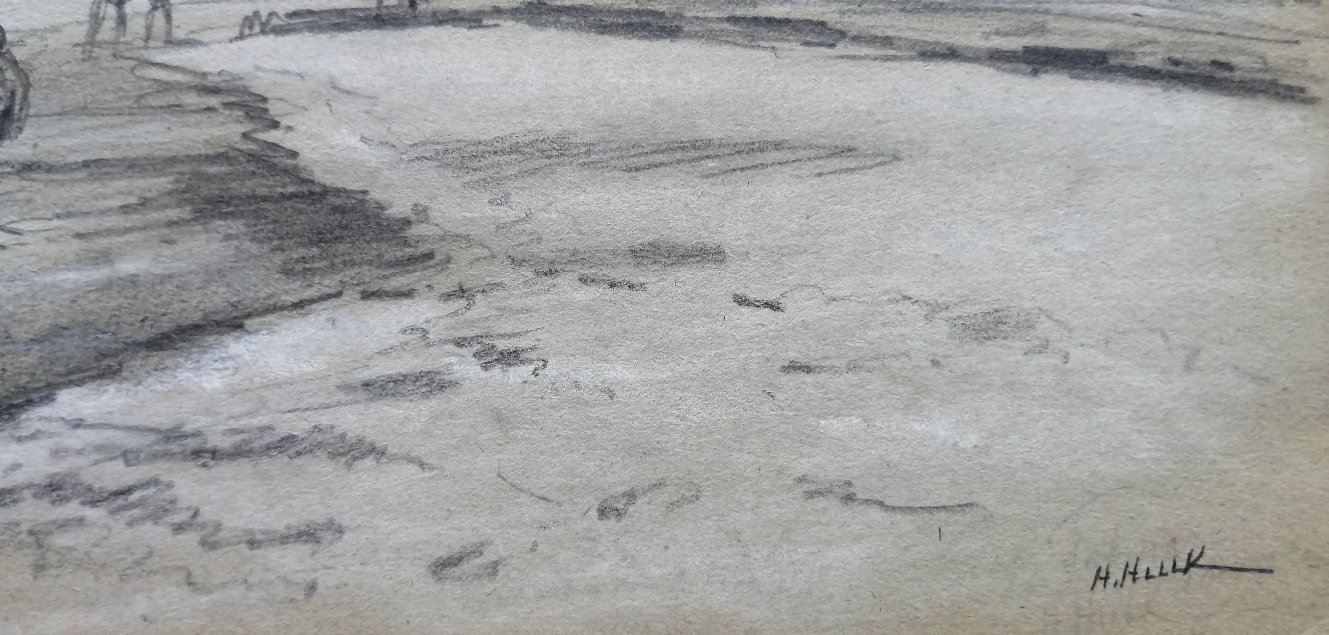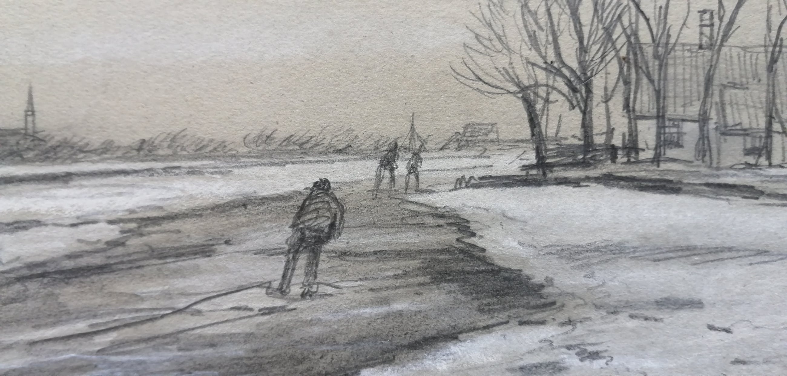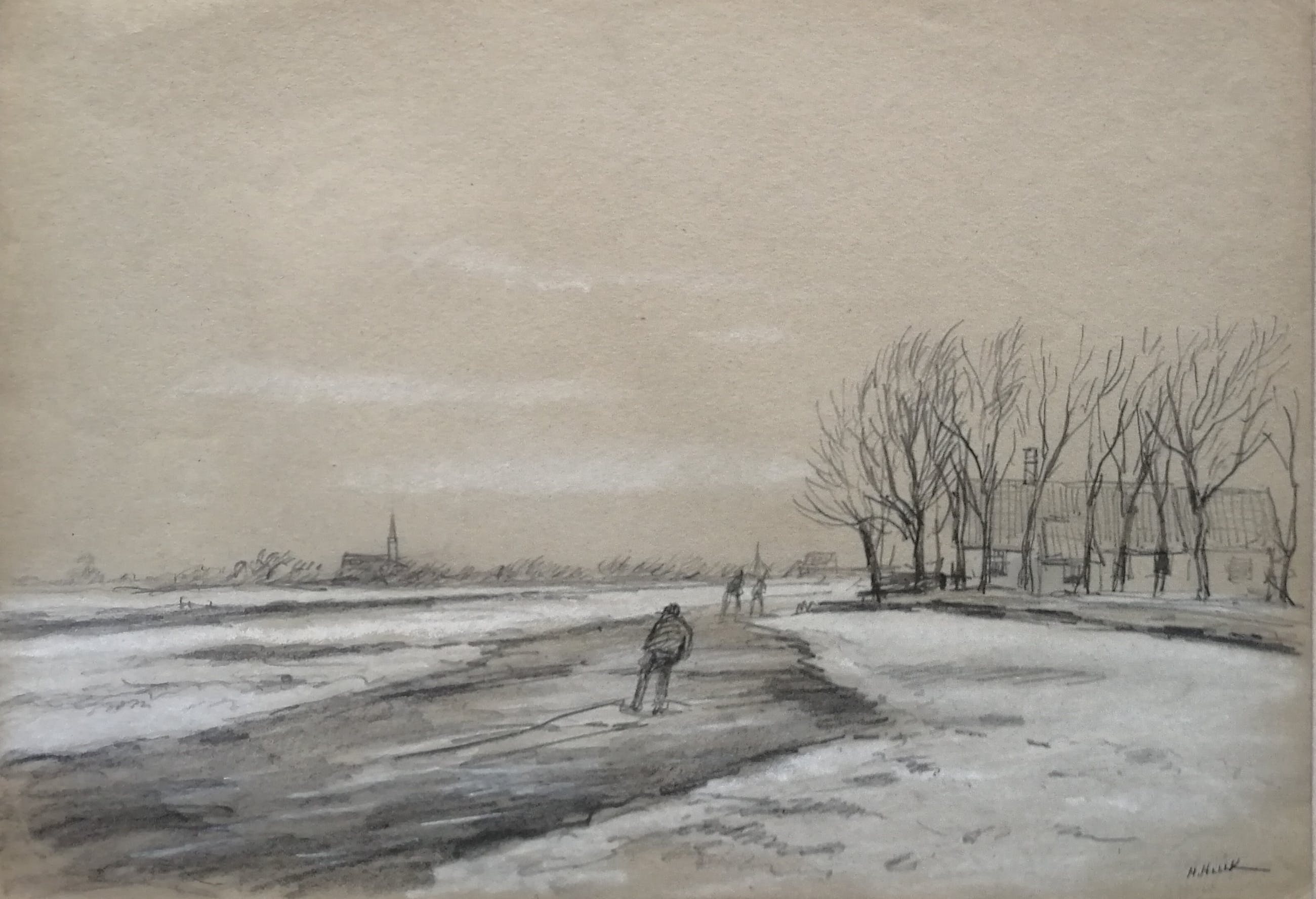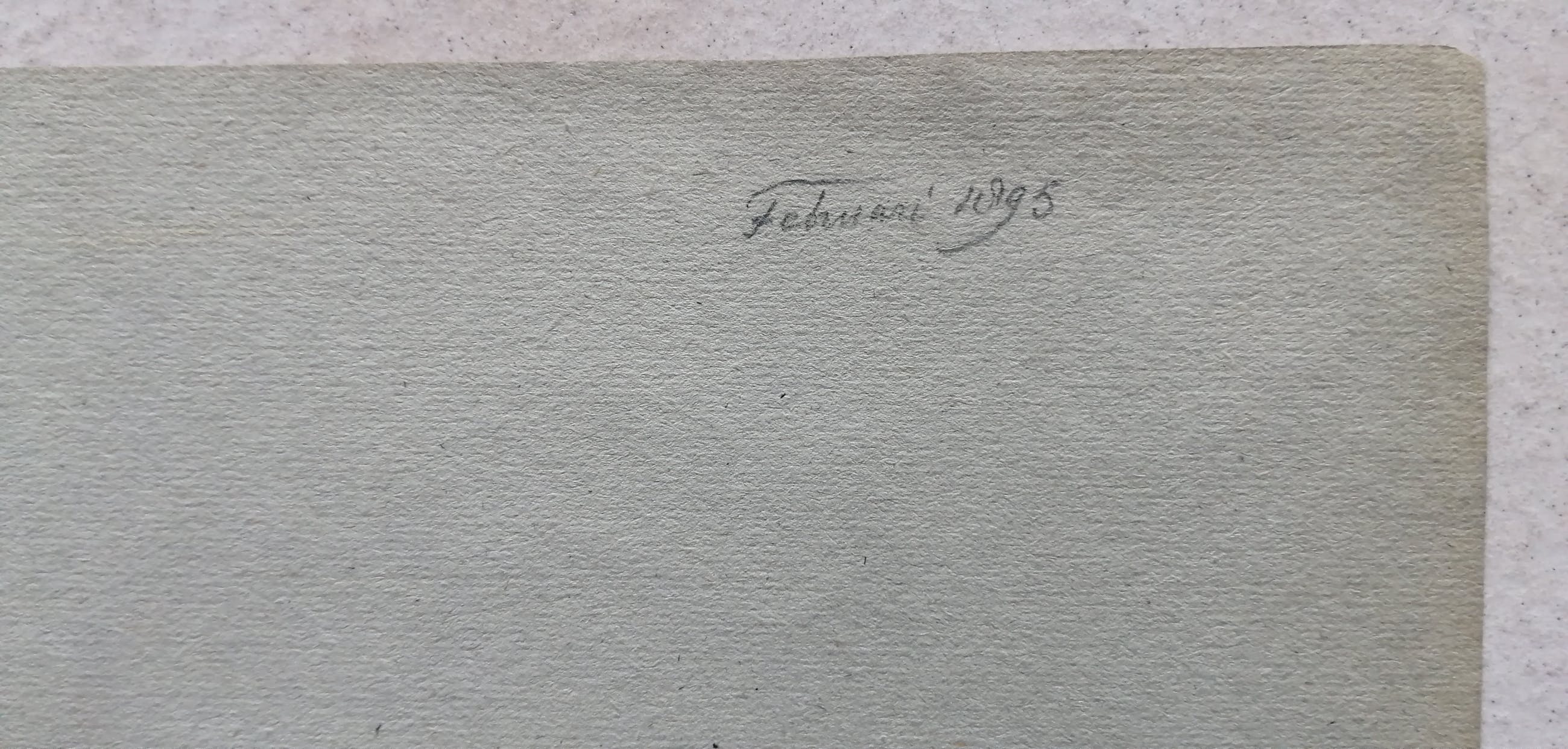 Zwart en wit krijttekening met potlood op grijs papier.Gesigneerd rechtsonder.Beeld- en bladmaat 25x35,5 cm.Aan achterzijde rechtsboven "Februari 1895"