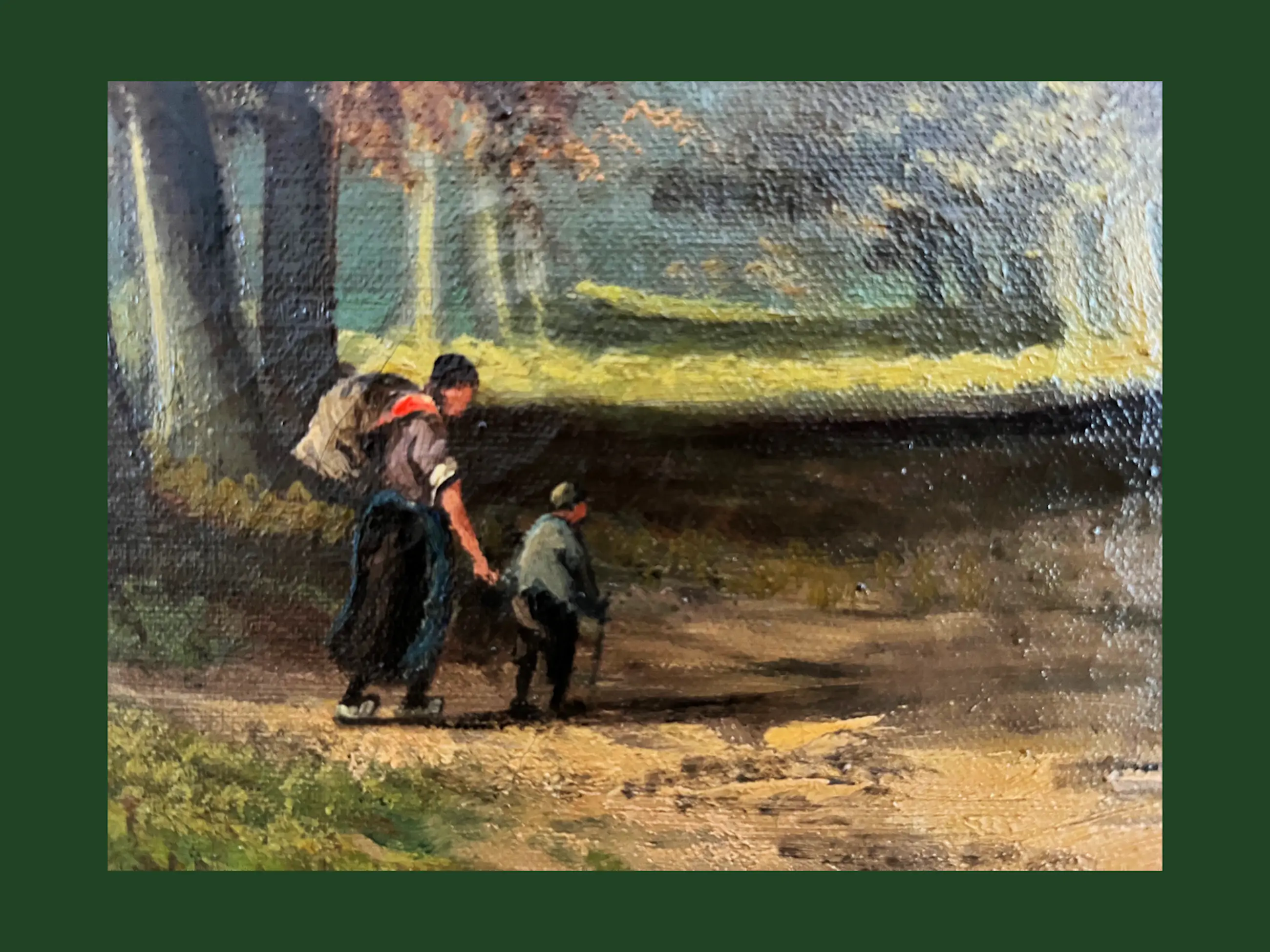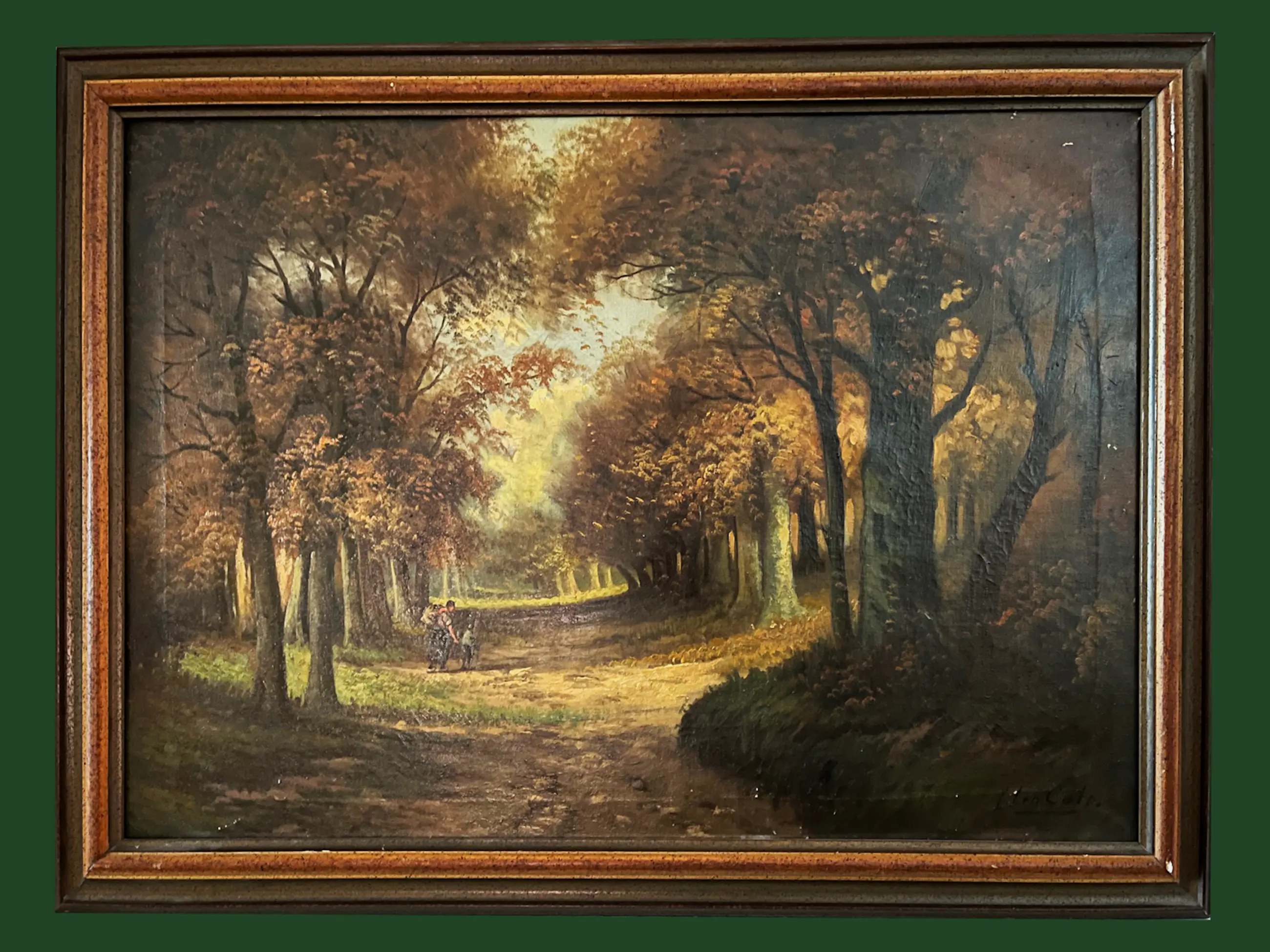 Het werk toont een landelijke boslaan met figuren in het zachte licht van de late middagzon.