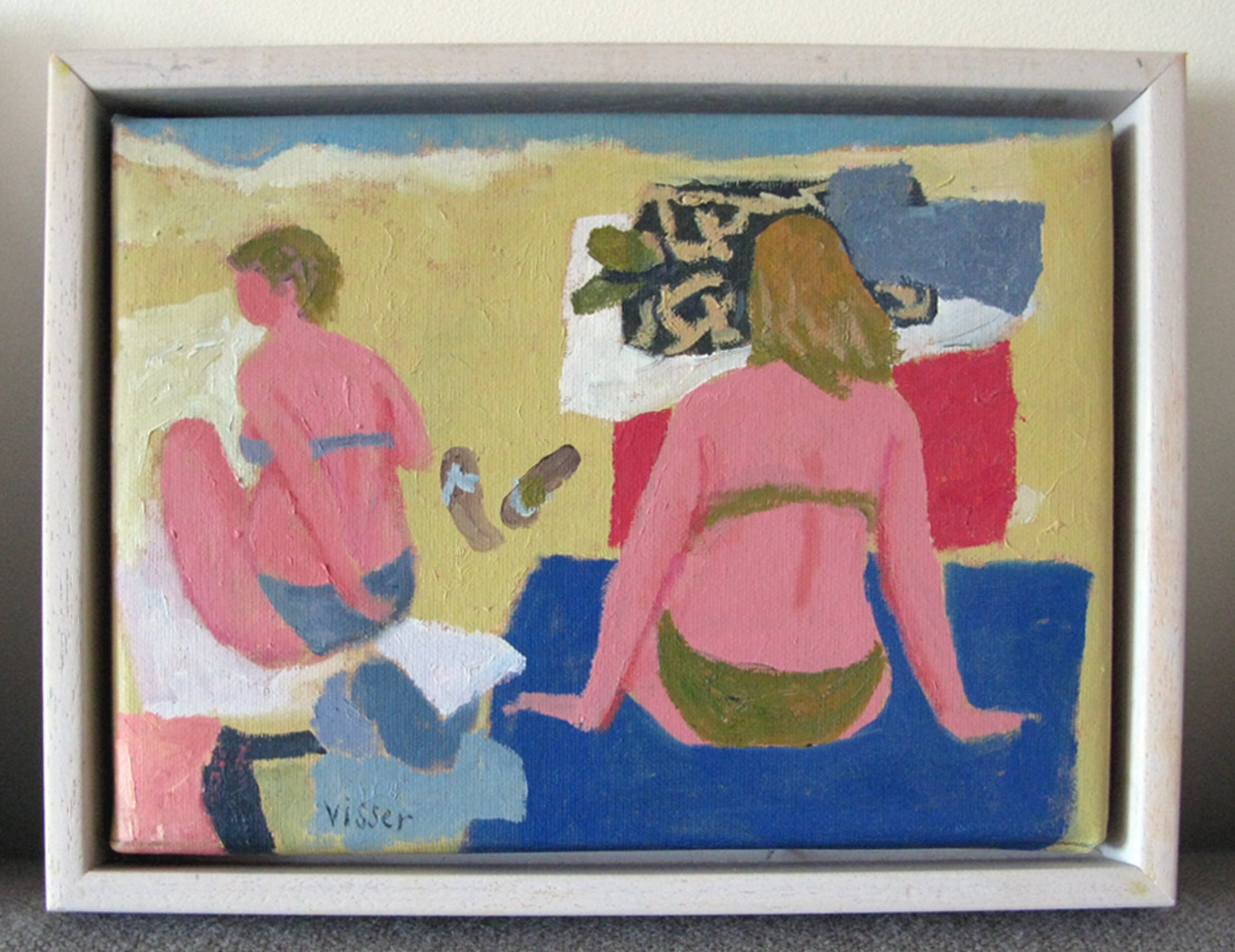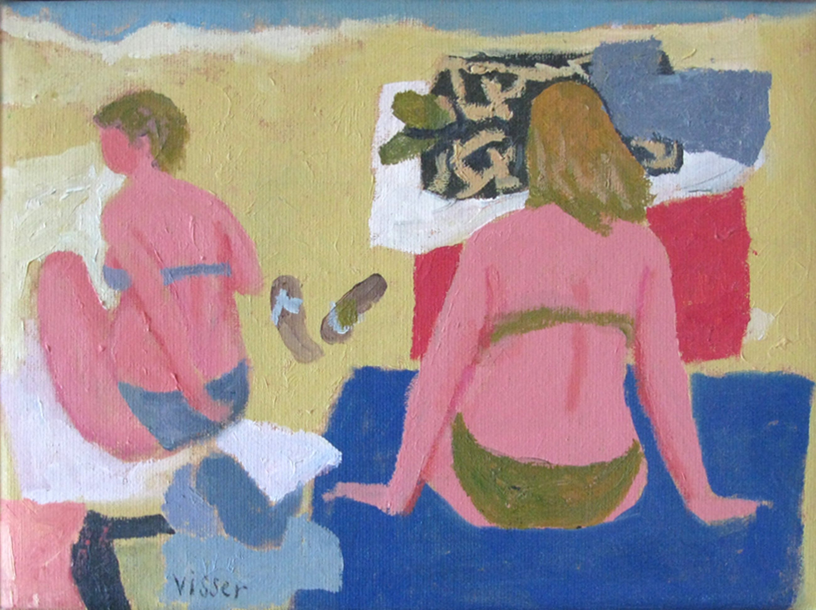 Twee vrouwen op het strand, de spullen liggen op het zand. En daartussen de slippers !