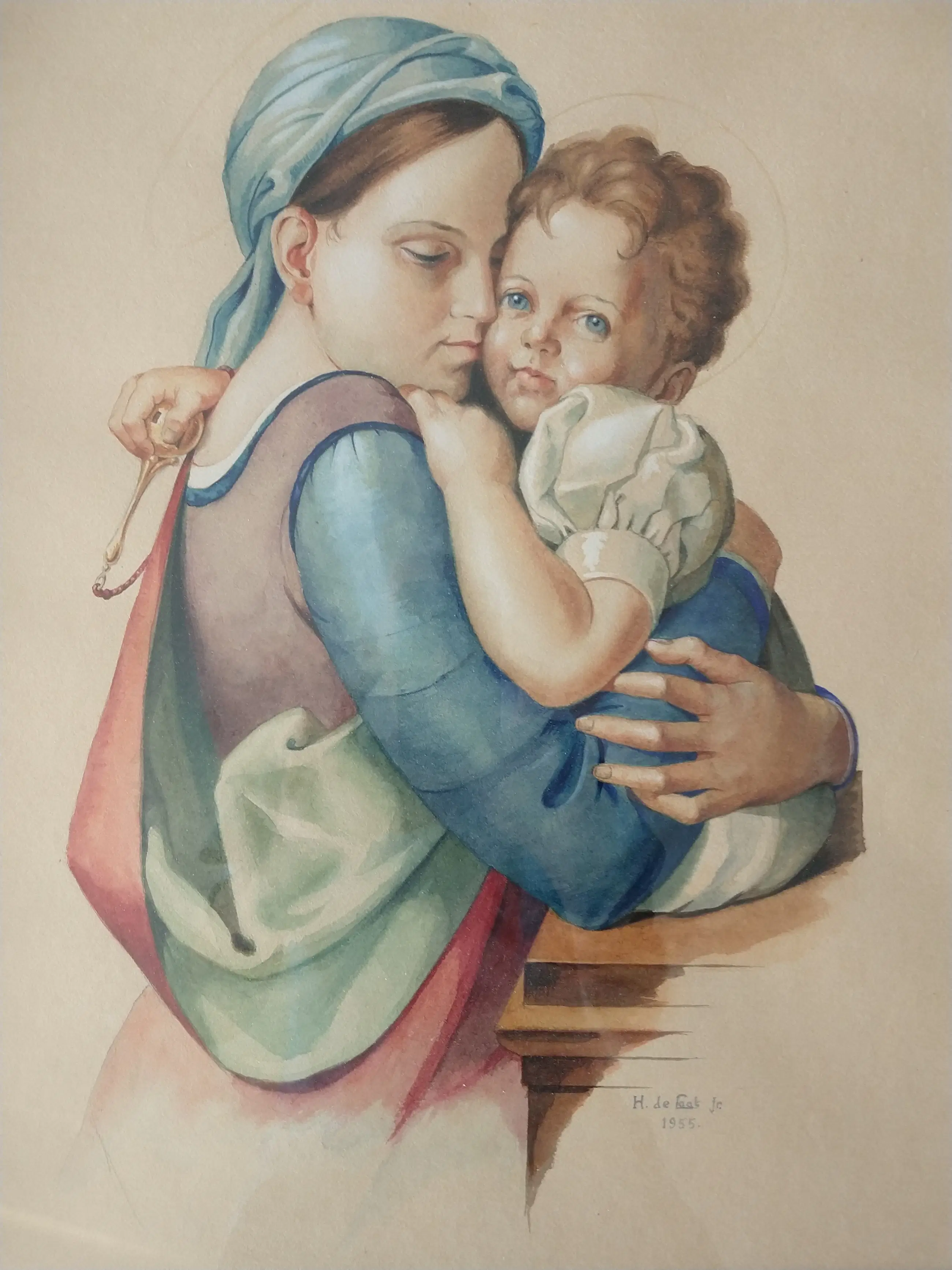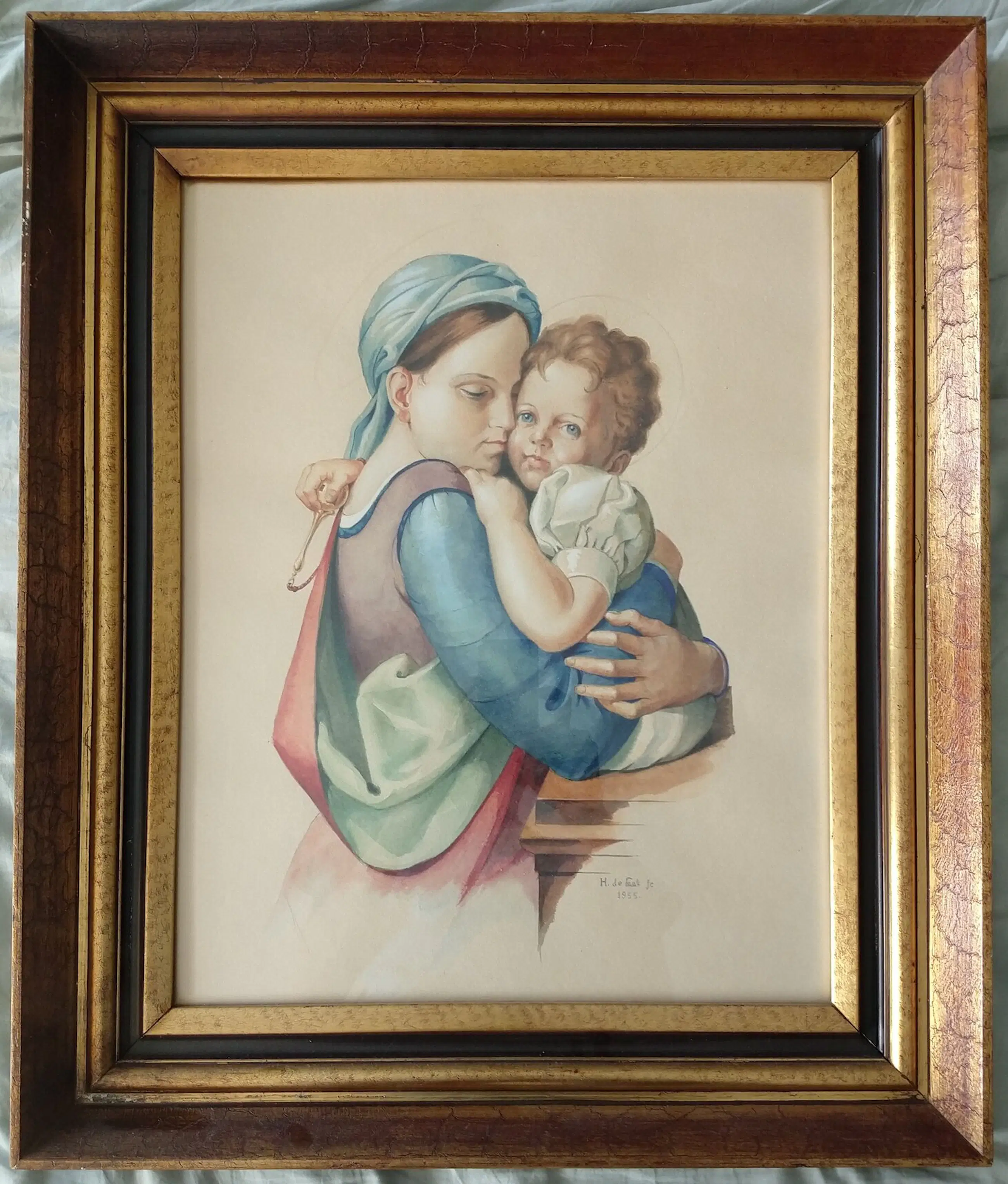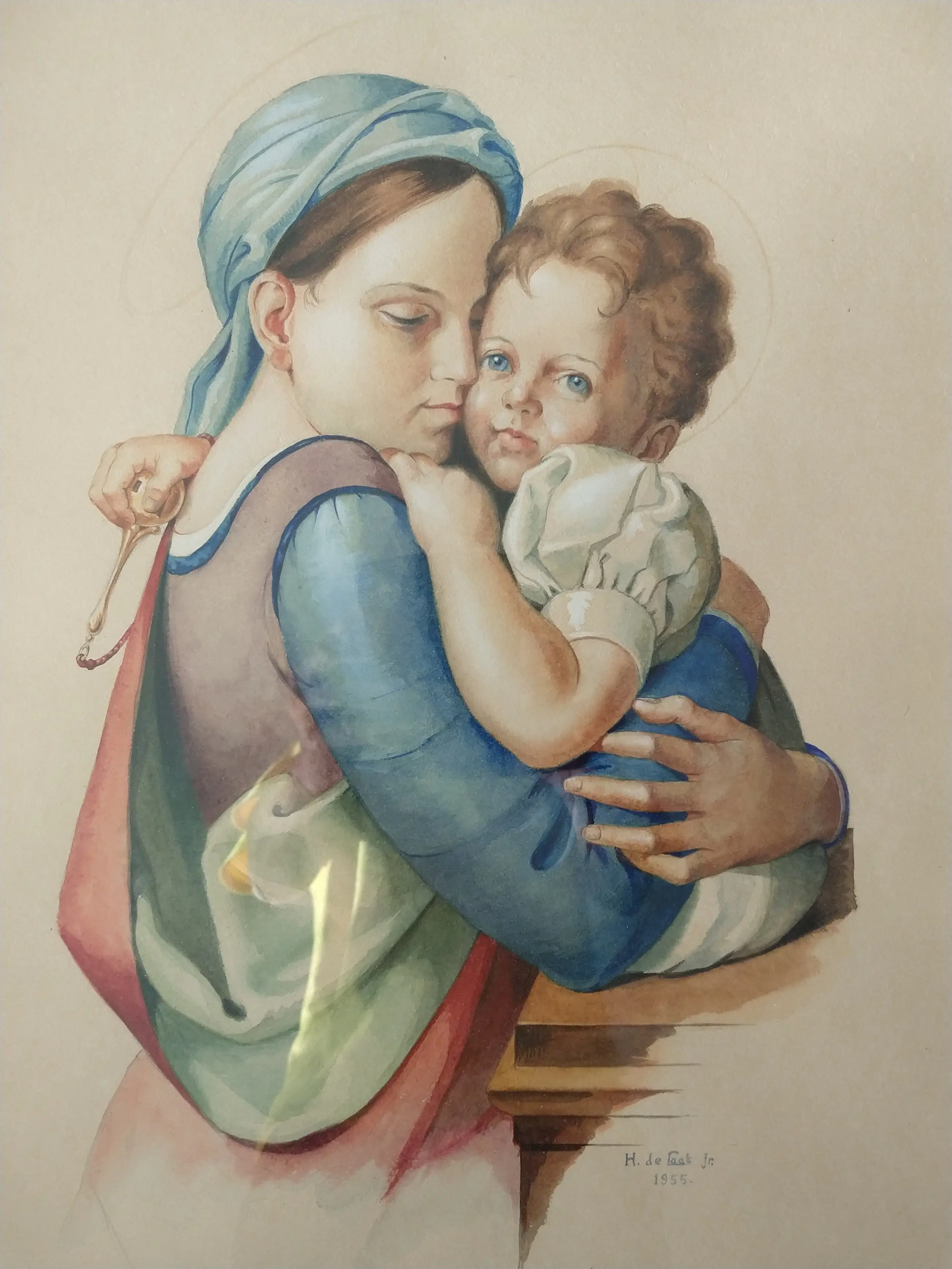 H.C. de Laat jr. (1932-1995). Moeder met kind. Subliem zeer realistisch geschilderde aquarel. Gesigneerd en gedateerd 1955. Afmeting inclusief lijst 65x55 cm. De aquarel is in zeer goede staat. de lijst is in goede staat met ouderdomssporen. Zeer verfijnde aquarel van een moeder met kind van Henk de Laat junior.