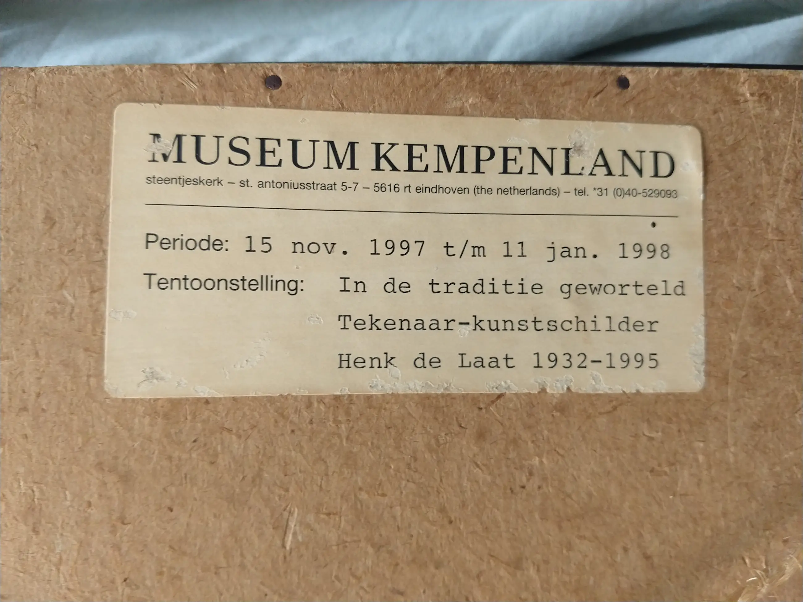 Met grote technische vaardigheid en theoretische kennis en met oog voor detail en stofuitdrukking werkte hij naar het leven, waarbij de kunst uit het verleden zijn inspirerend voorbeeld was. Henk de Laat bleef aan de traditie trouw. In het boek: "In de traditie geworteld" is veel te vinden over het leven en werk van de kunstenaar. Op de achterzijde een tentoonstellingsetiket met verwijzing naar de tentoonstelling uit 1998 evenals met naam: "In de traditie geworteld" waar dit kunstwerk was te zien.