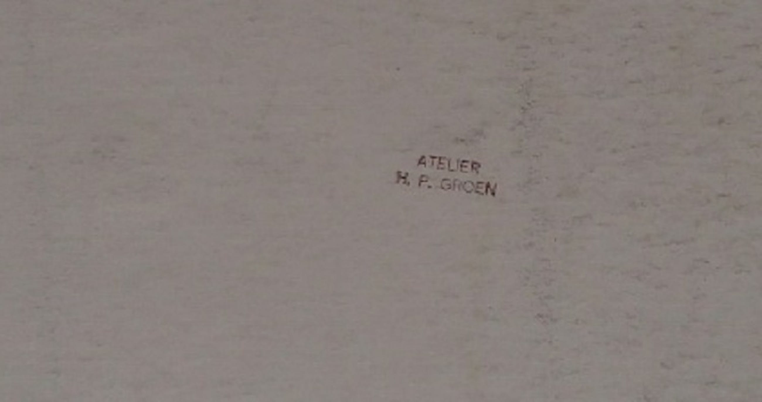 Prachtige tekening van H.P. Groen, bekend kunstenaar. Rechts onder monogram van de kunstenaar en aan de achterzijde een stempel met daarop de naam van de artiest. Rood potlood/krijt in eenvoudig, maar origineel passe partout