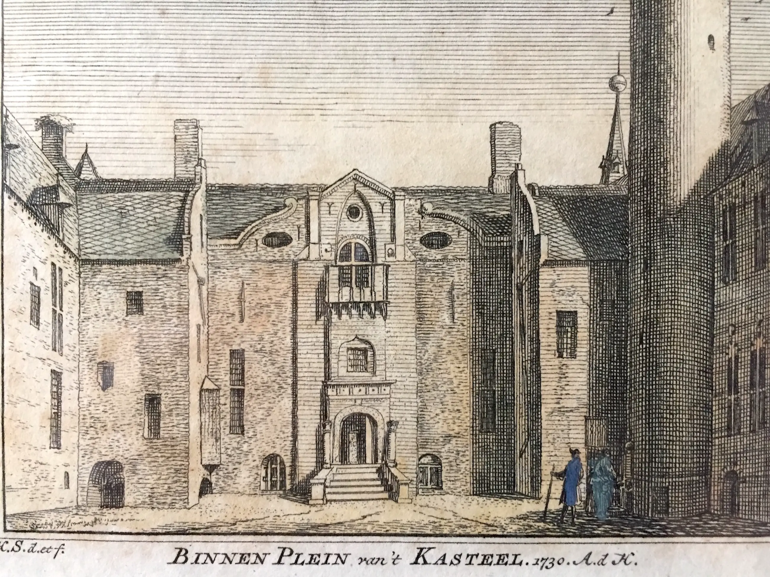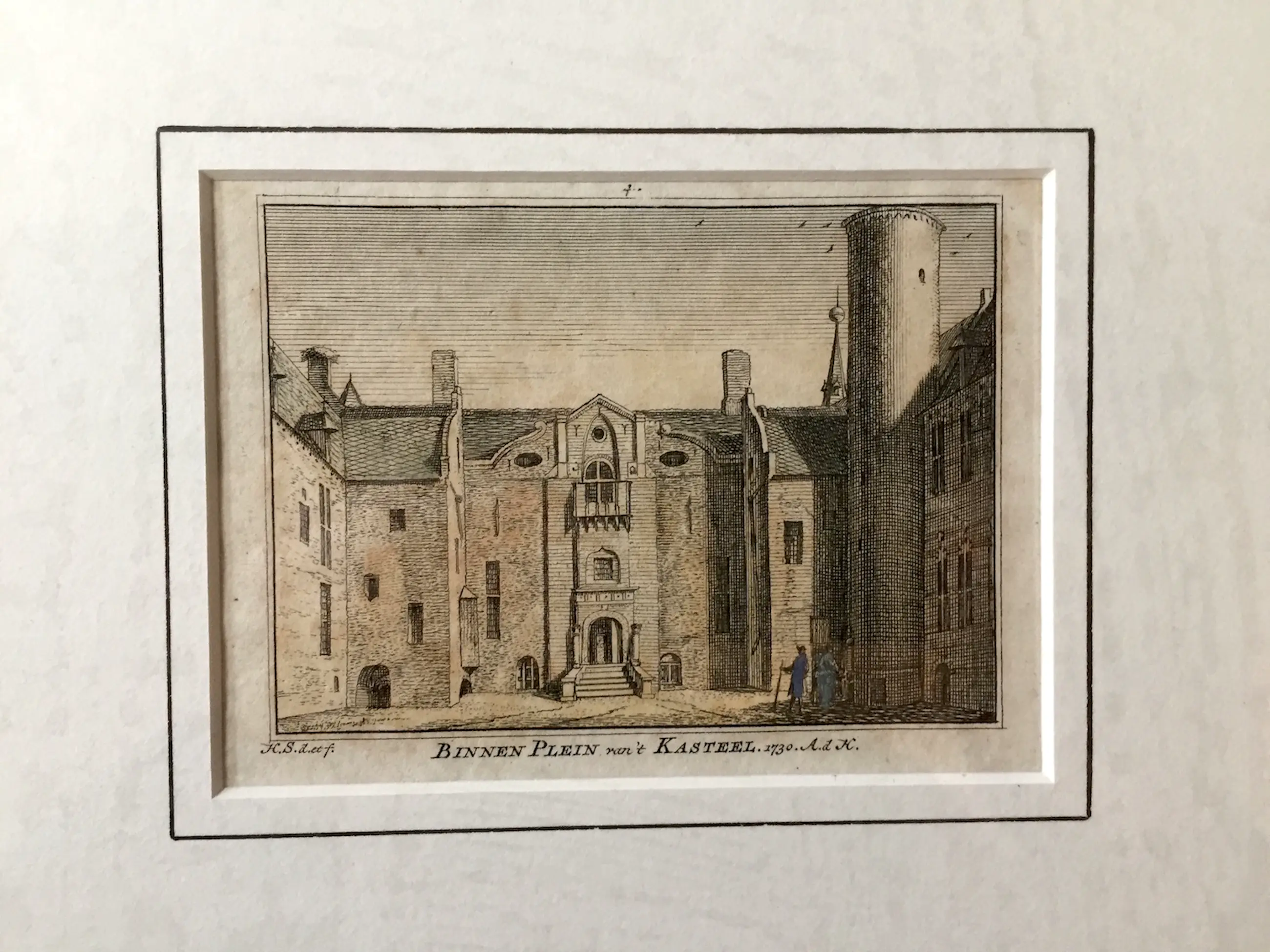 A4 23 Hendrik Spilman naar tekening Abraham de Haen Binnen Plein van 't Kasteel (Kasteel Helmond) Gravure 1730 34 x 27 cm
