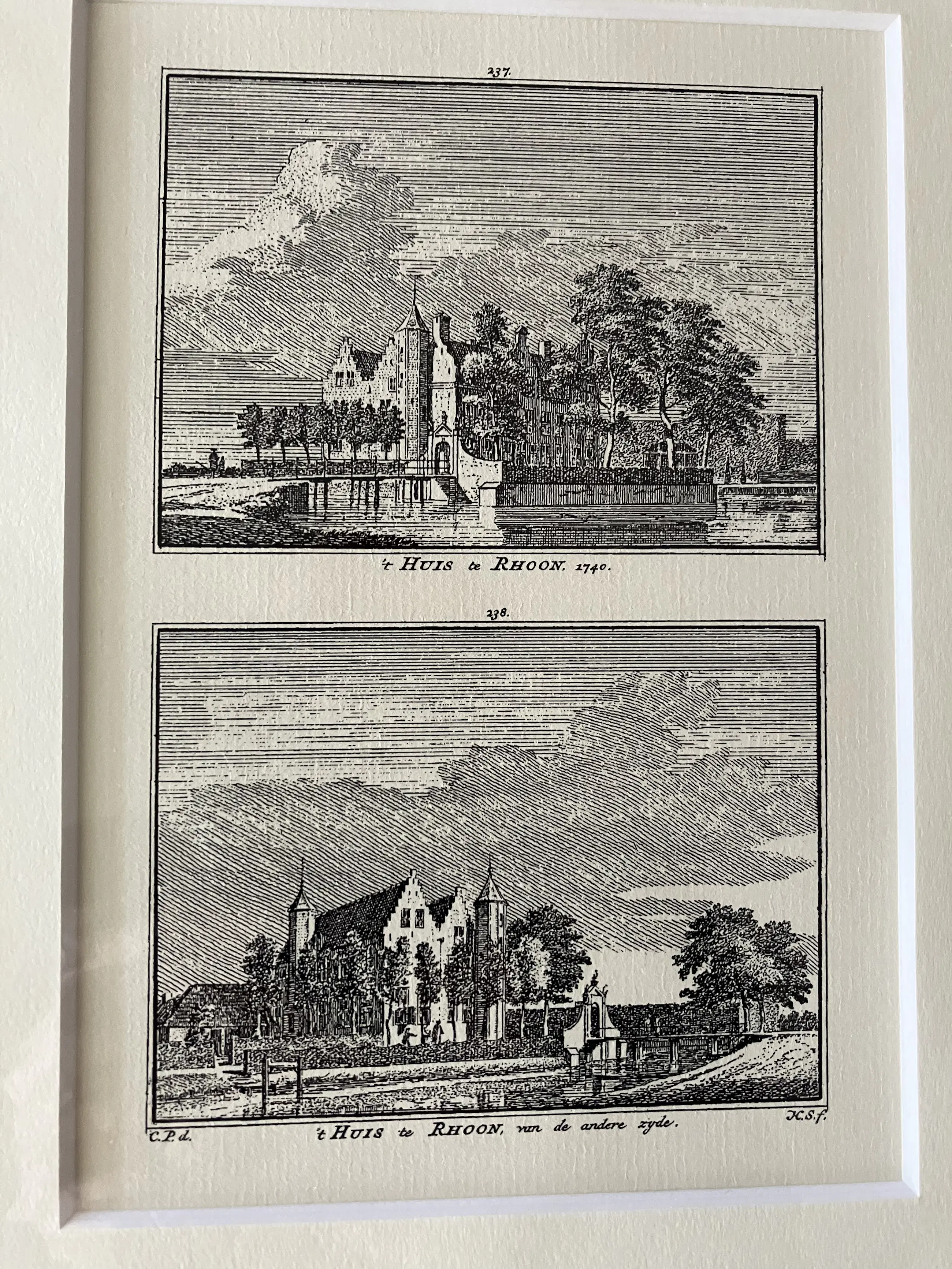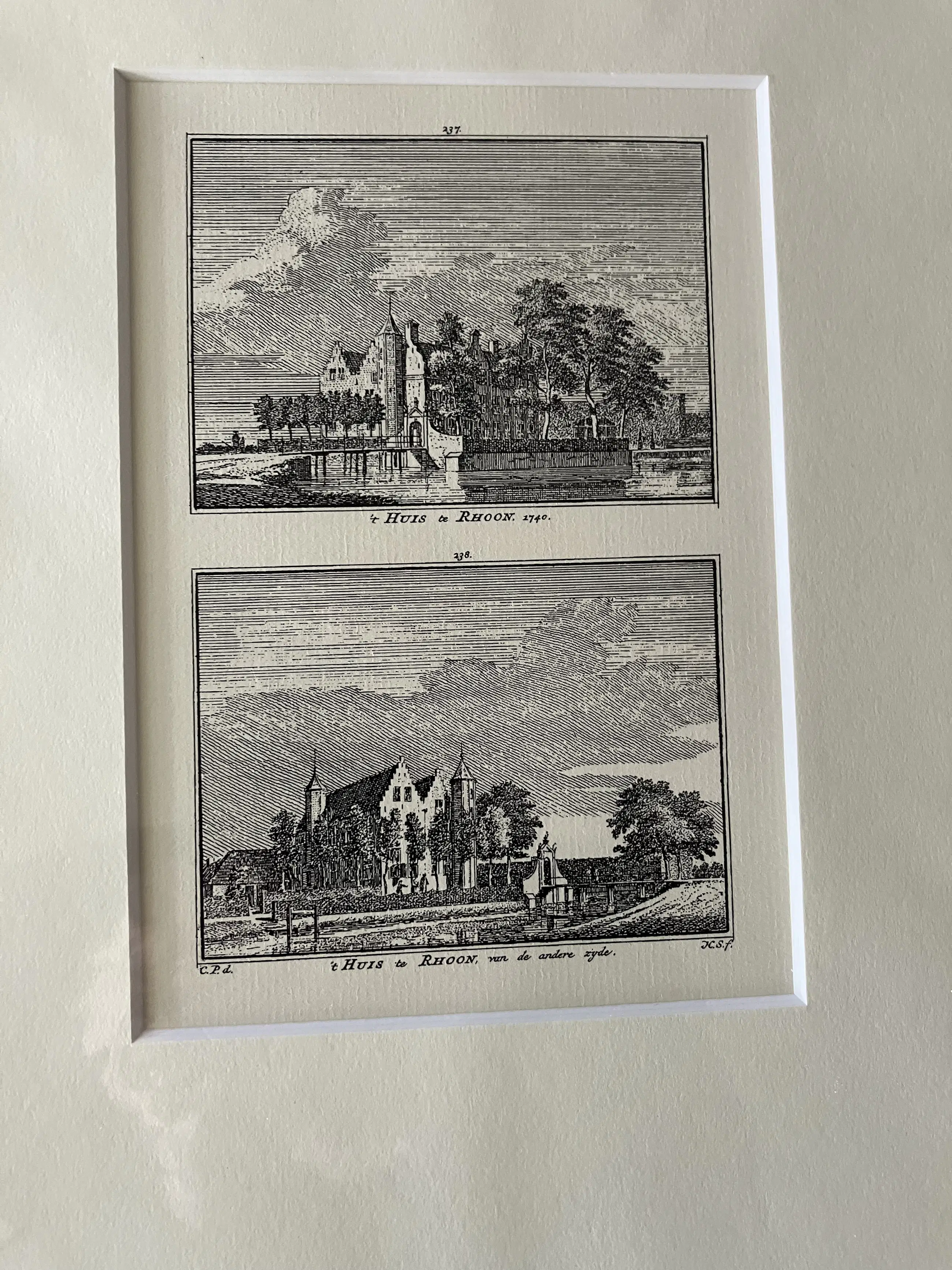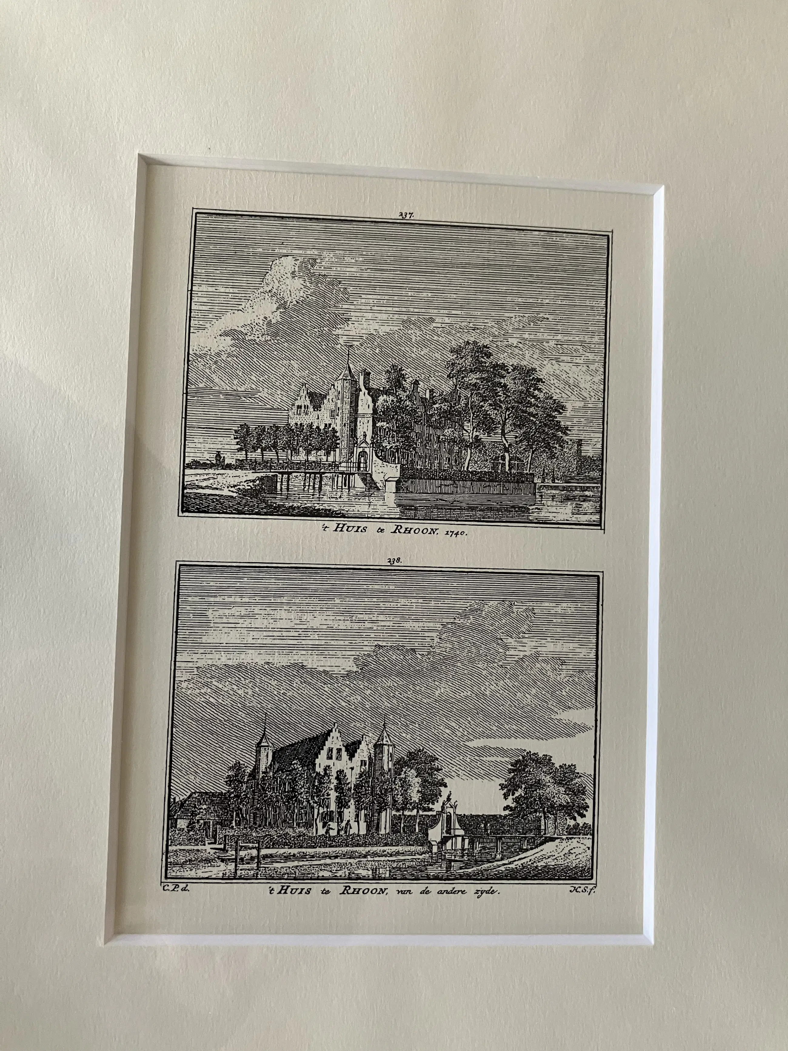 Een gravure van het kasteel van Rhoon, twee antieke prenten van het kasteel van Rhoon in Zuid - Holland, zoals het er in 1740 uitzag. Gravure gemaakt door Hendrik Spilman (1721 - 1784) en Jan de Beijer (1703 - 1780). Passe partout in goede staat, papier en vermoedelijk hout als ondergrond.