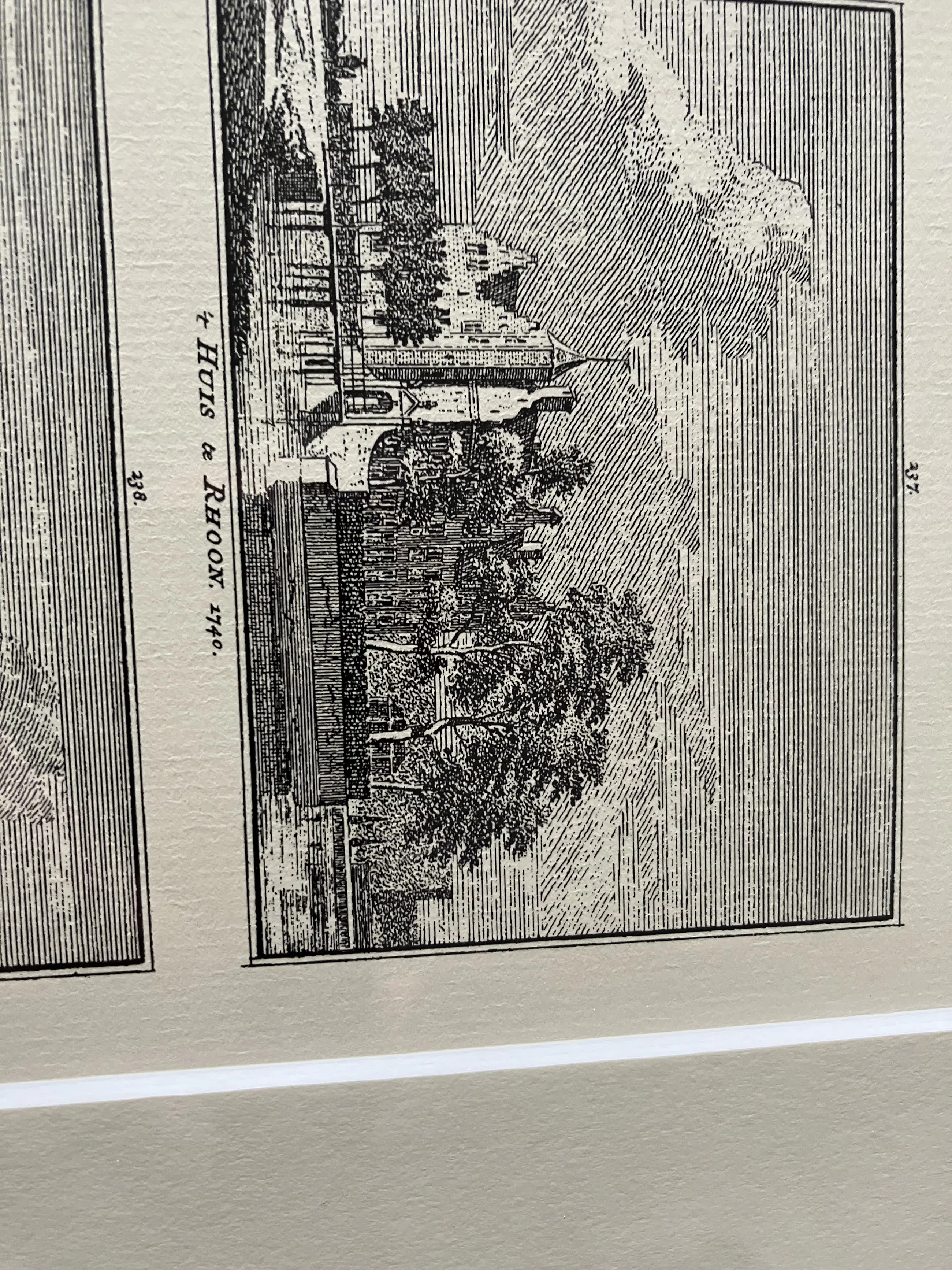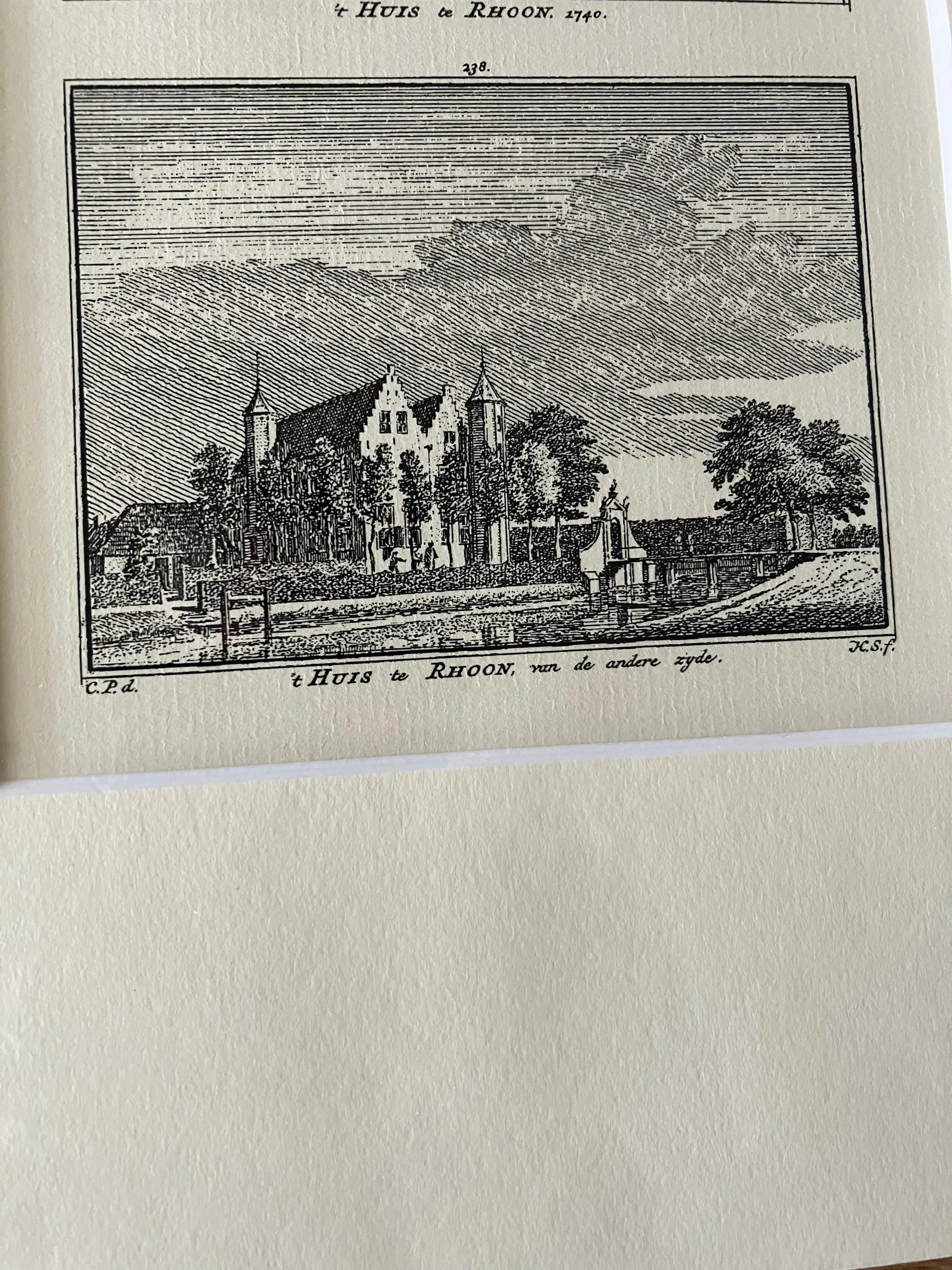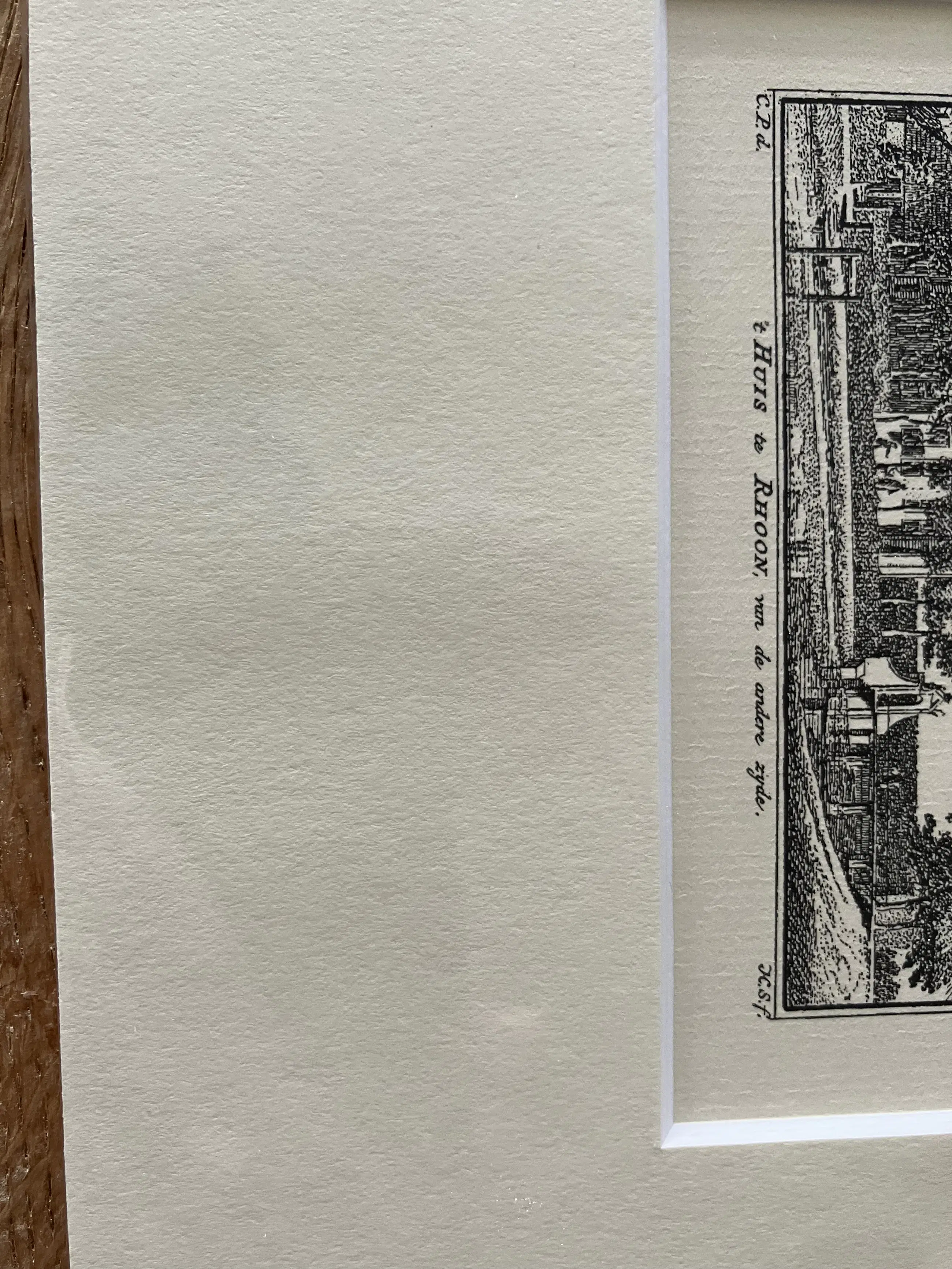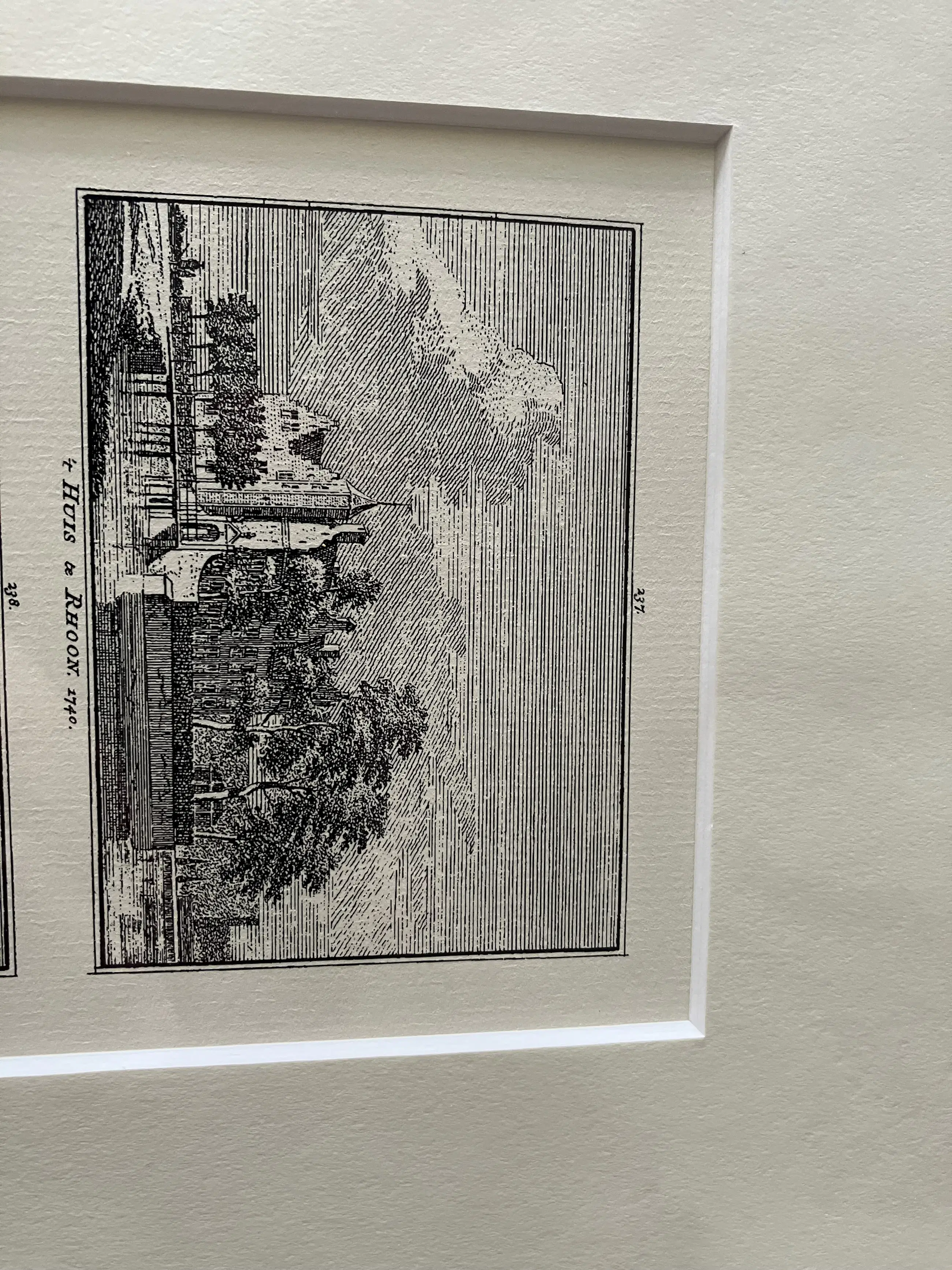 Een gravure van het kasteel van Rhoon, twee antieke prenten van het kasteel van Rhoon in Zuid - Holland, zoals het er in 1740 uitzag. Gravure gemaakt door Hendrik Spilman (1721 - 1784) en Jan de Beijer (1703 - 1780). Passe partout in goede staat, papier en vermoedelijk hout als ondergrond.