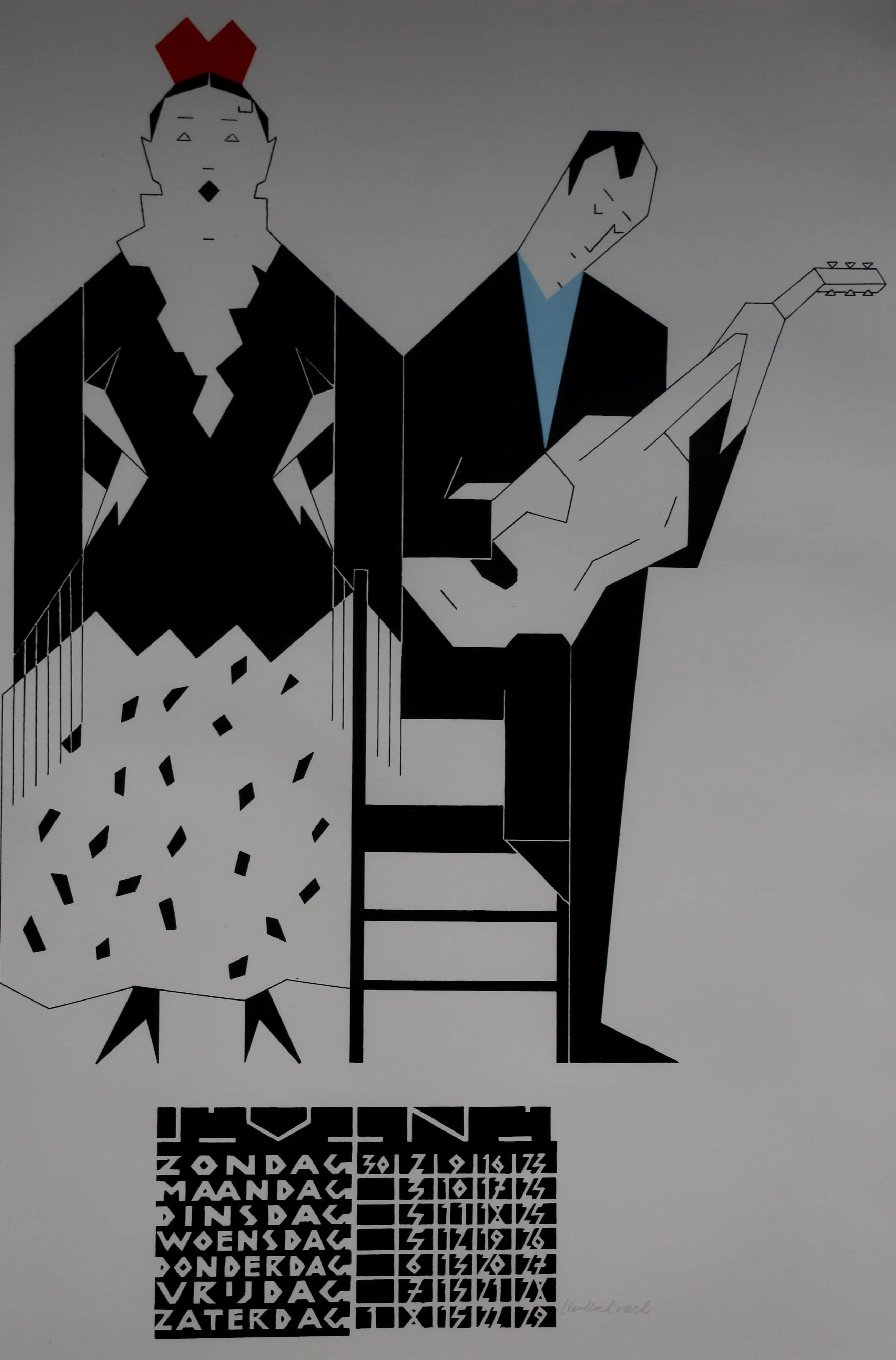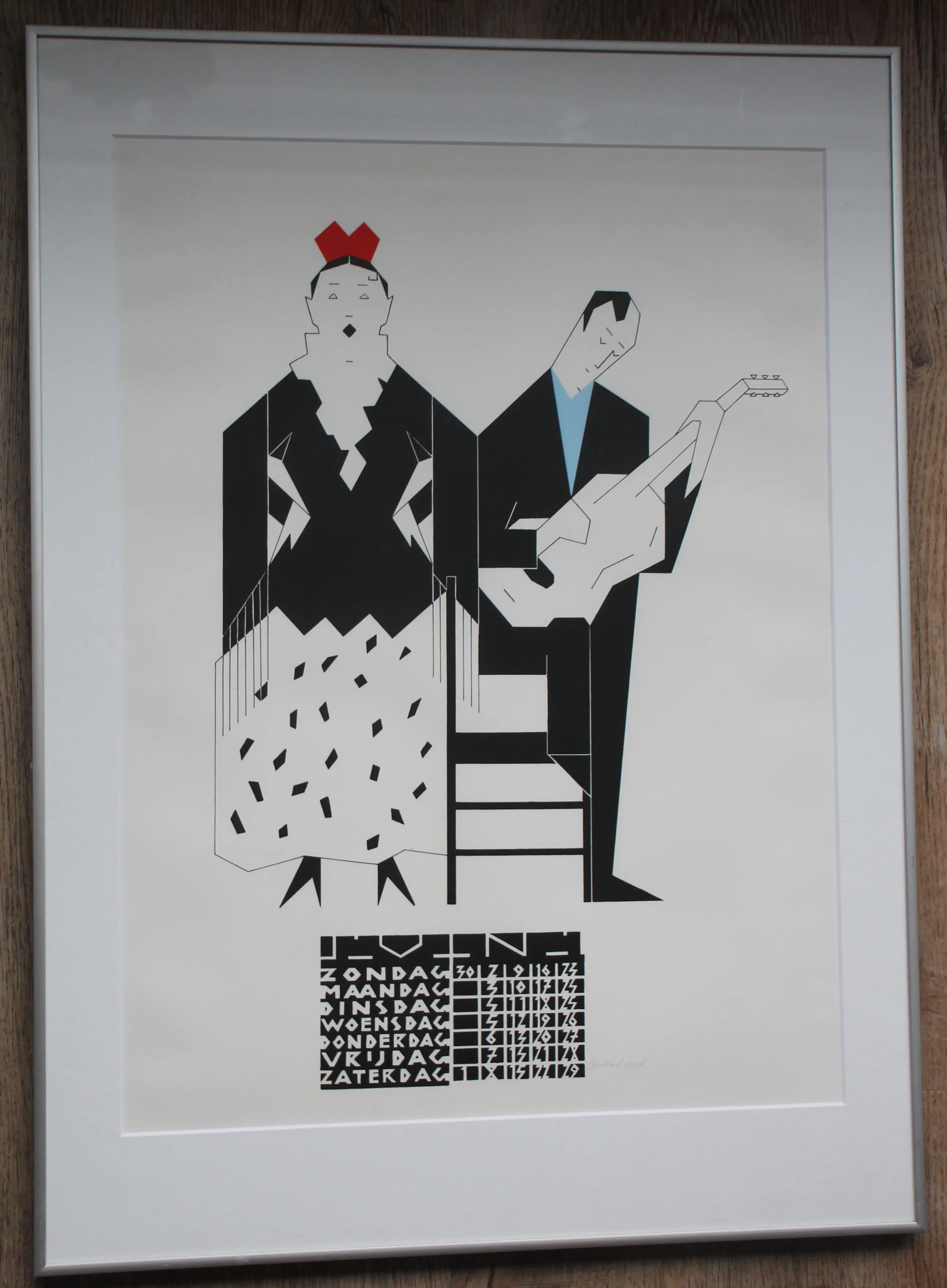 Ingelijste litho van Hendrik Valk. Titel: "Vrouwelijke flamenco danseres en gitarist".