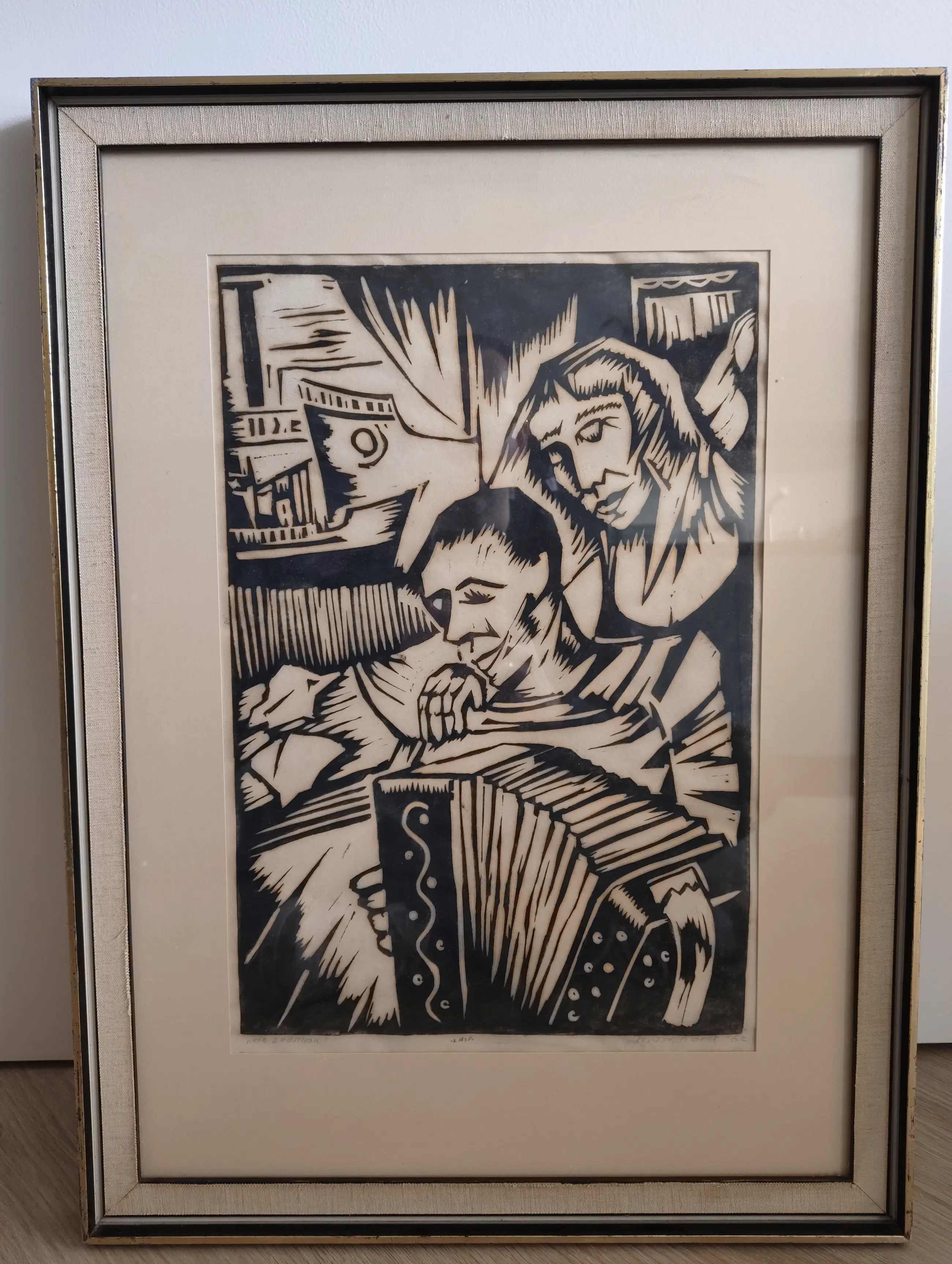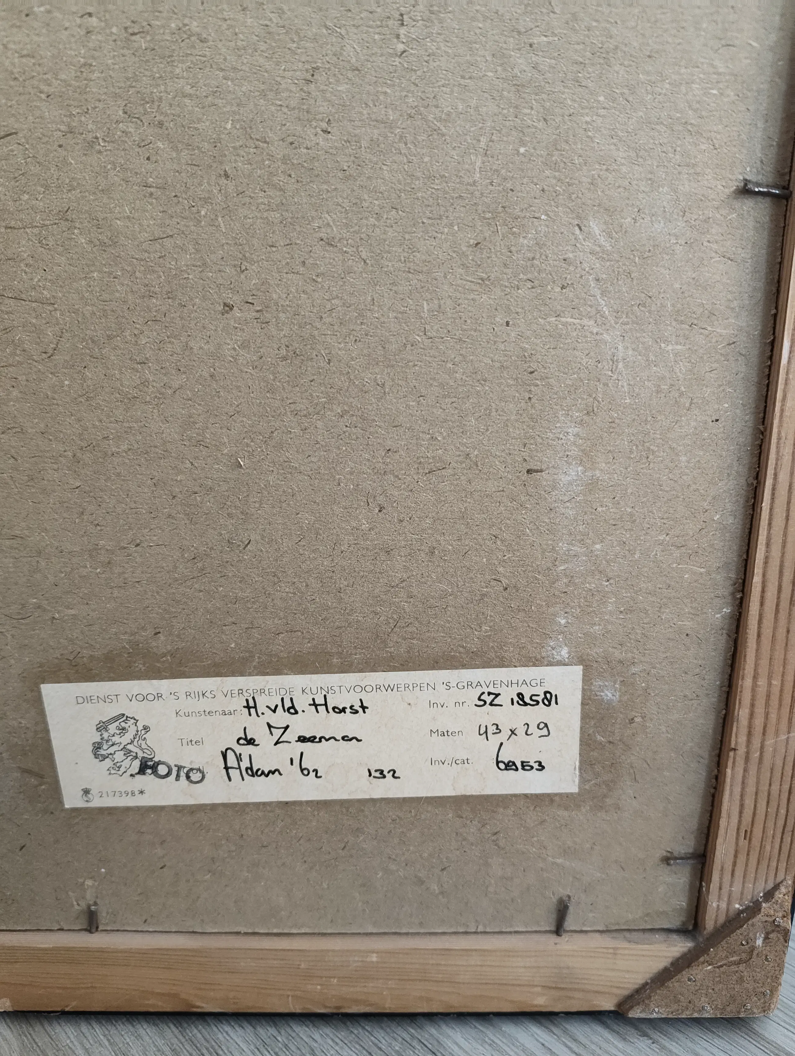 Een Grote linosnede uit 1962 van Henk van der Horst getiteld ''De zeeman''. Van der Horst had als specialiteit de linoleumsnede, hij werd wel ''meester linosnijder'' genoemd. Een grafische vakman pur sang. Dat bewijst deze linosnede ten overvloede: simpel en treffend neergezet, goede compositie en heldere zwart-wit contrasten. Dit bijzondere kunstwerk komt uit de collectie van de Dienst voor 's rijksverspreide kunstvoorwerpen 's Gravenhage (SZ 18581). Voorzien van een buitengewoon mooie lijst.