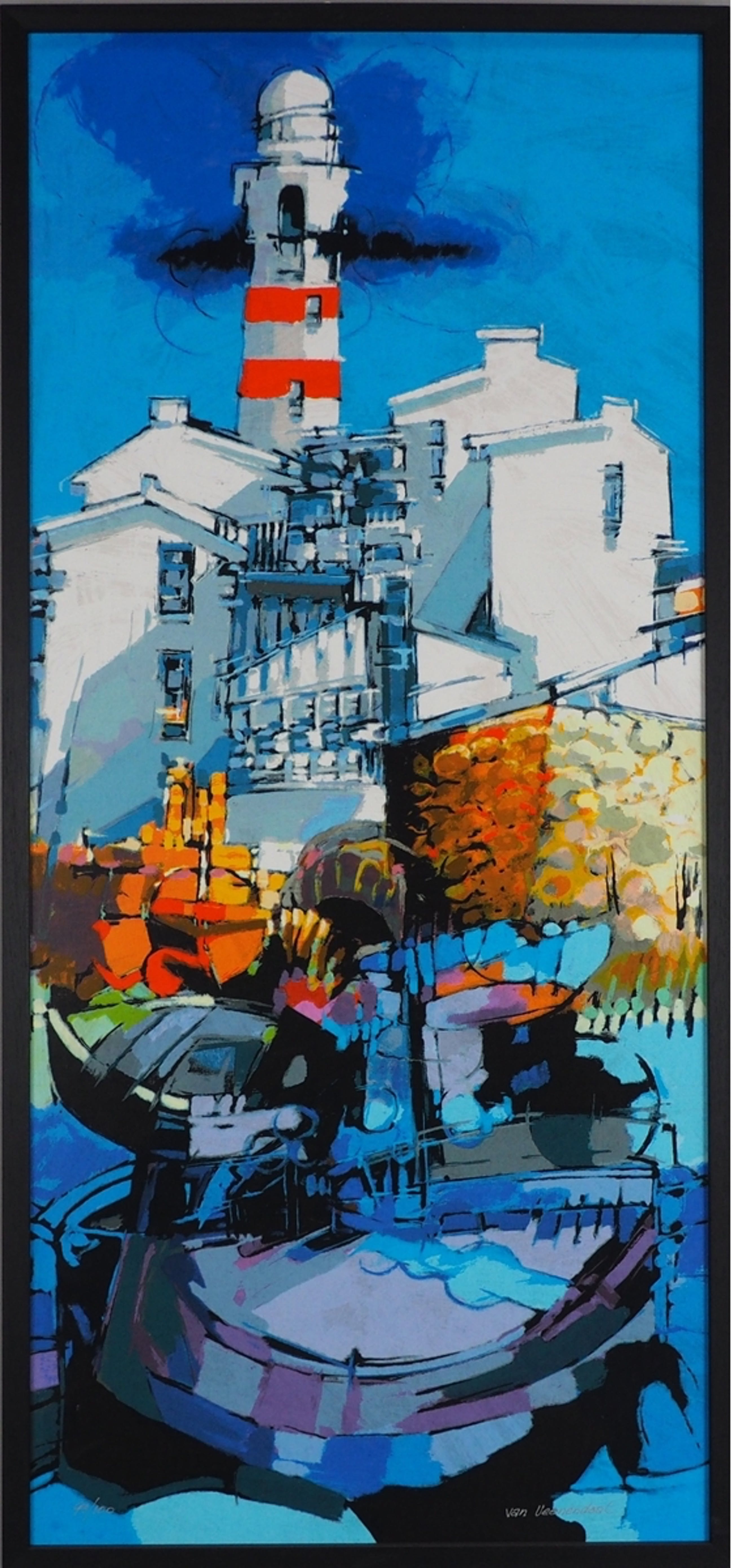Zeefdruk op paneel. In zwart houten lijst. Op achterzijde CV van de kunstenaar