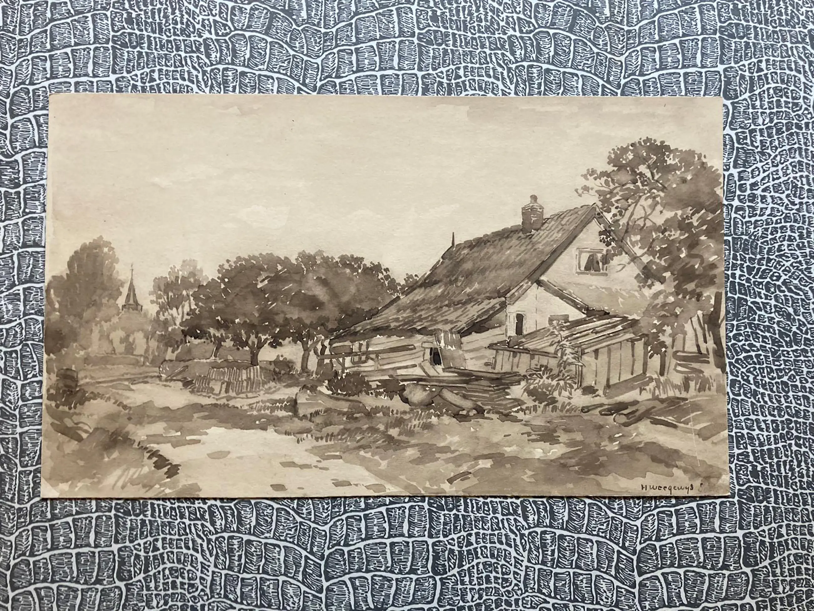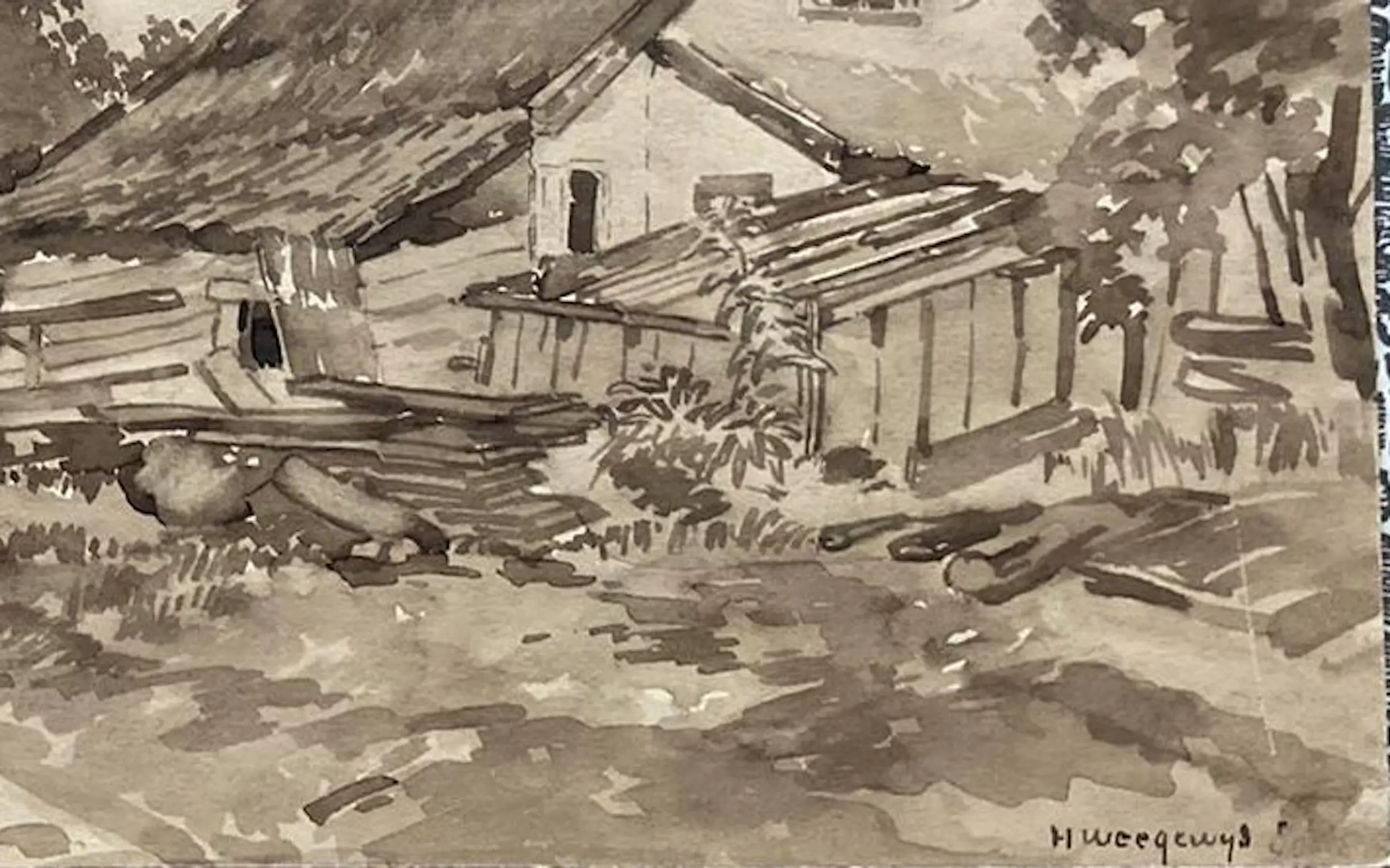 Sepia aquarel van de kunstenaar Hendrik Weegewijs. Werk van hem hangt in het Singer Museum Laren. Pieter Scheen Lexincon.