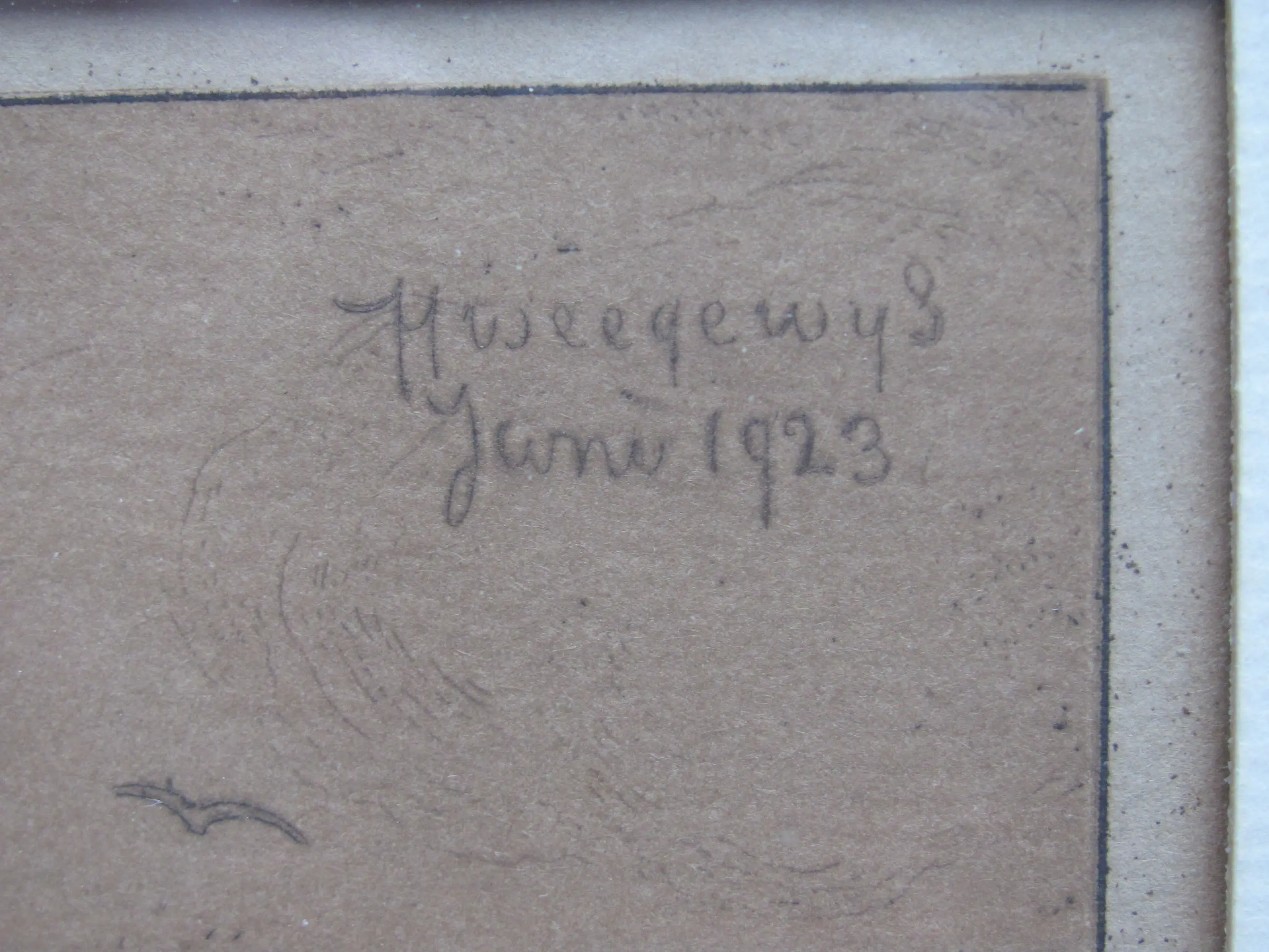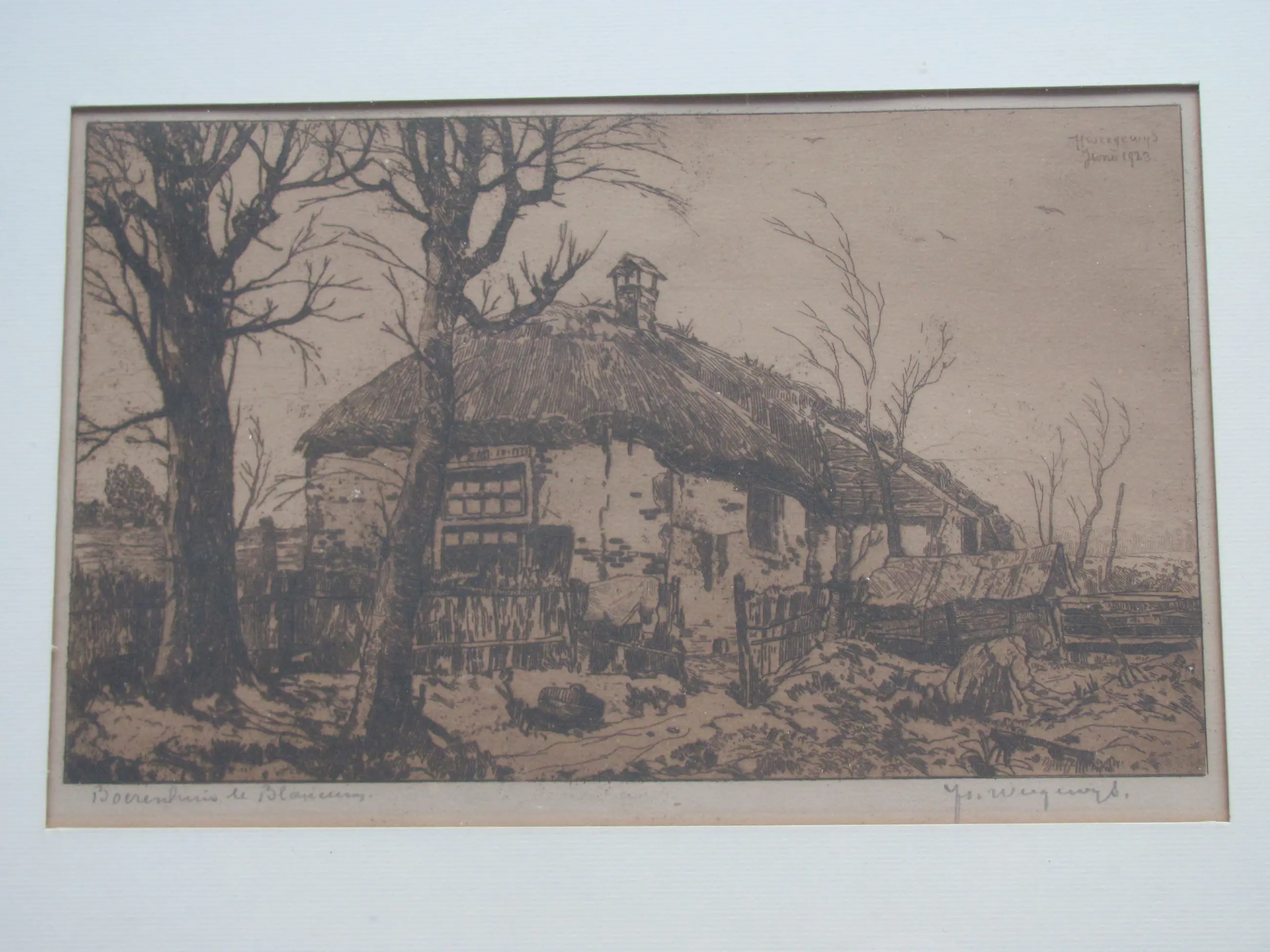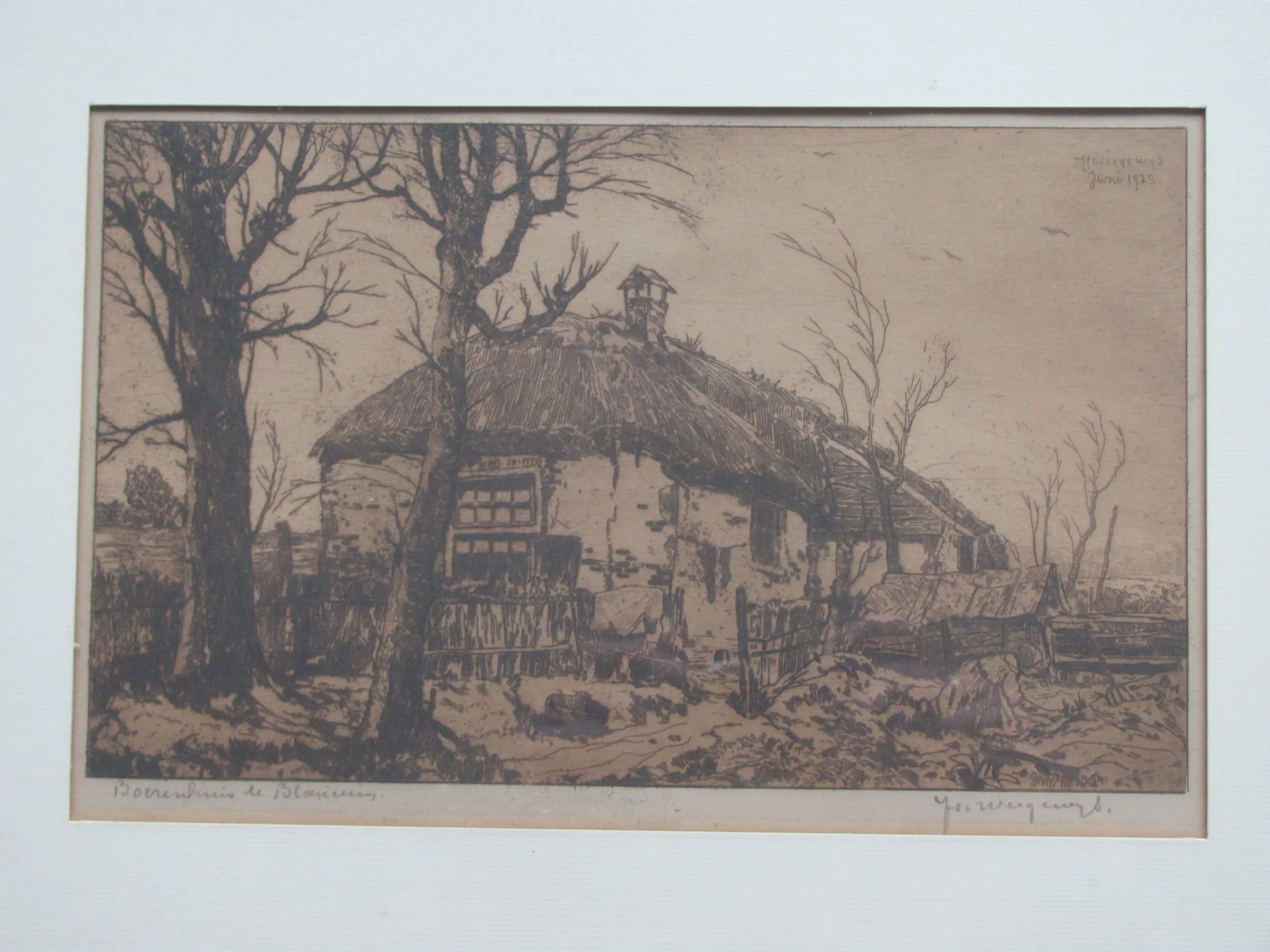 Ets van Hendrik Weegewijs uit 1923. Linksonder met potlood: Boerenhuis te Blaricum Rechtsonder met potlood gesigneerd. Rechtsboven in de plaat gesigneerd en gedateerd. (juni 1923)