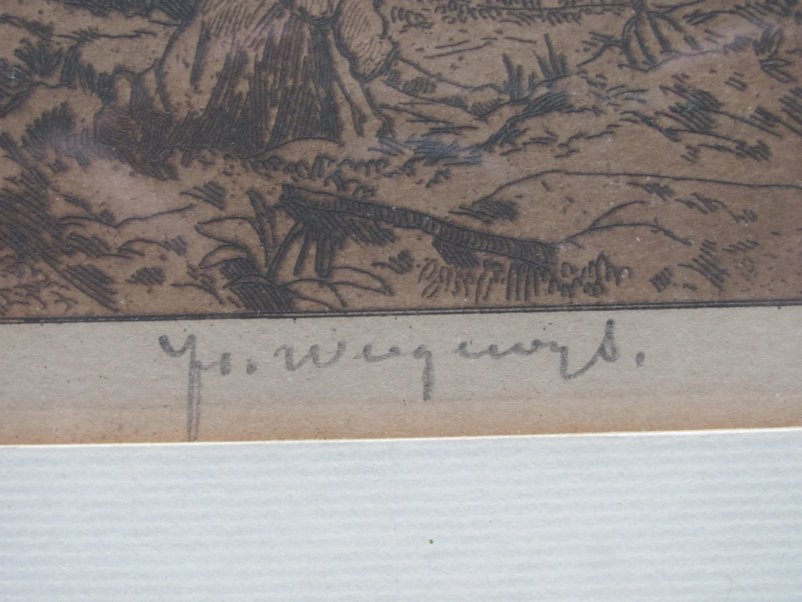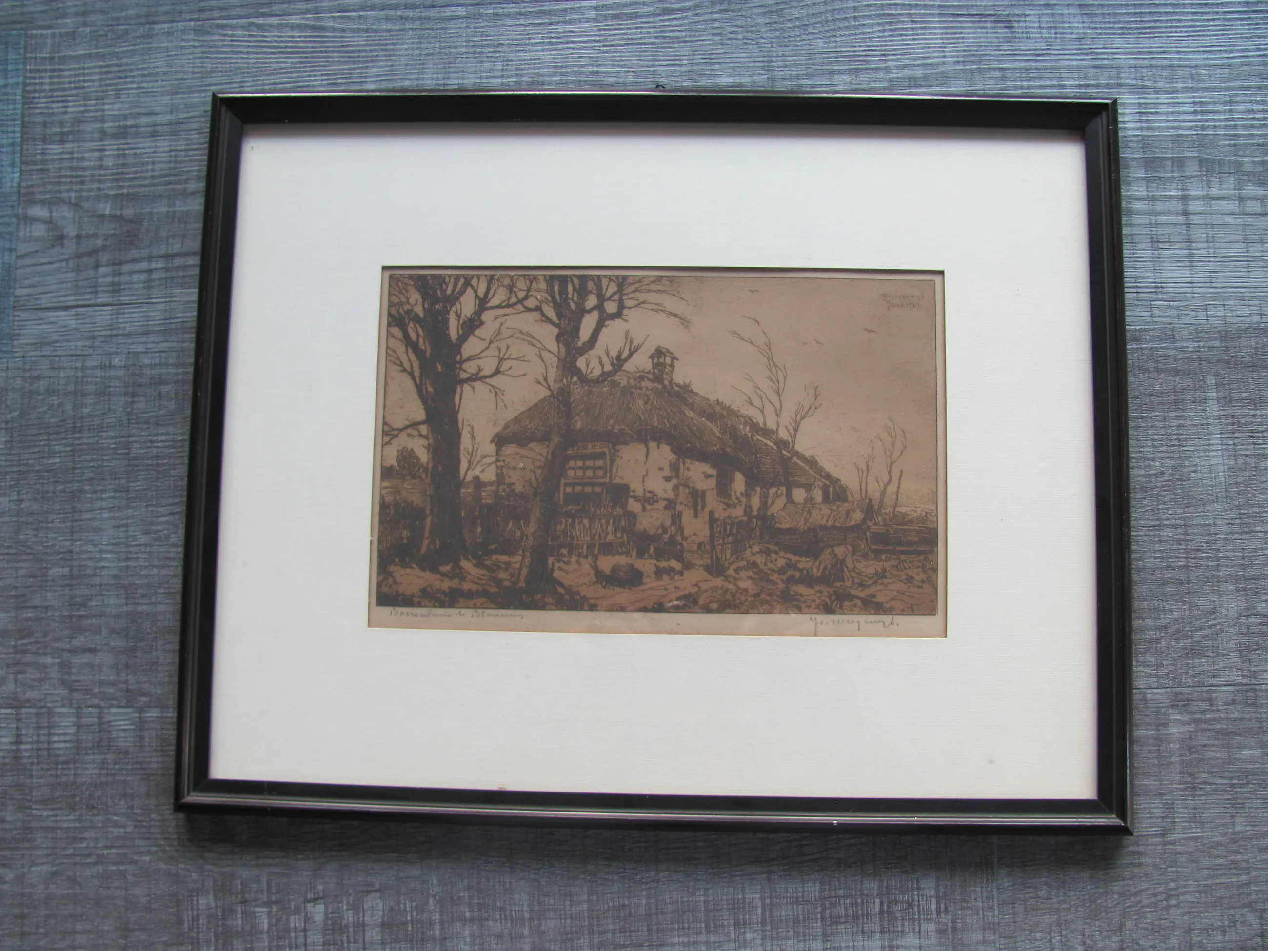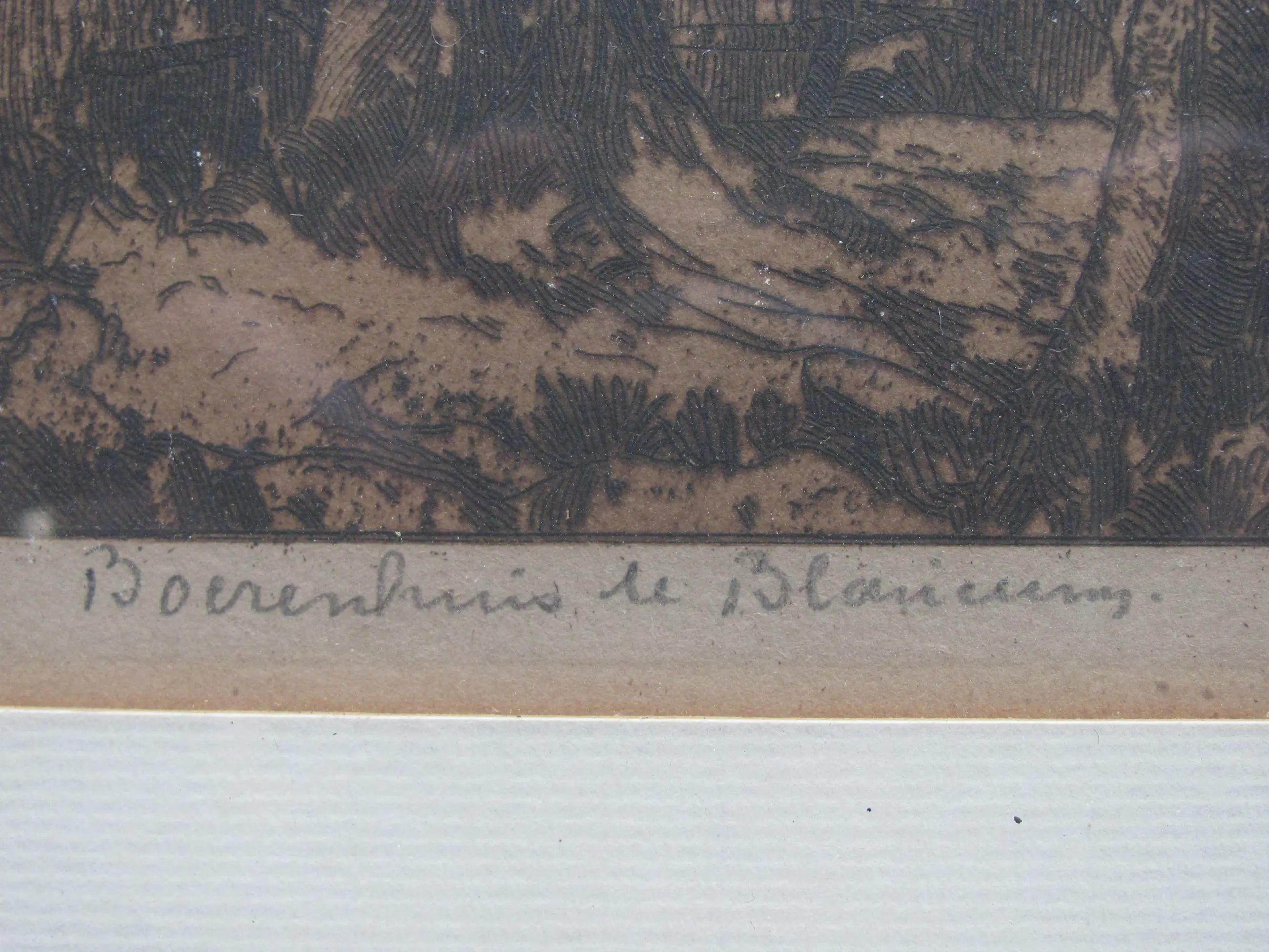 Ets van Hendrik Weegewijs uit 1923. Linksonder met potlood: Boerenhuis te Blaricum Rechtsonder met potlood gesigneerd. Rechtsboven in de plaat gesigneerd en gedateerd. (juni 1923)