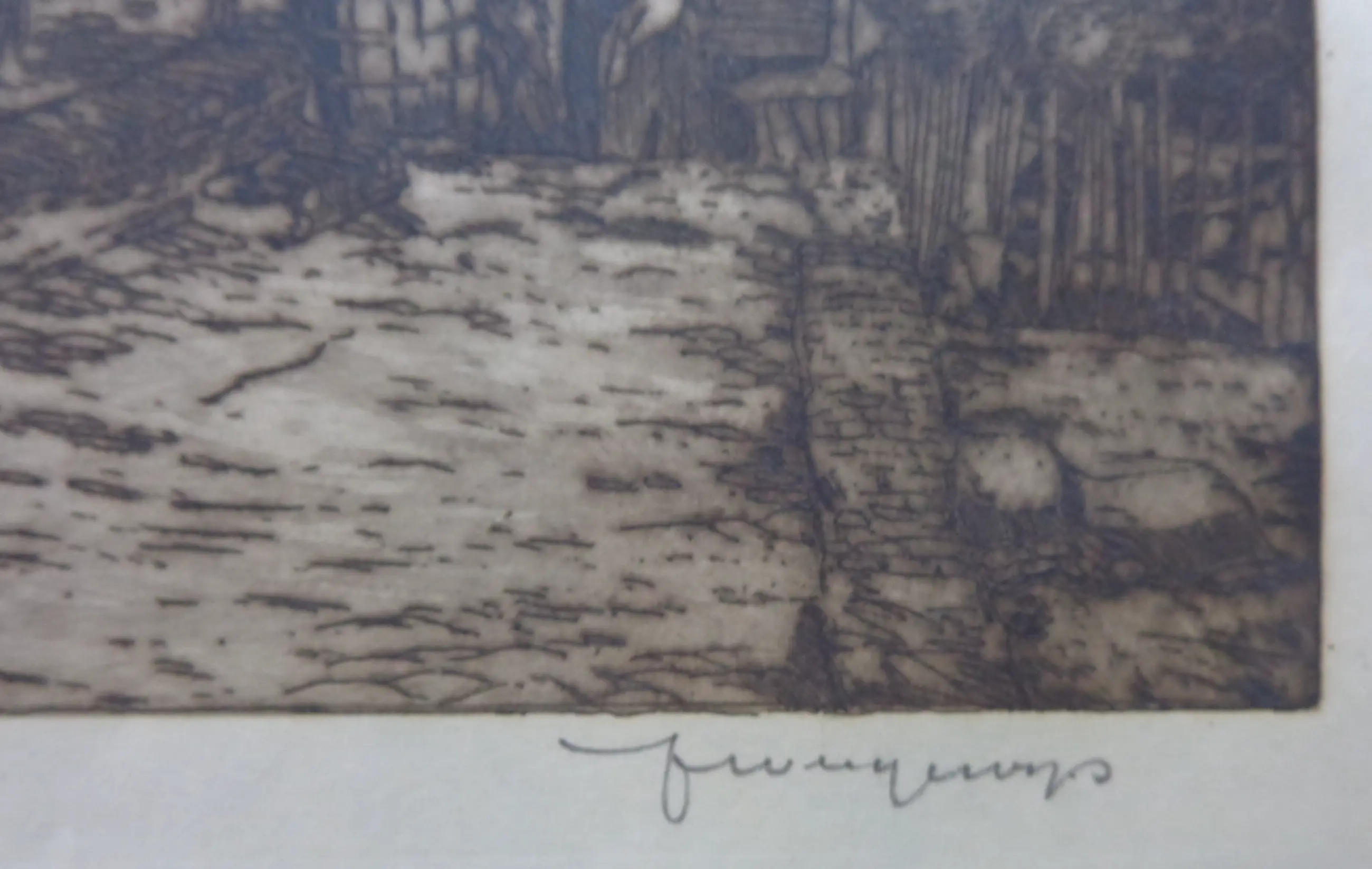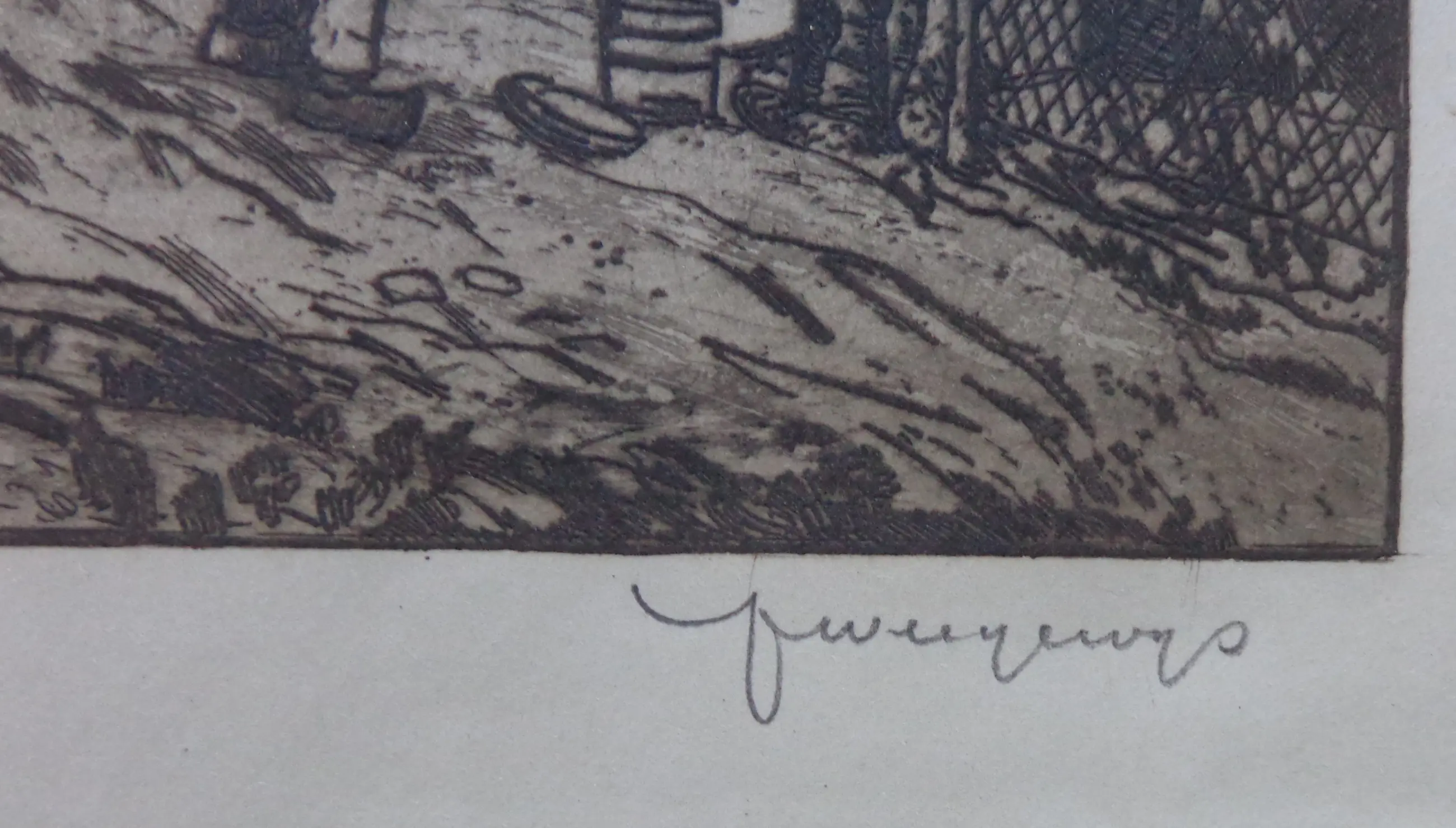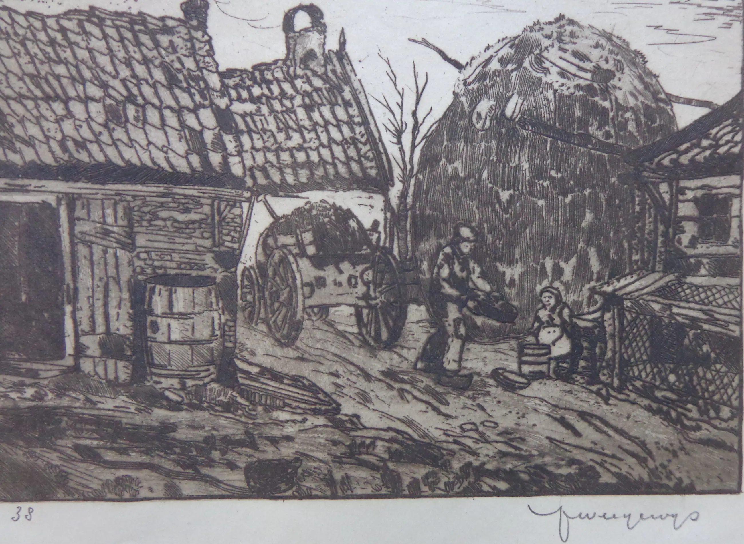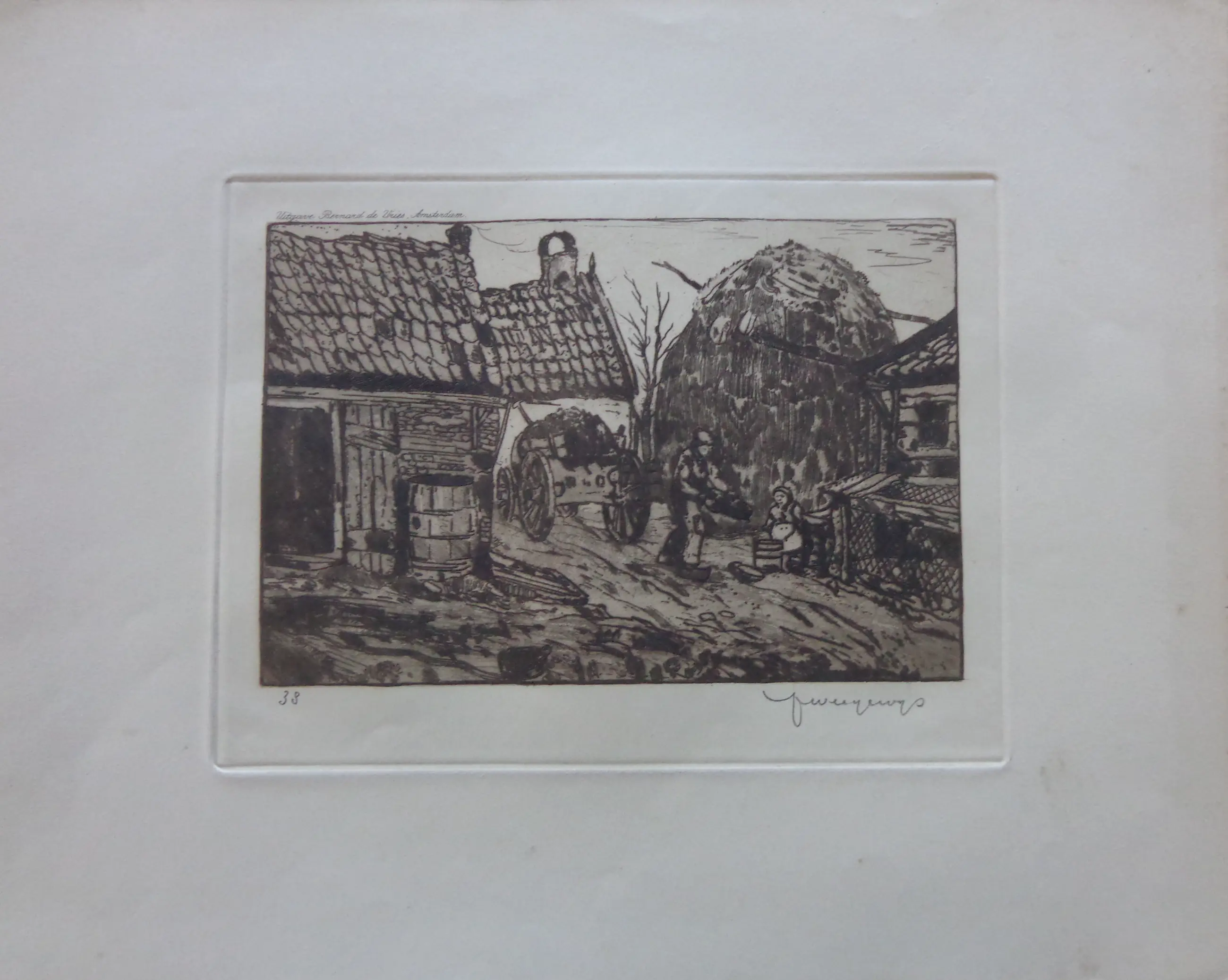 Hendrik Weegewijs (1875-1964). Lot van 2 werken. Scènes op de boerderij. 2x Zwart-wit ets op papier. 2x Gesigneerd met potlood. Ex.nr. 30/150 + 38 (?). "Uitgave Bernard De Vries, Amsterdam". Blad: 25x33cm + 25x31cm. Goede staat.