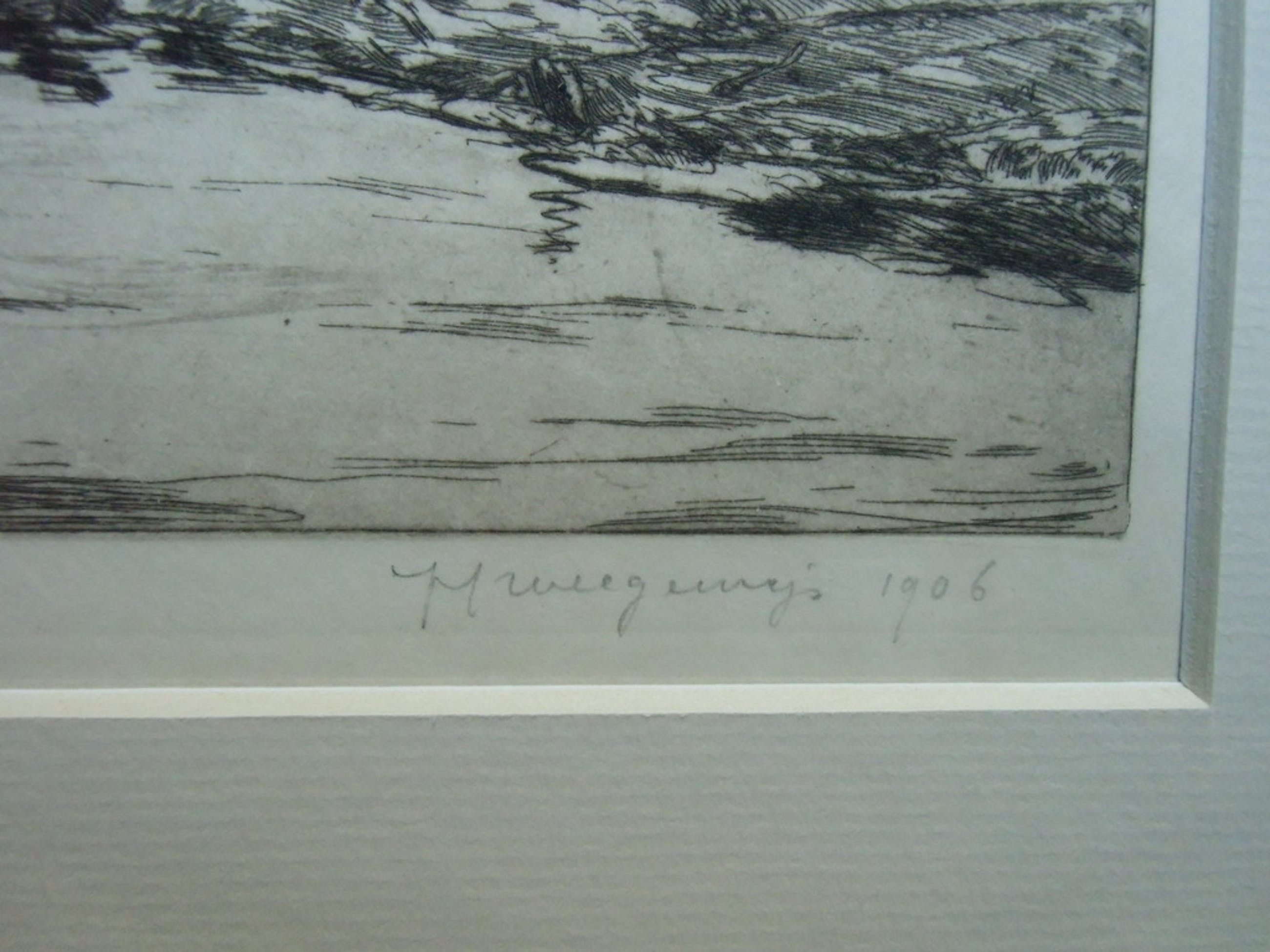 Deze ets van Hendrik Weegewijs ( 1875-1964) met een schilderachtige weergave van een waterlandschap met boerenkar en aangemeerde boot, heeft in de benedenmarge een blindstempel van P.J.Zürcher in Den Haag.