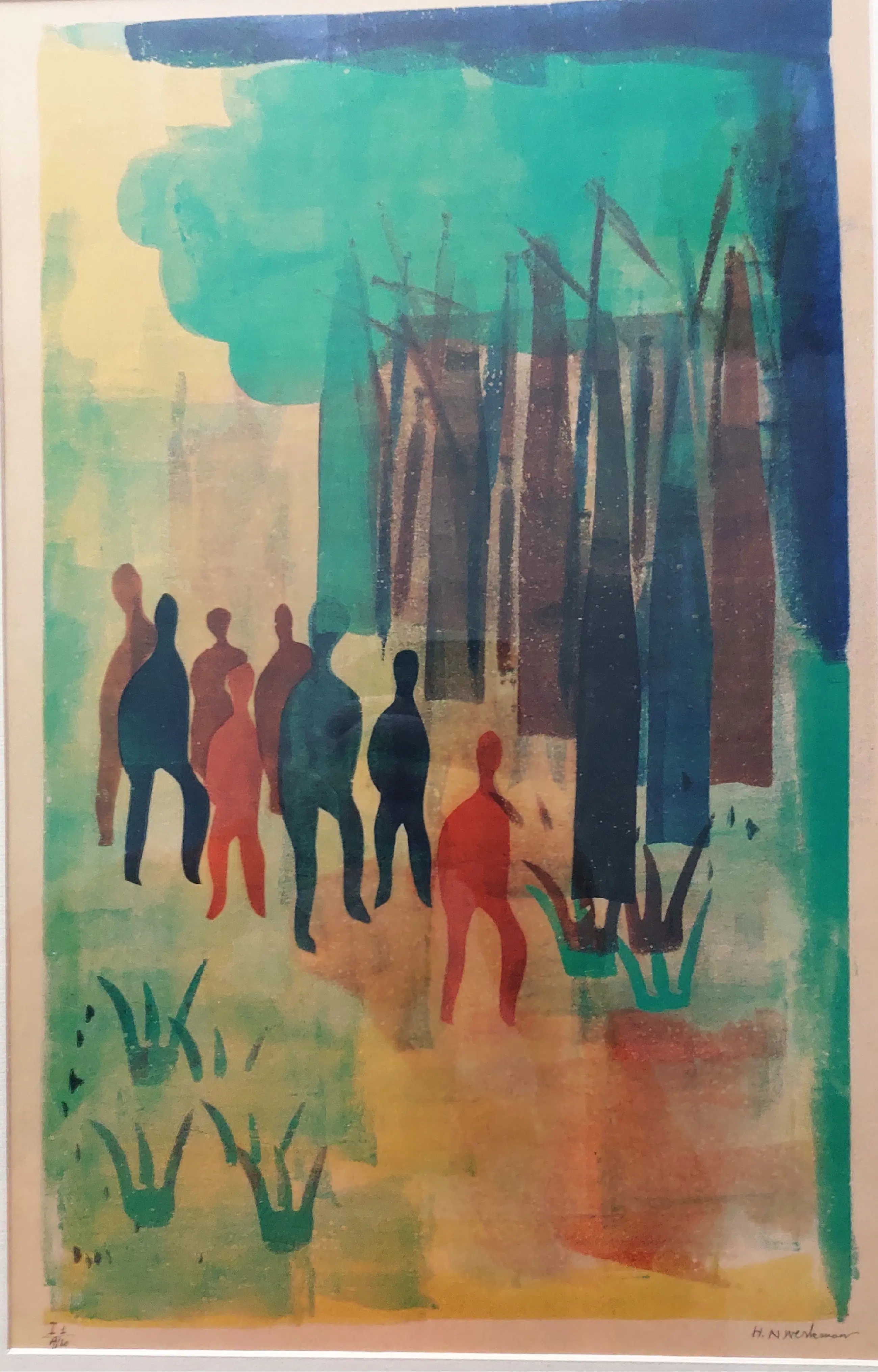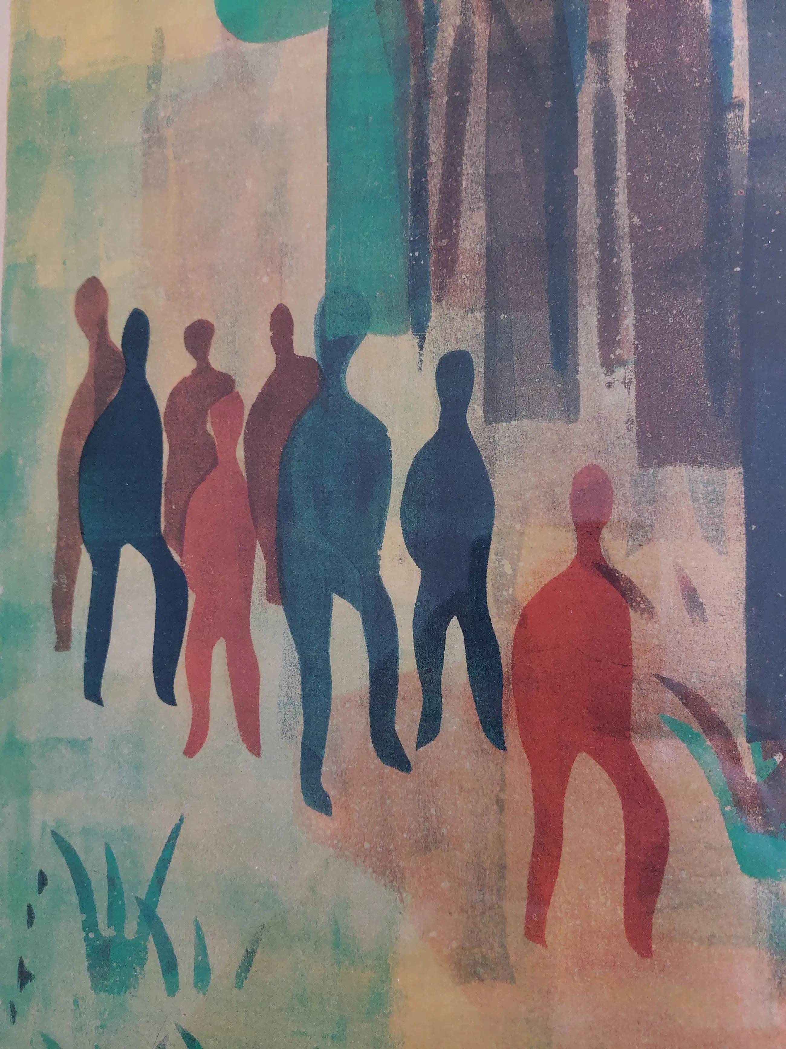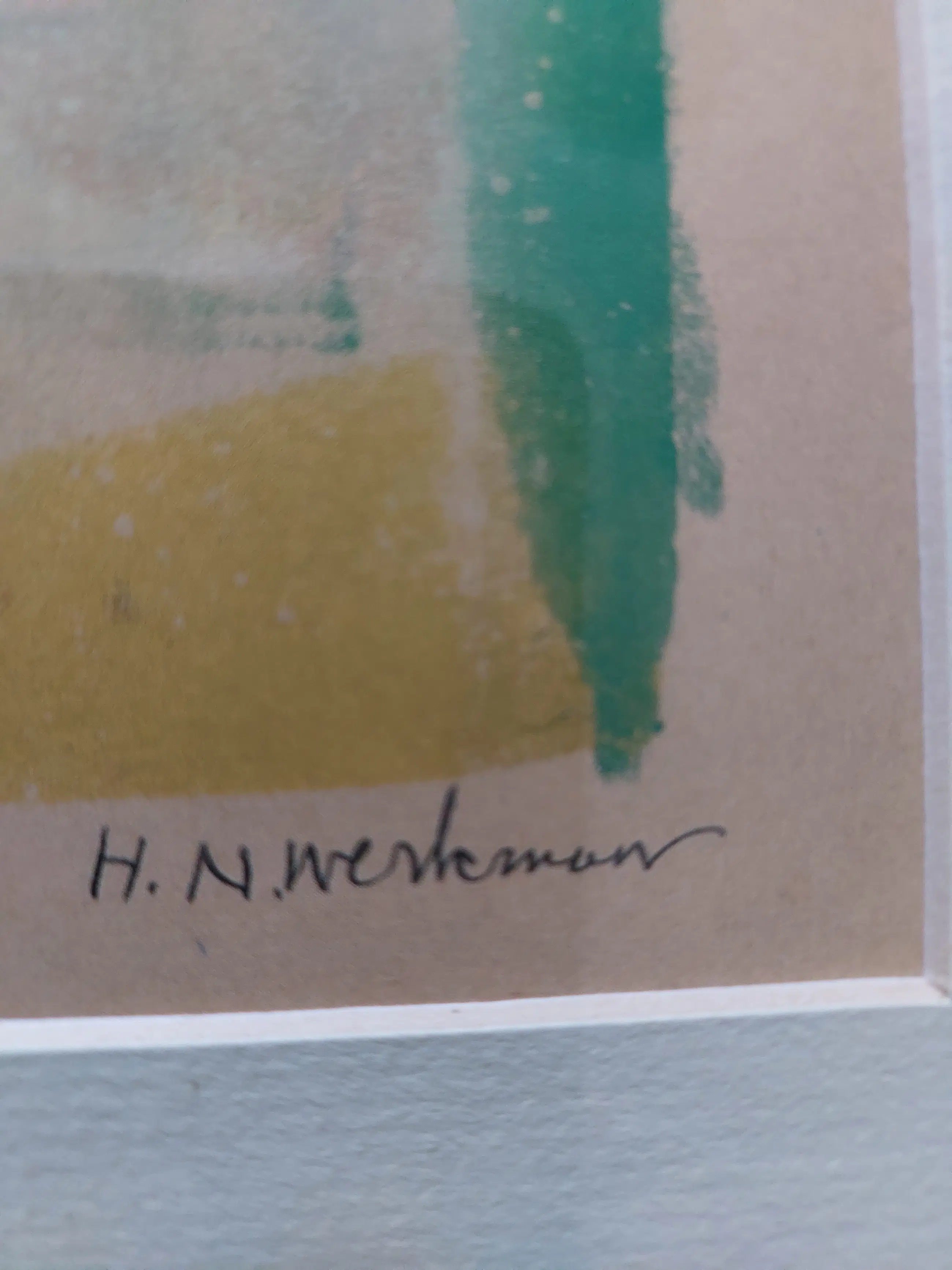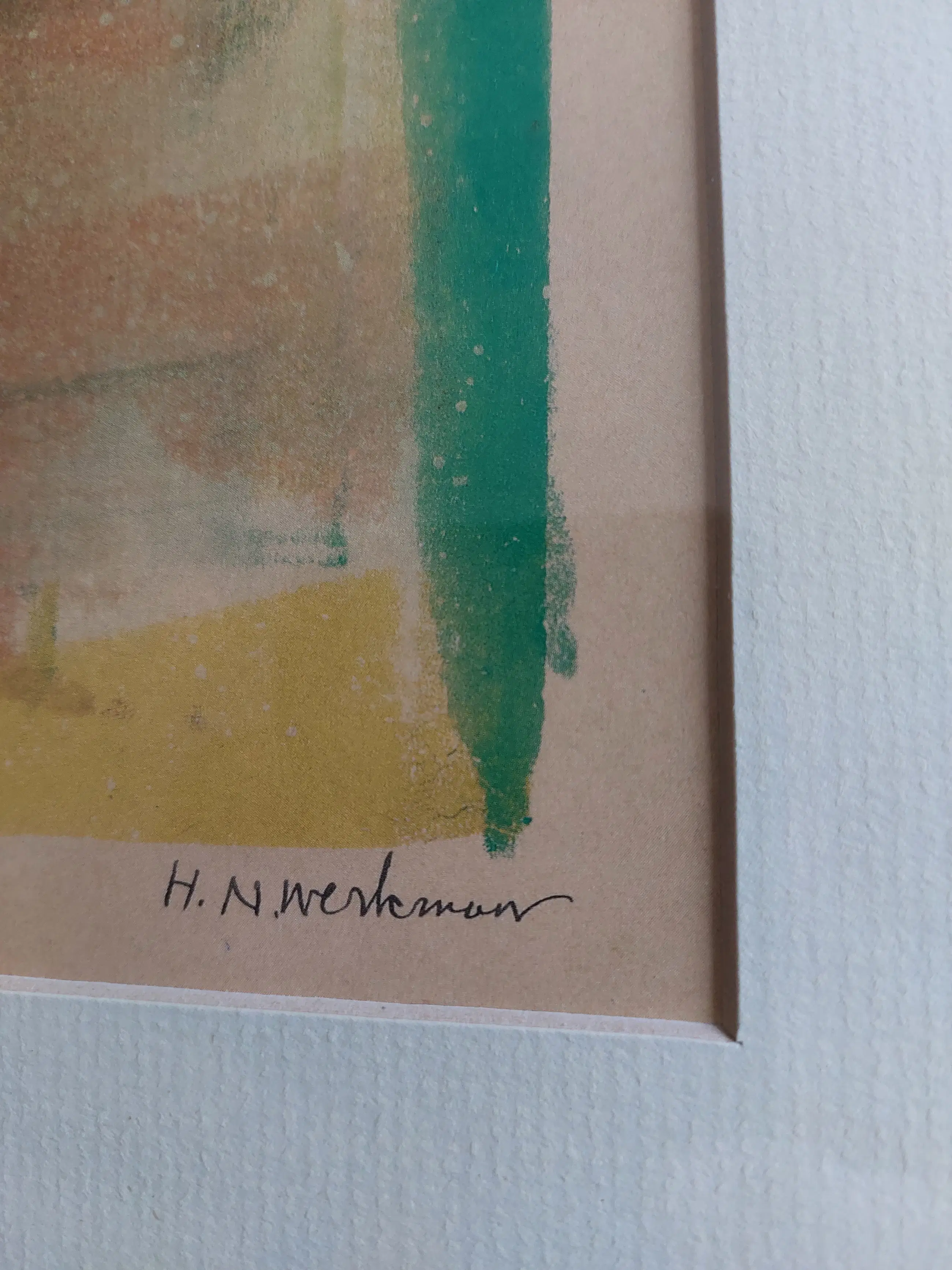 Dit is een prent van de litho met de titel "Gedwongen terugkeer " is rechtsonder gesigneerd "H.N. Werkman" en linksonder genummerd "I4 5/20". De afmeting van het werk zelf is 50 x 30 cm.