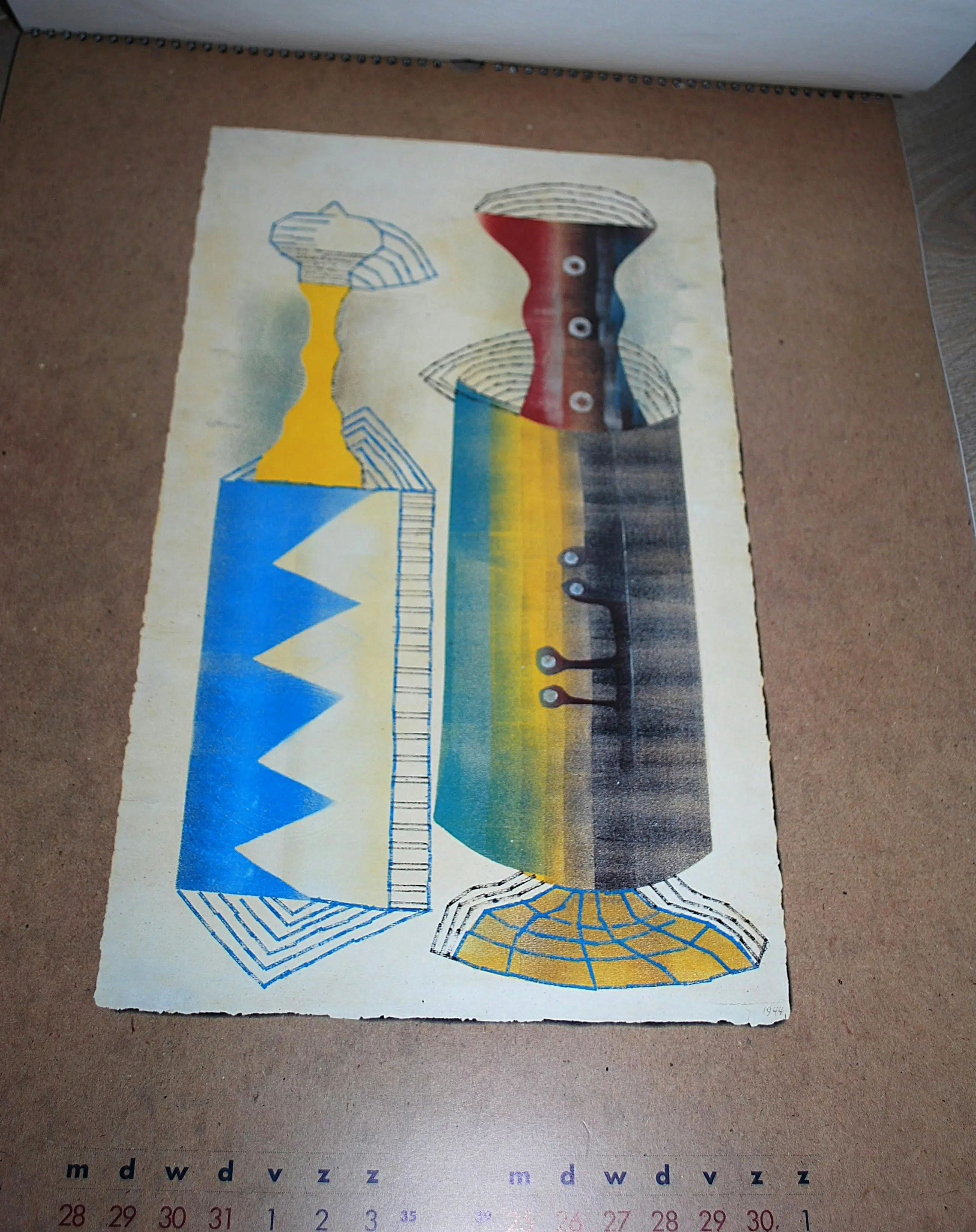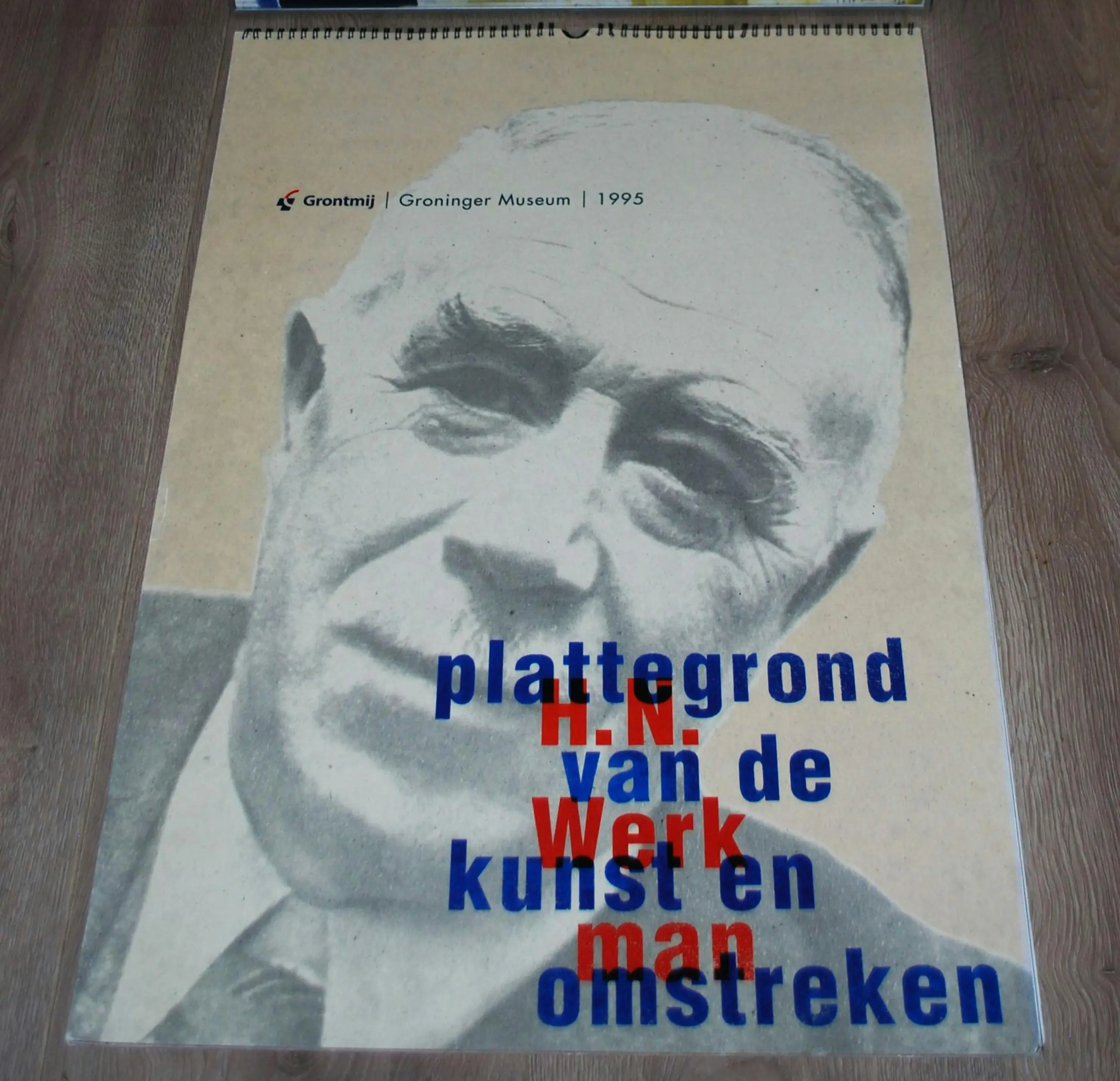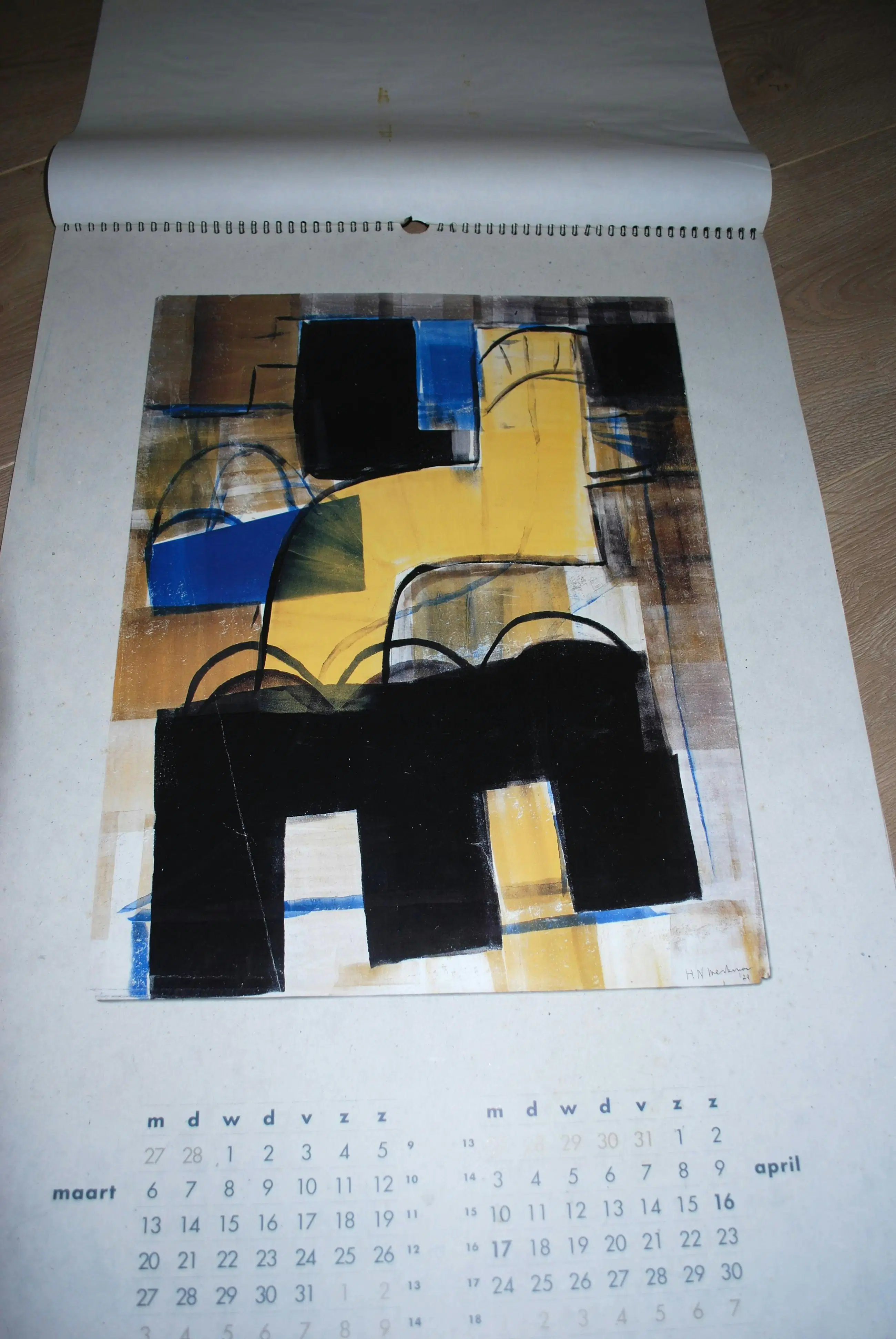 Fors formaat kalender, met 6 reproducties op zeer stevig papier, met 6 tussenbladen (licht kreukelig) met uitspraken van Werkman. In prima, gebruikte staat. Compleet.