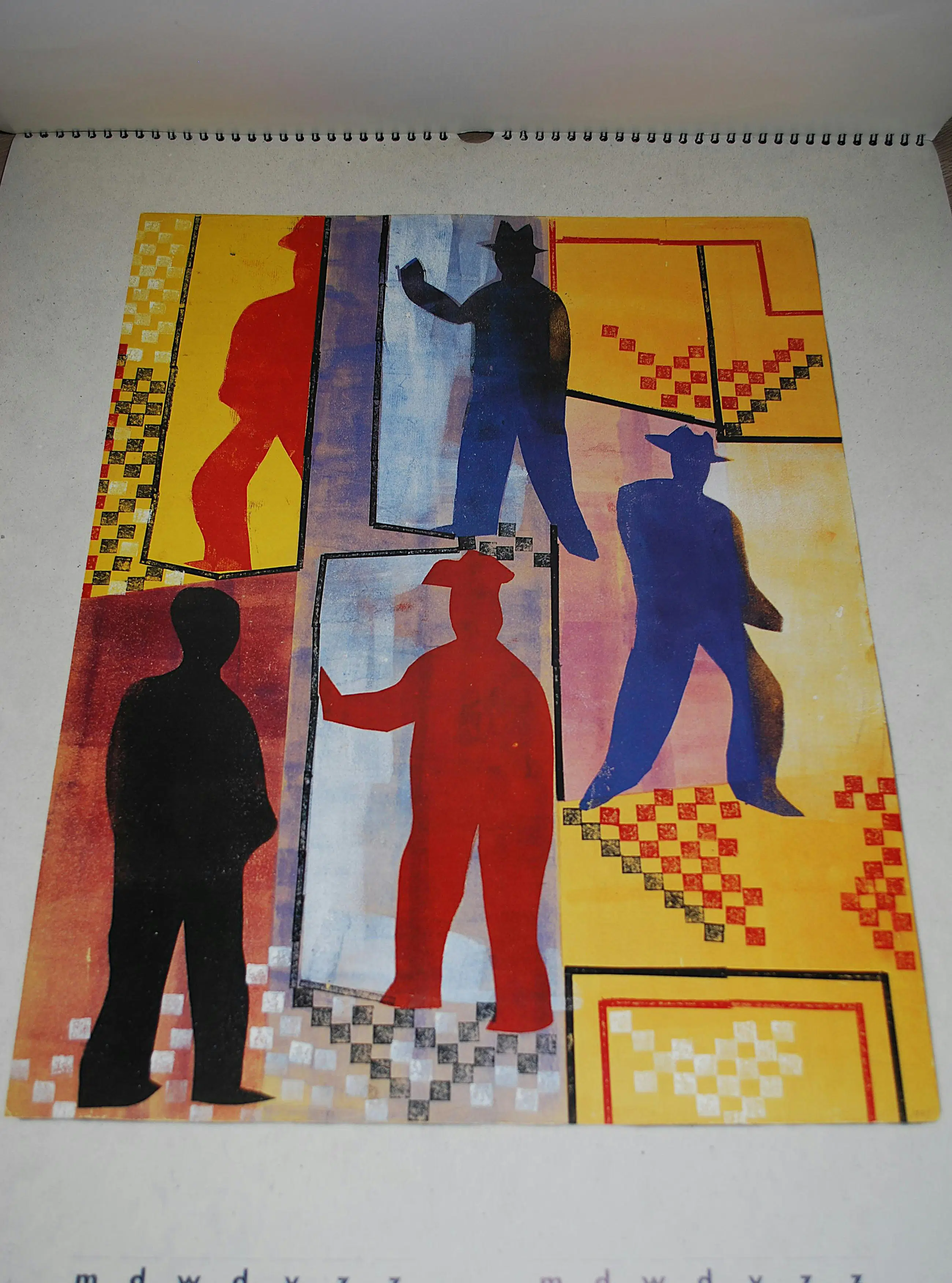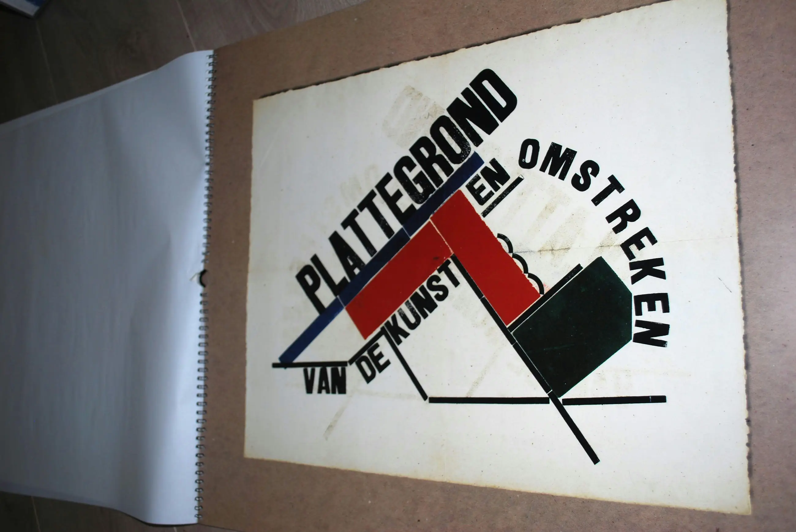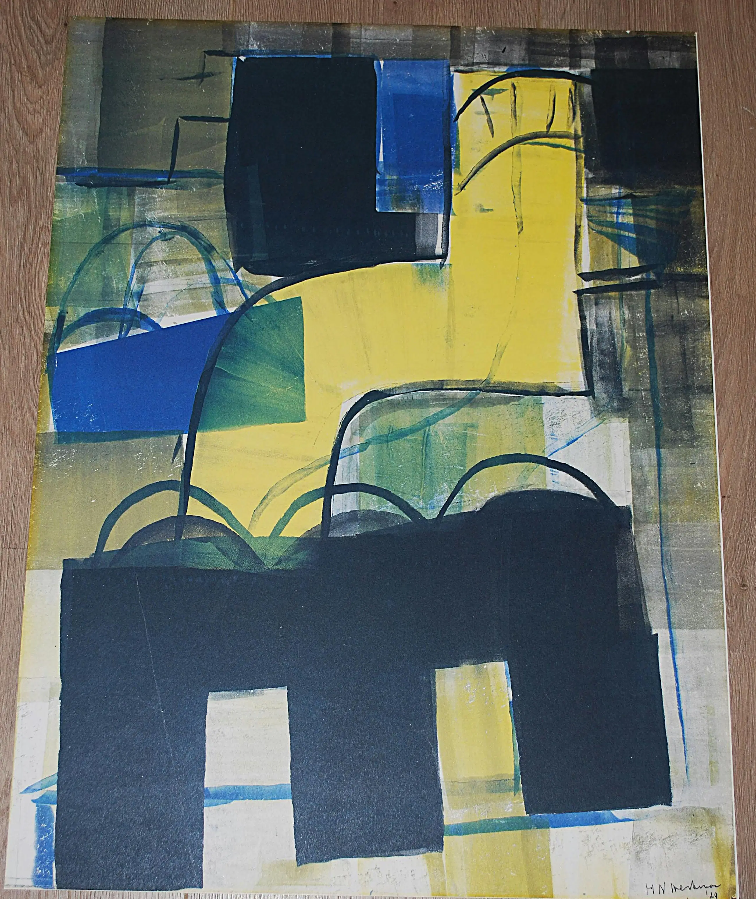 Fors formaat kalender, met 6 reproducties op zeer stevig papier, met 6 tussenbladen (licht kreukelig) met uitspraken van Werkman. In prima, gebruikte staat. Compleet.