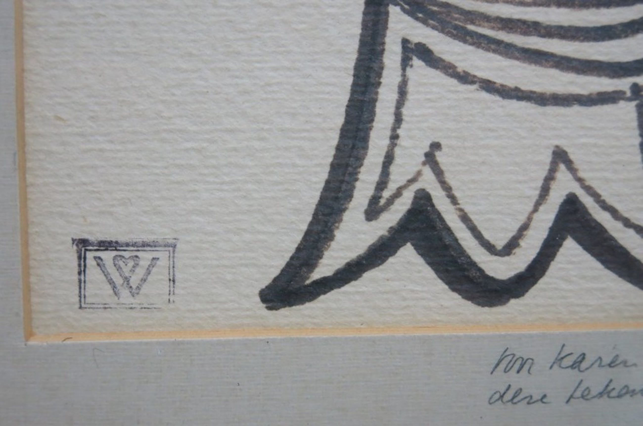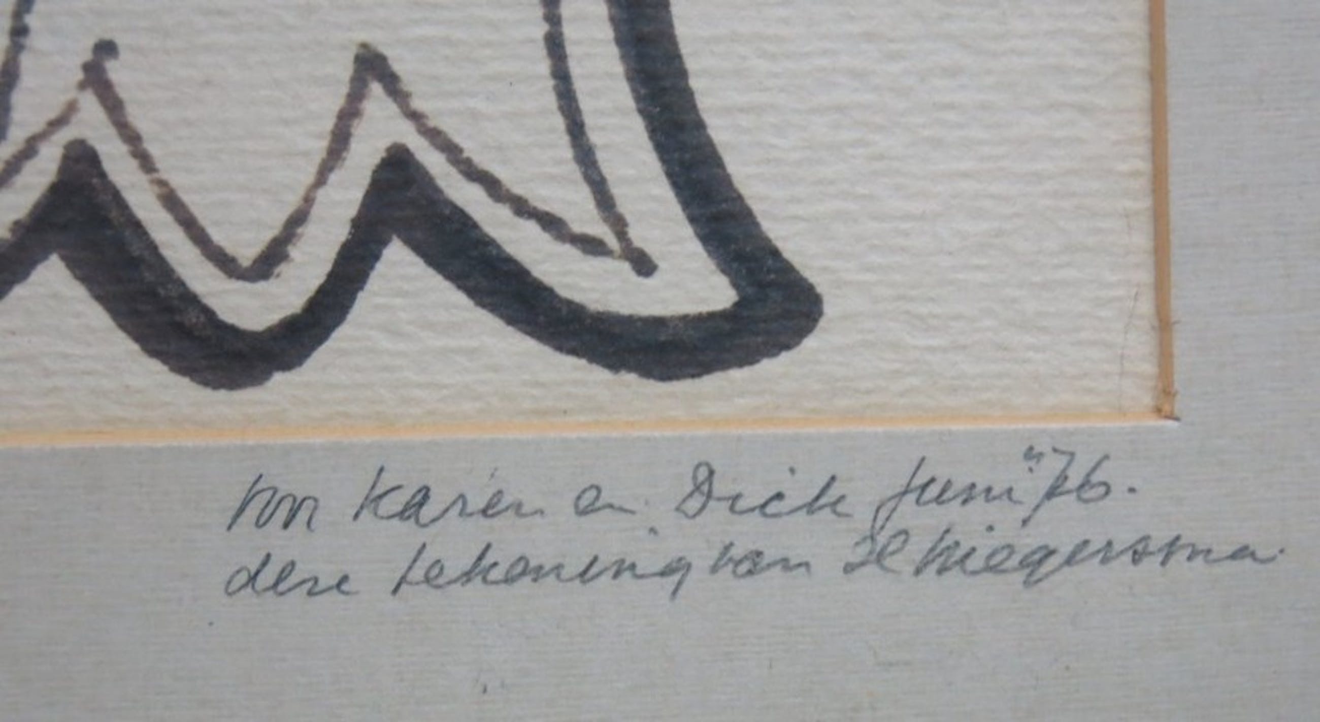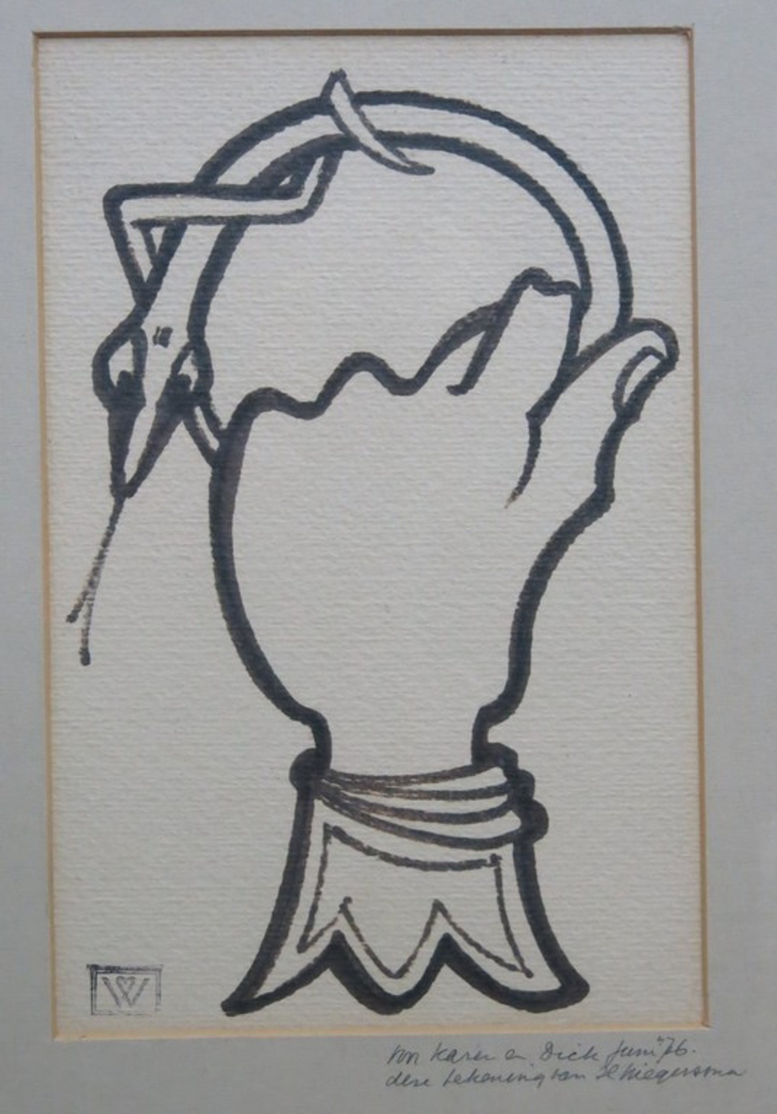 Simpele maar doeltreffende inkttekening met een annotatie op het passe- partout: ‘Voor Karen en Dick, juni 1976. Deze tekening van H. Wiegersma.’ Tevens is er een atelierstempel van Wiegersma te zien in de linker onderhoek van het werk. Het werk zelf is niet gesigneerd door de kunstenaar.