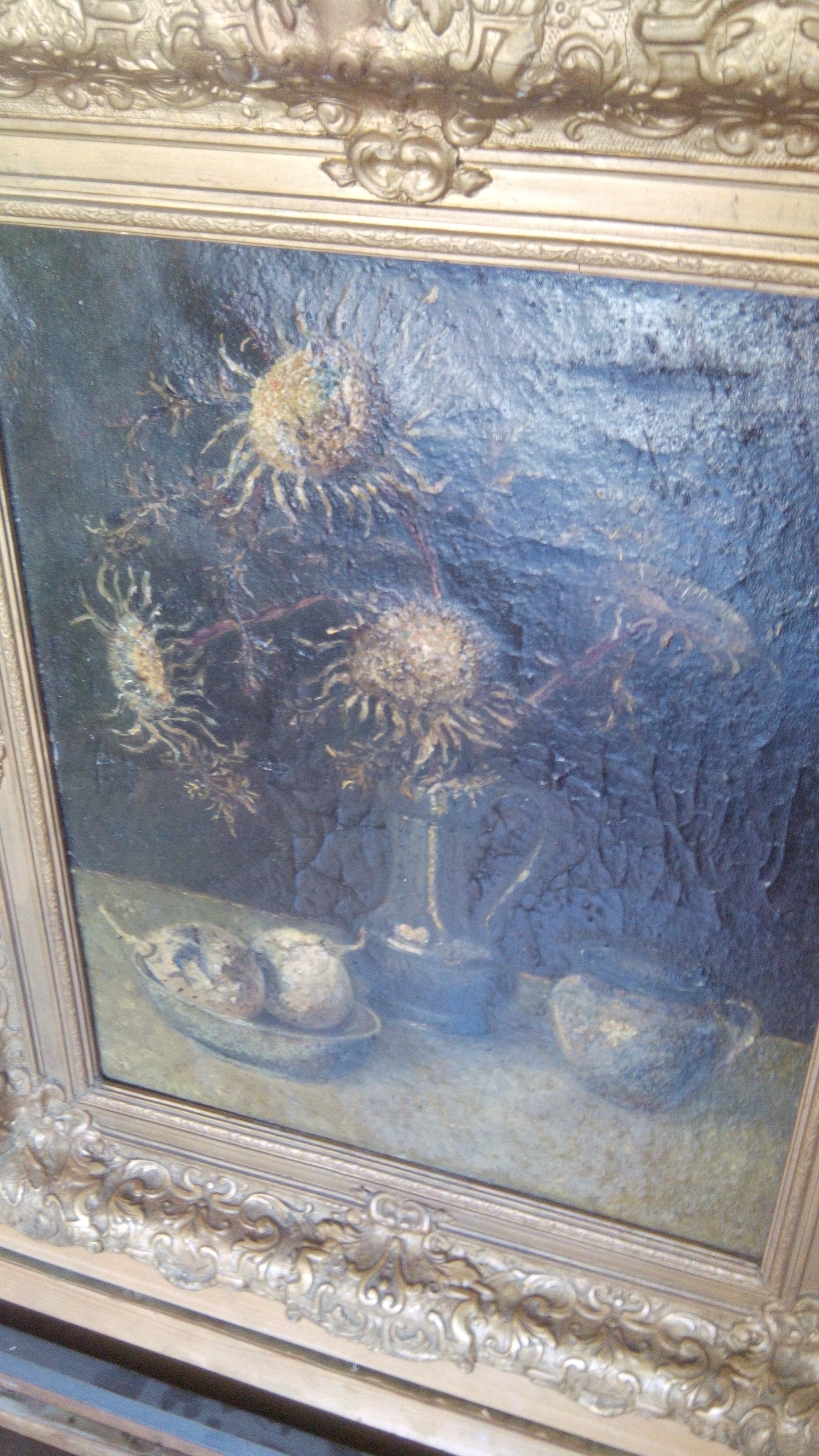 Een bloemstilleven van Hendrikus Alexander van Ingen.Het is een apart en groot schilderij want Van Ingen schilderde vooral andere genres.Het is de moeite waard dat het werk een restauratie krijgt.De lijst is in goede conditie, geen beschadigingen. Het is gesigneerd en achterop de lijst staat geschreven mevr Van Ingen.Er staat ook een stempel op :Joling Bouwman Broerenstraat 8 Arnhem.Dit was in de jaren 20-30 een winkel in borstelwaren en huishoudelijke artikelen, en lijstenmakerij.