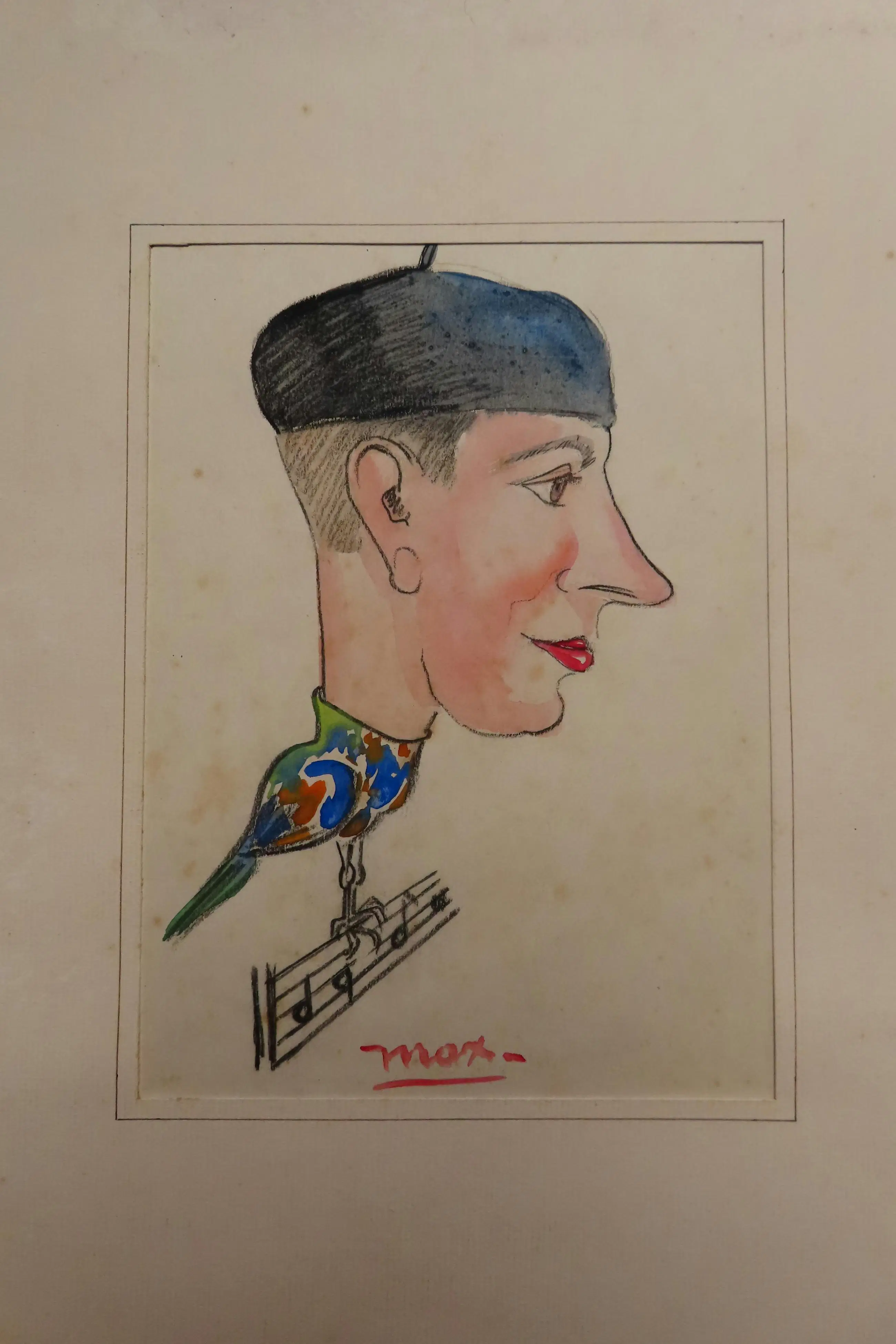 1) Titel: Max Techniek: Aquarel/tekening Gesigneerd: nee Afmetingen: 22 x 16 cm Conditie: foxing