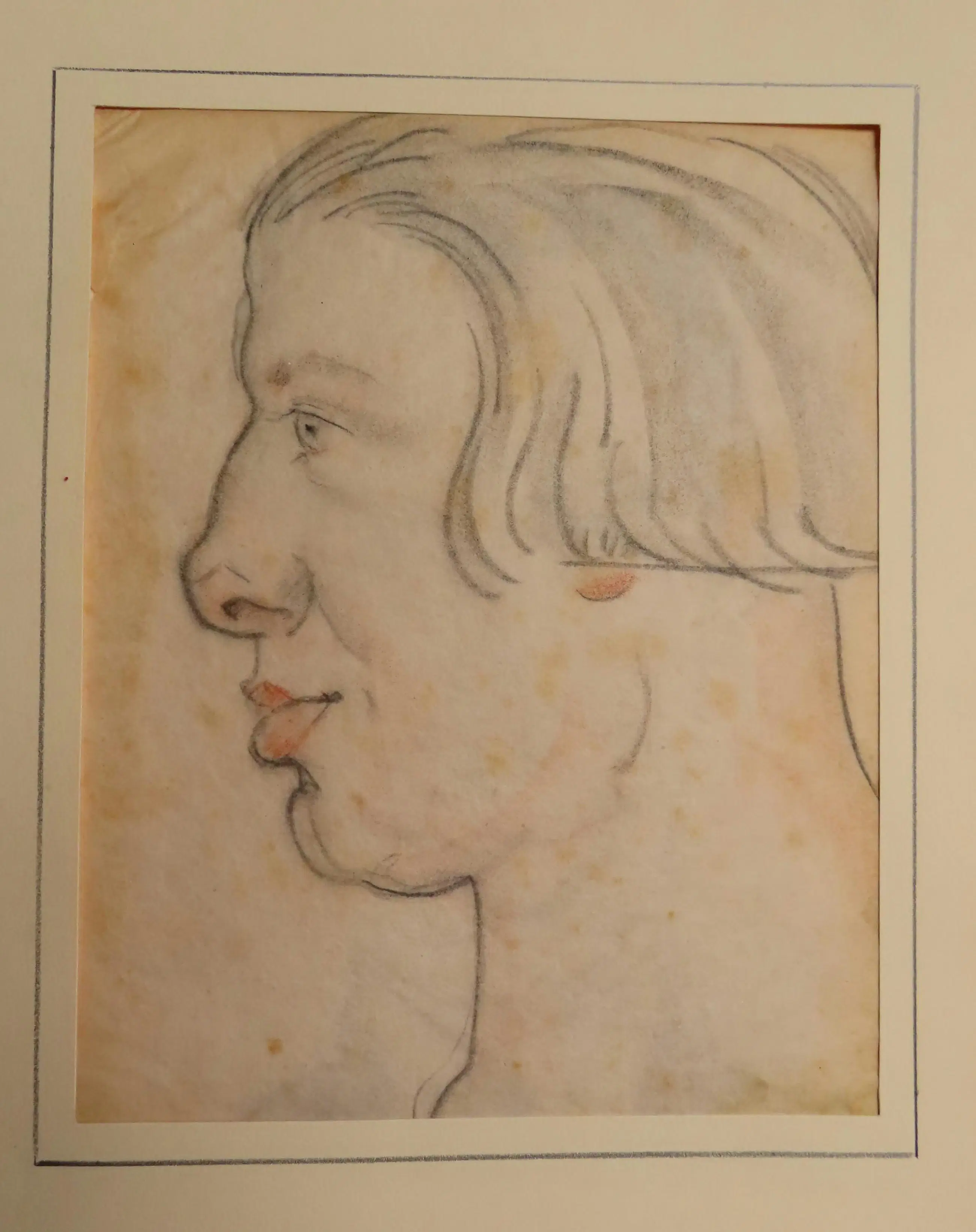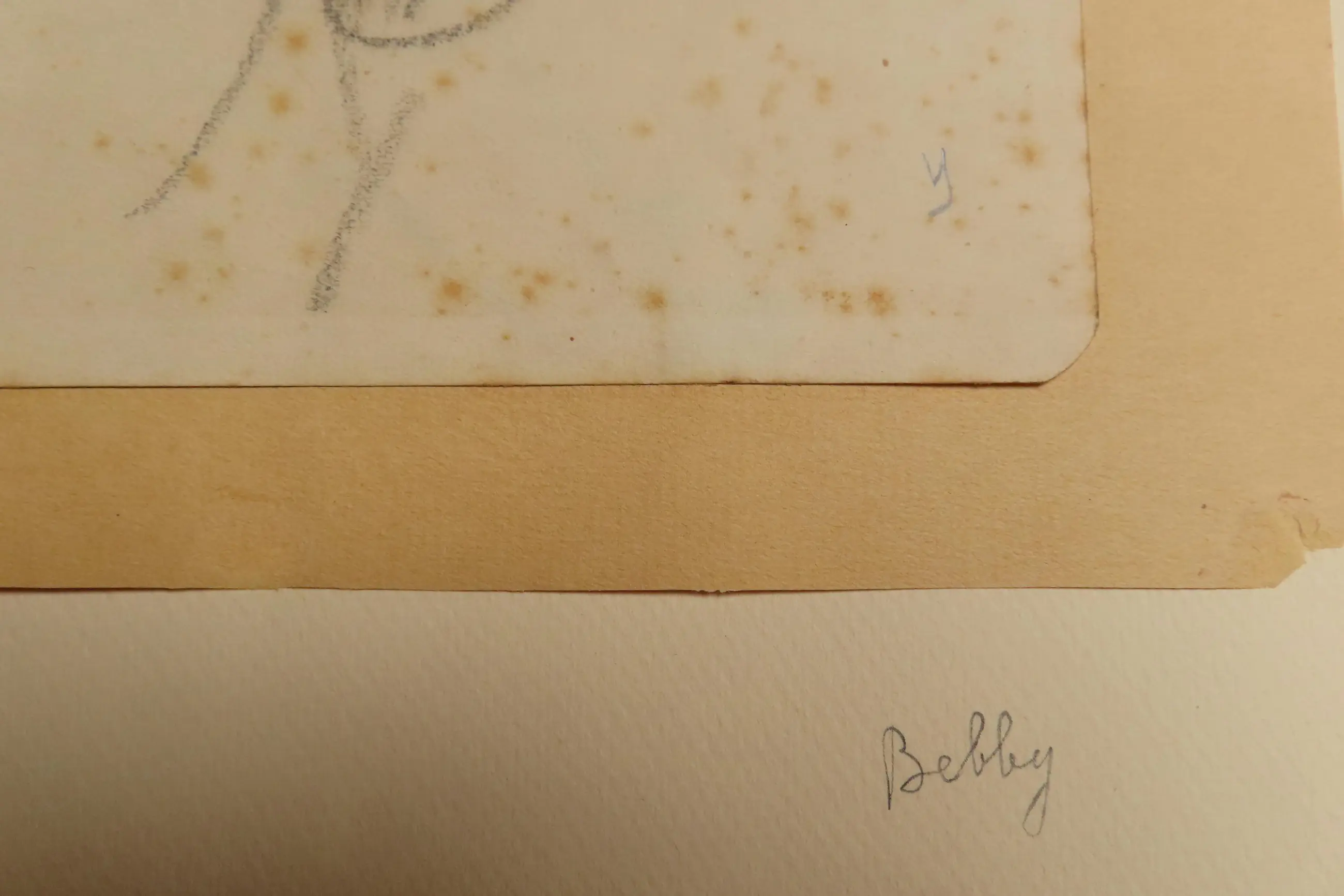 3) Titel: Bebby Techniek: tekening kleuren potlood/krijt op rijstpapier Gesigneerd: nee Afmetingen: ca. 28 x 21,5 cm Conditie: foxing en scheurtje links boven