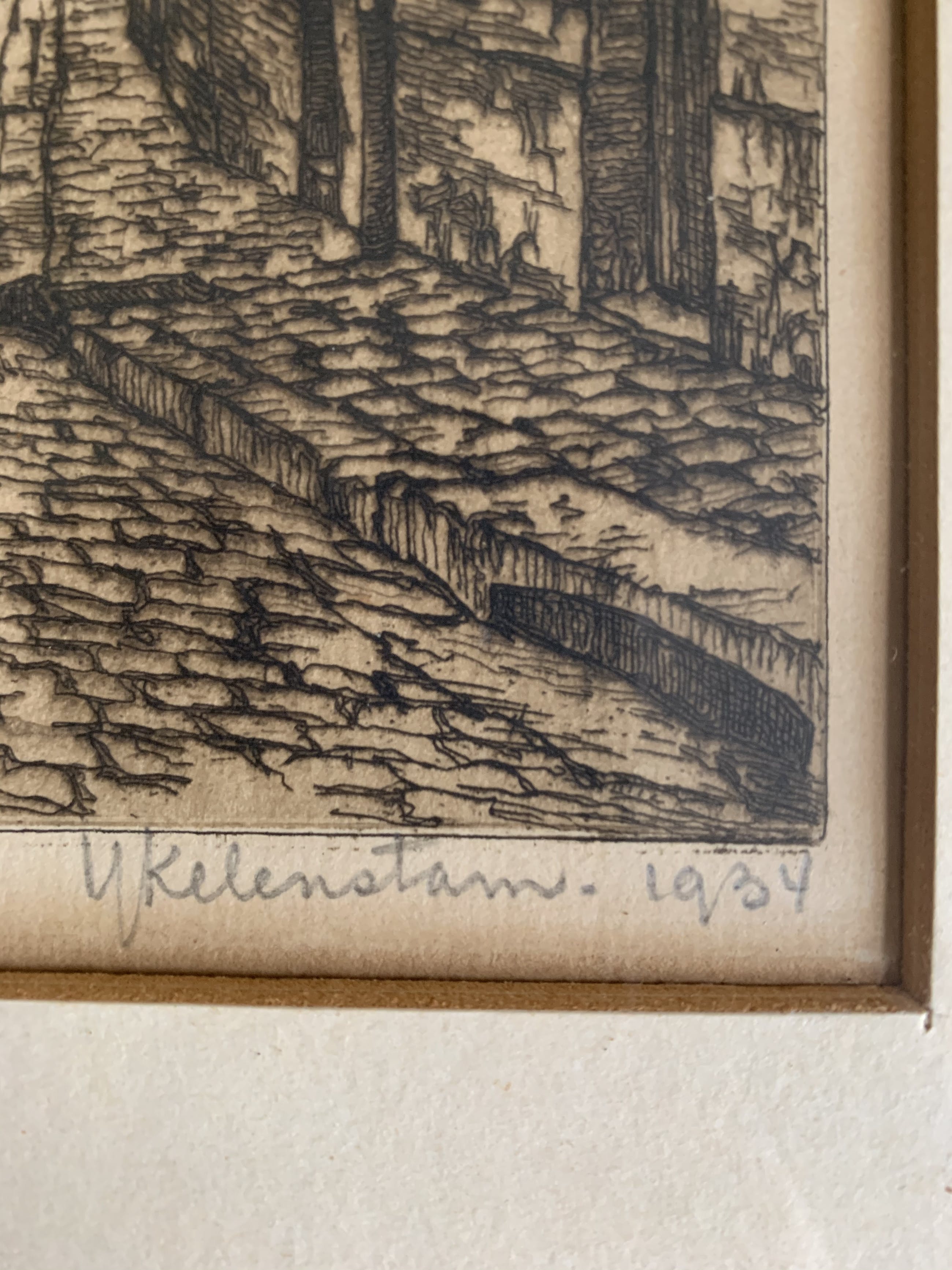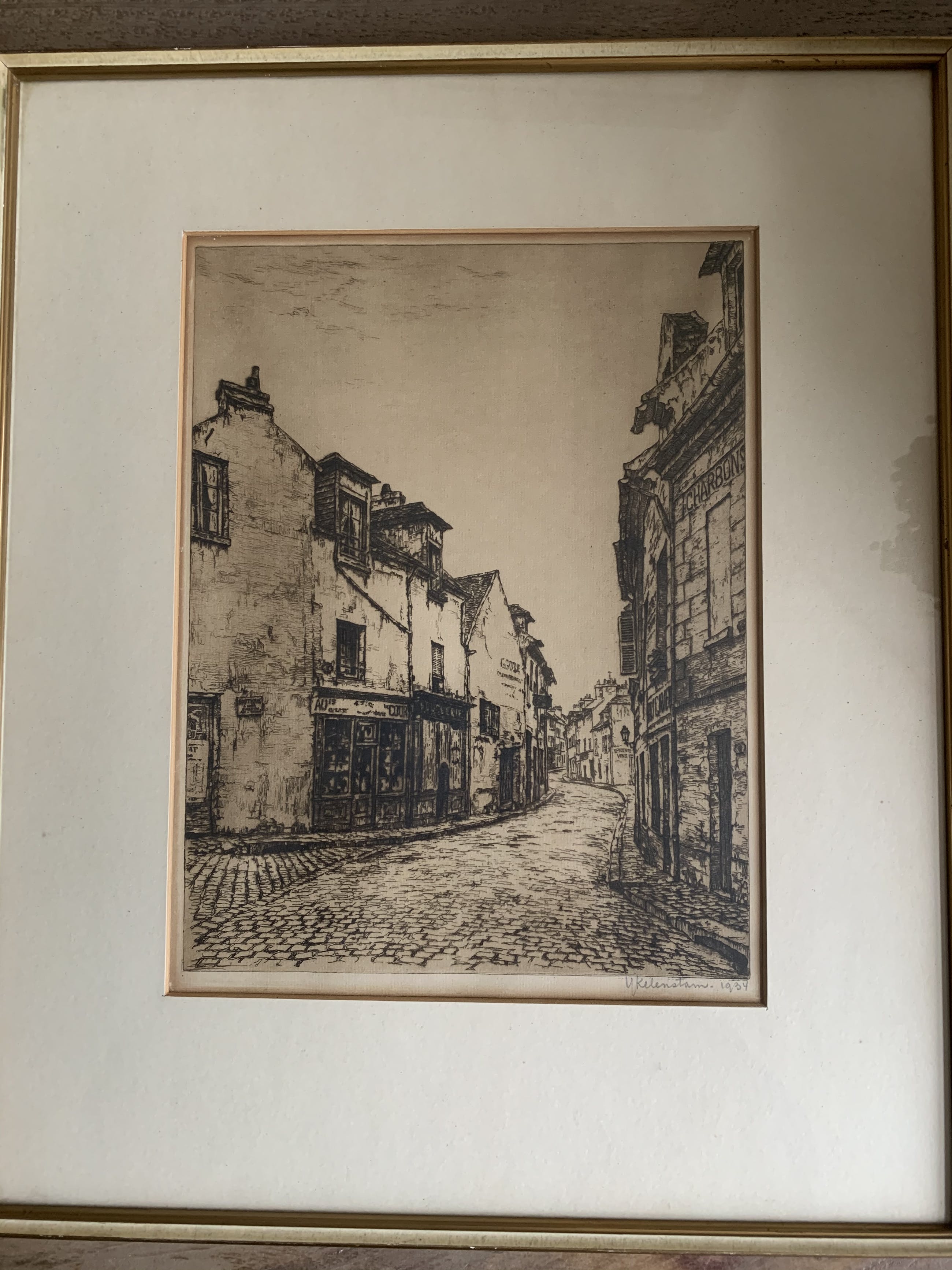 Fraaie ets van vermoedelijk een Frans dorp of Franse stad. Voluit gesigneerd en gedateerd. Mooi werk voor een kleine prijs!