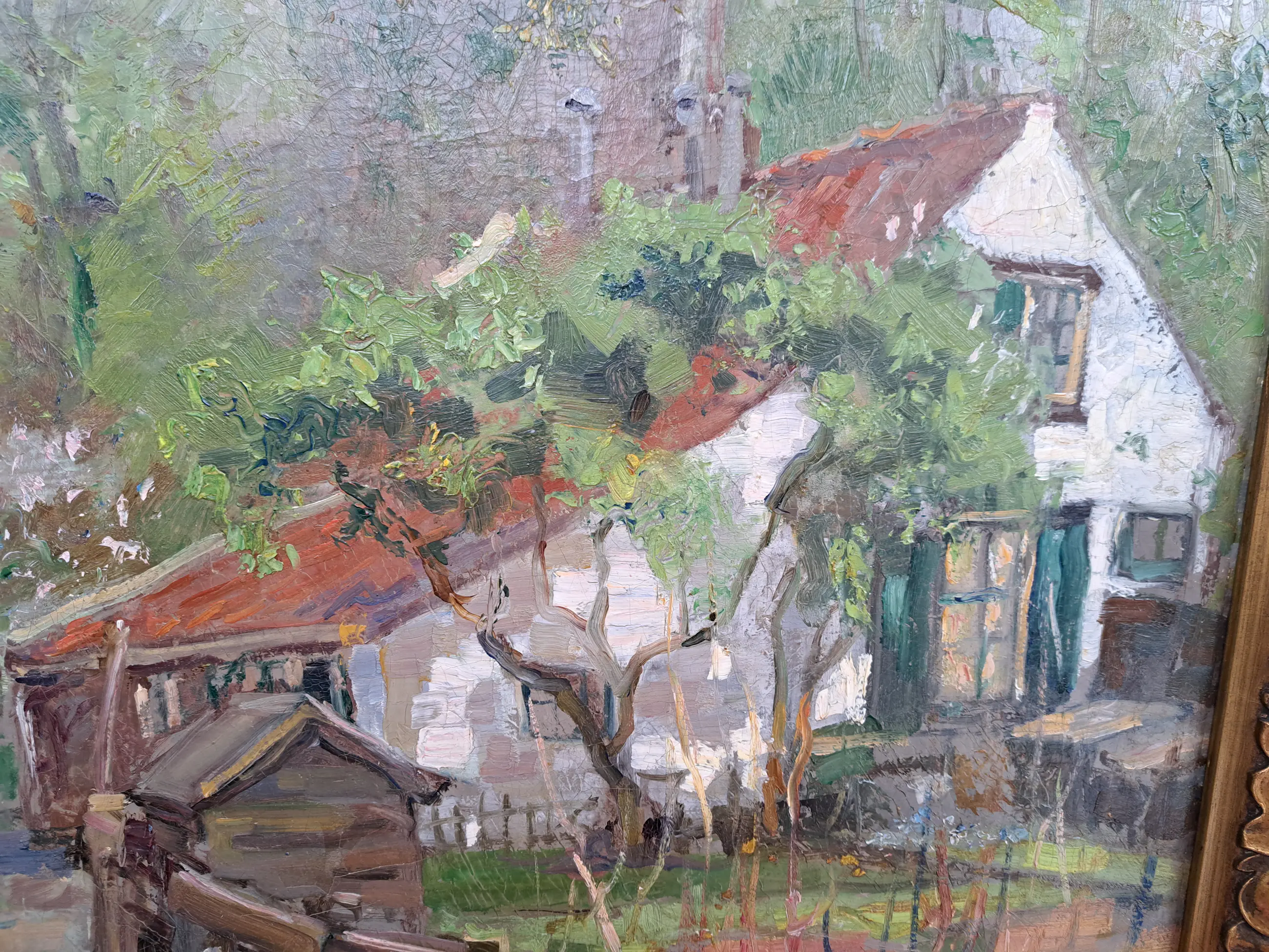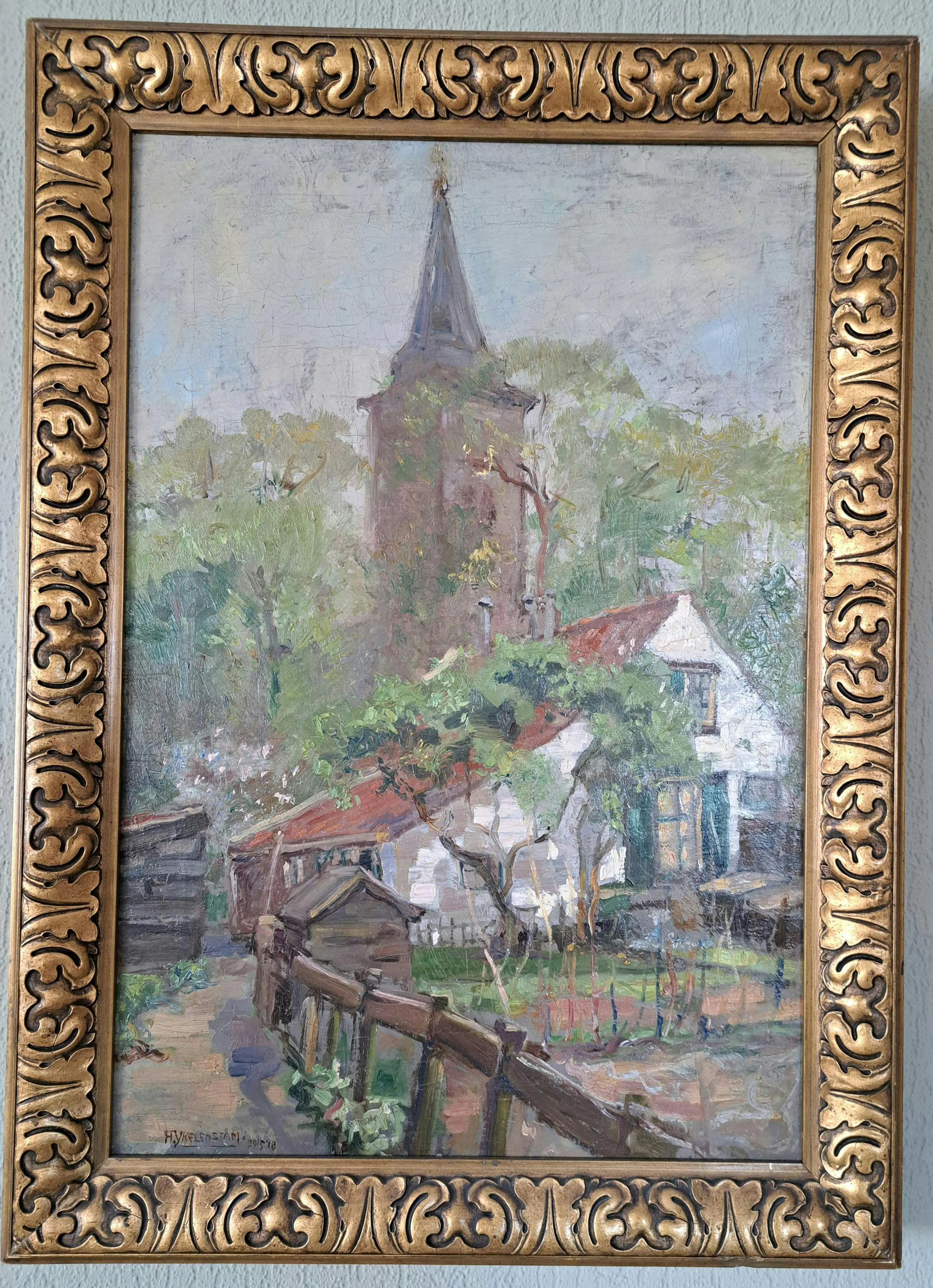 Een schilderij van de toren van de protestantse kerk in Breukelen. In werkelijkheid zijn de kleuren iets minder flets