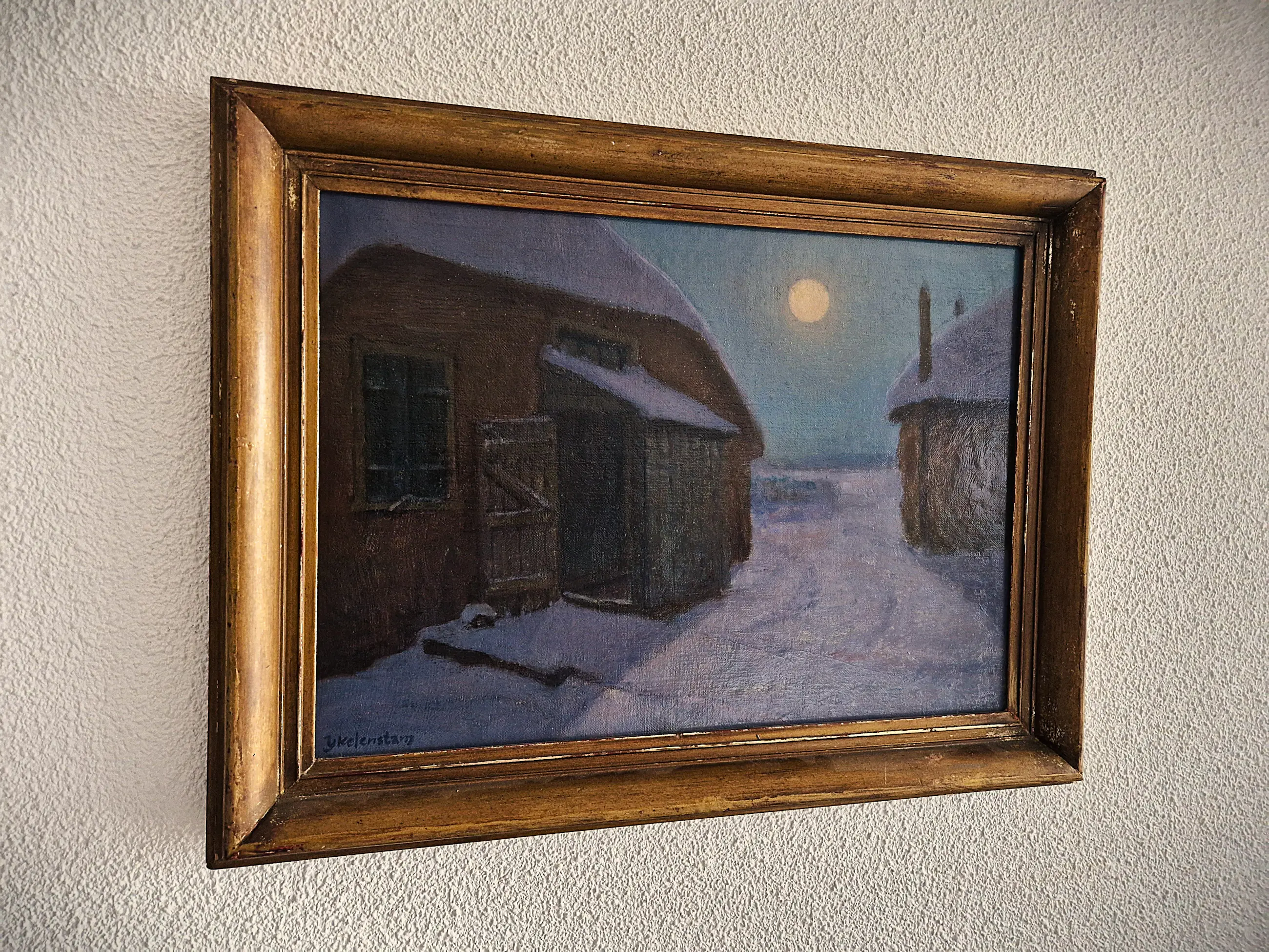 - Een door hendrik IJkelenstam in 1966 geschilderd olieverf op doek schilderij. Fraaie impressionistische voorstelling van een boerderij in een winters nachtlandschap. Zowel aan de voorzijde (linksonder) alsook op het spieraam door de schilder gesigneerd, gedateerd en getiteld. Het schilderij (het doek) verkeert in goede conditie en zit in de originele lijst.