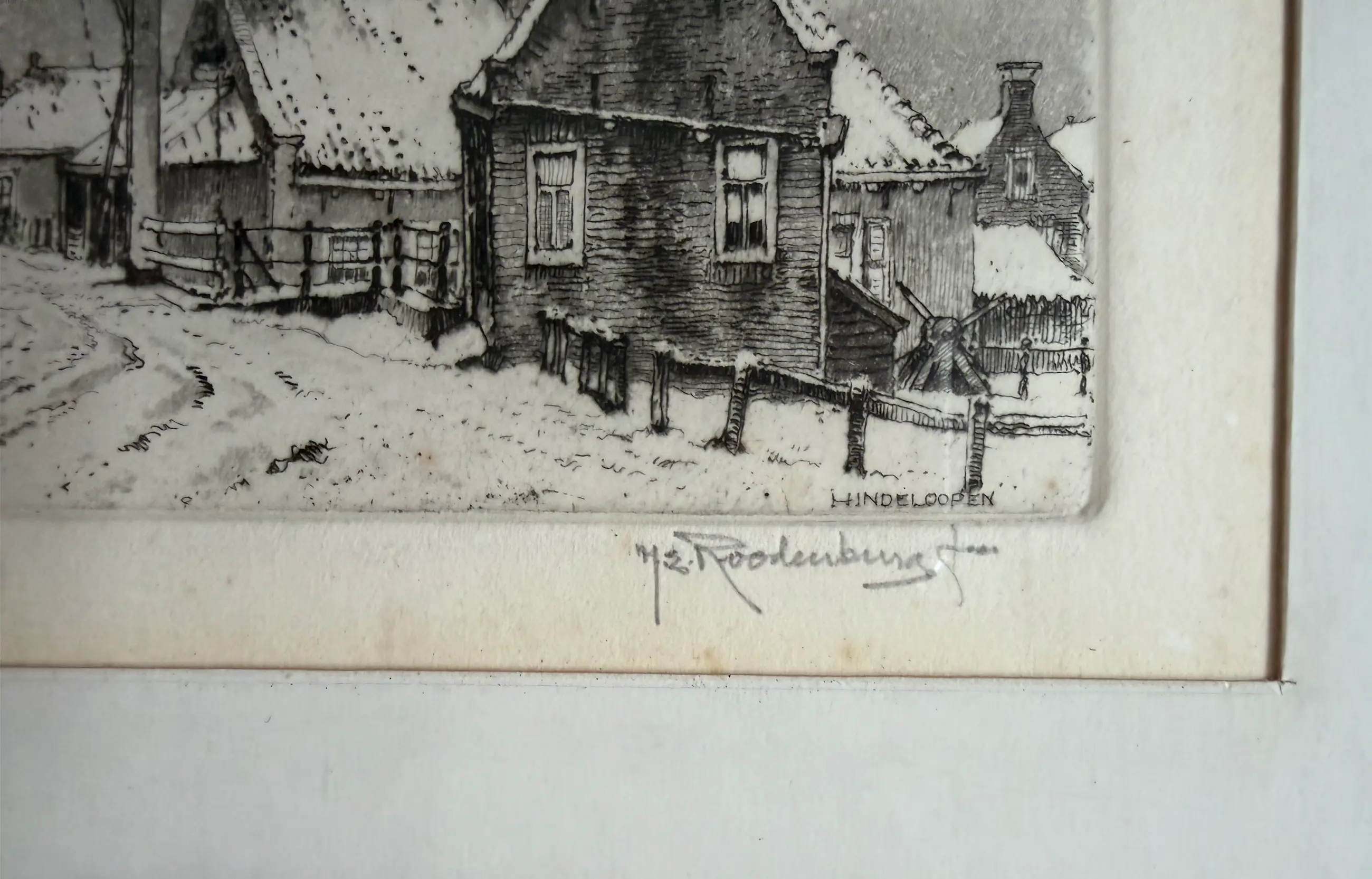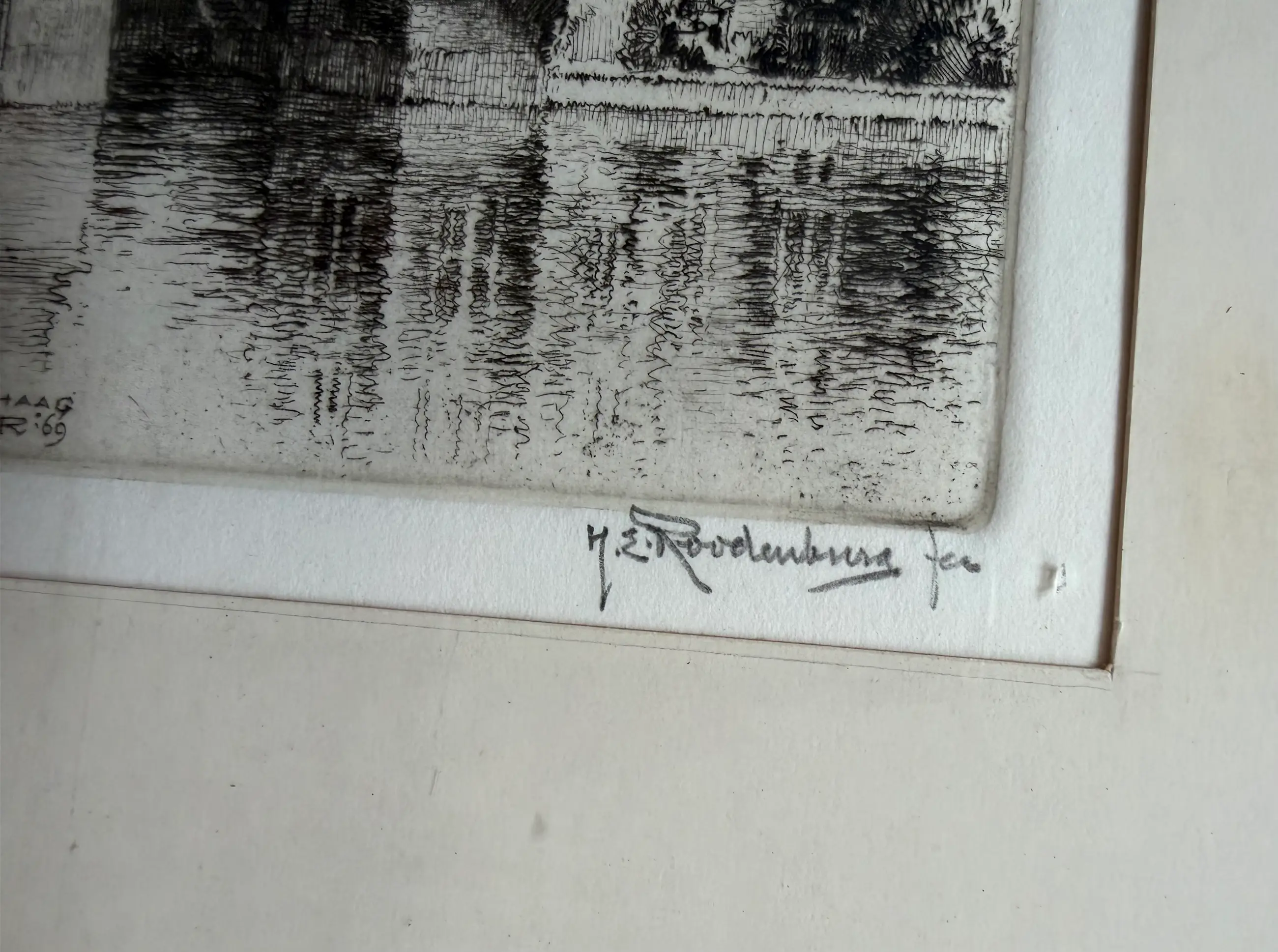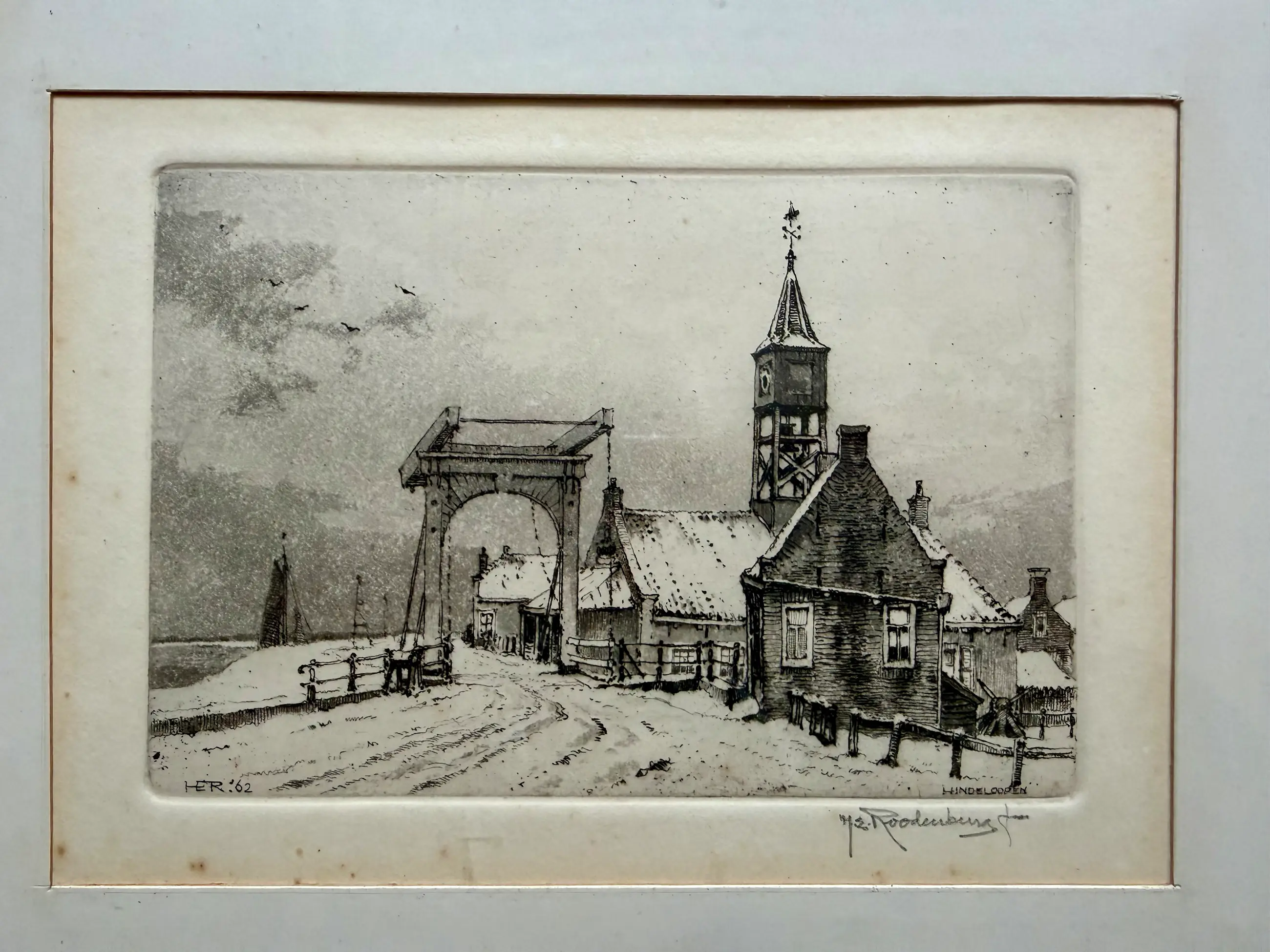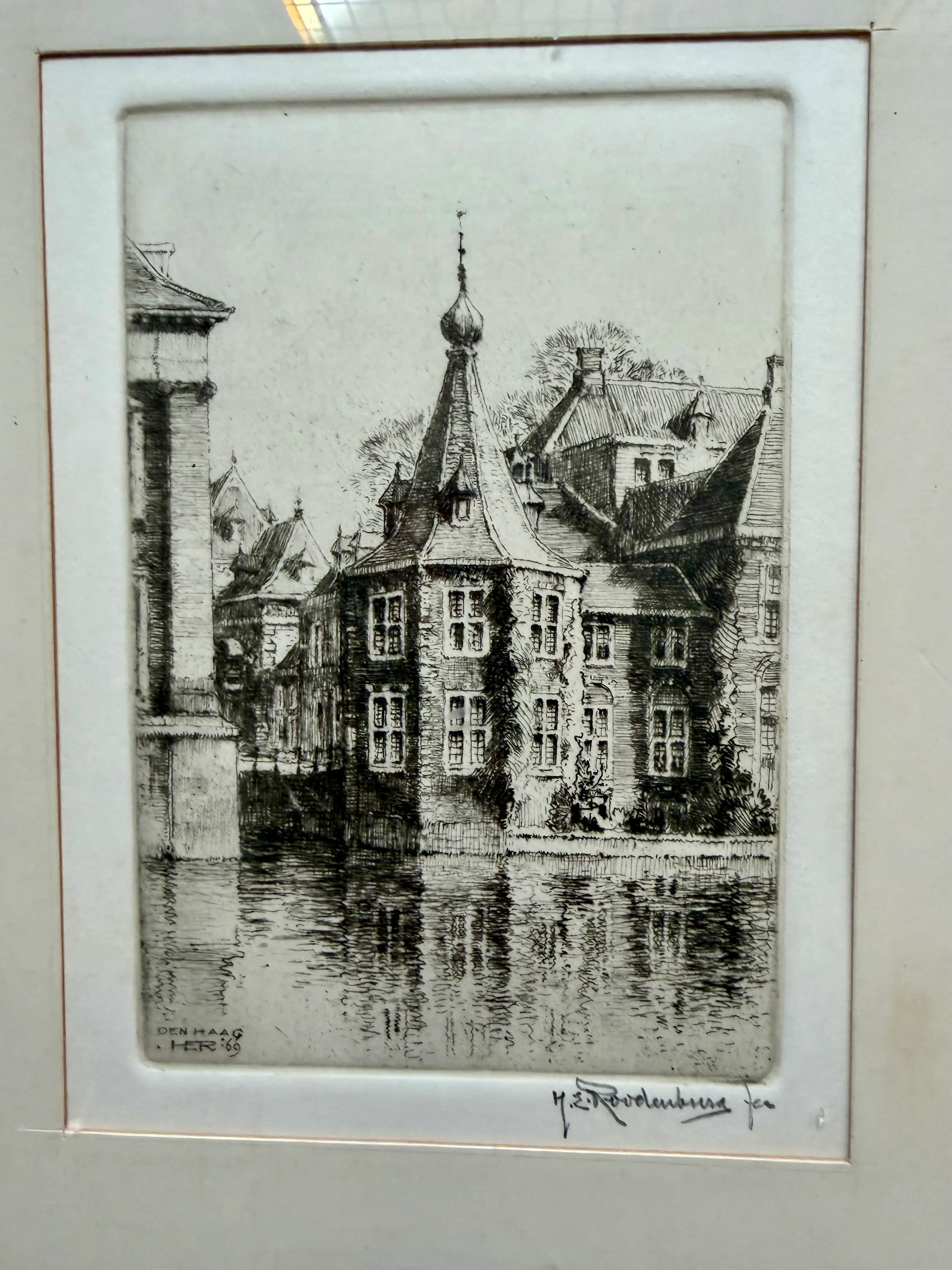 Twee fraaie etsen van Hendrikus Elias Roodenburg (Den Haag, 1895 – Wassenaar, 1987), beschouwd als een van de grootste topografische etsters van Nederland. Beide werken zijn rechtsonder met potlood gesigneerd H.E. Roodenburg en monogram HER in de plaat.