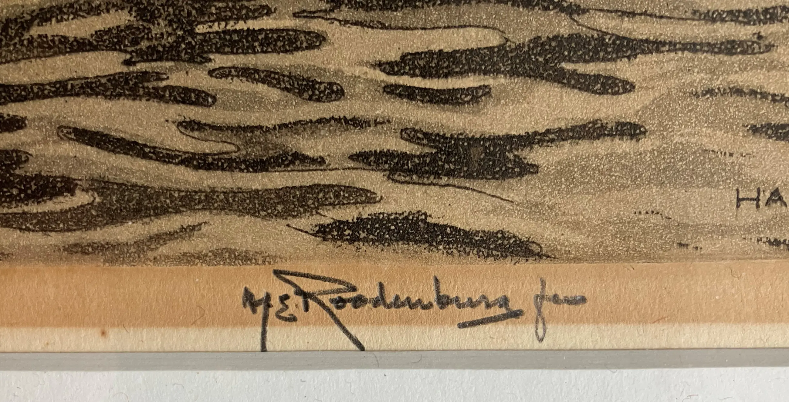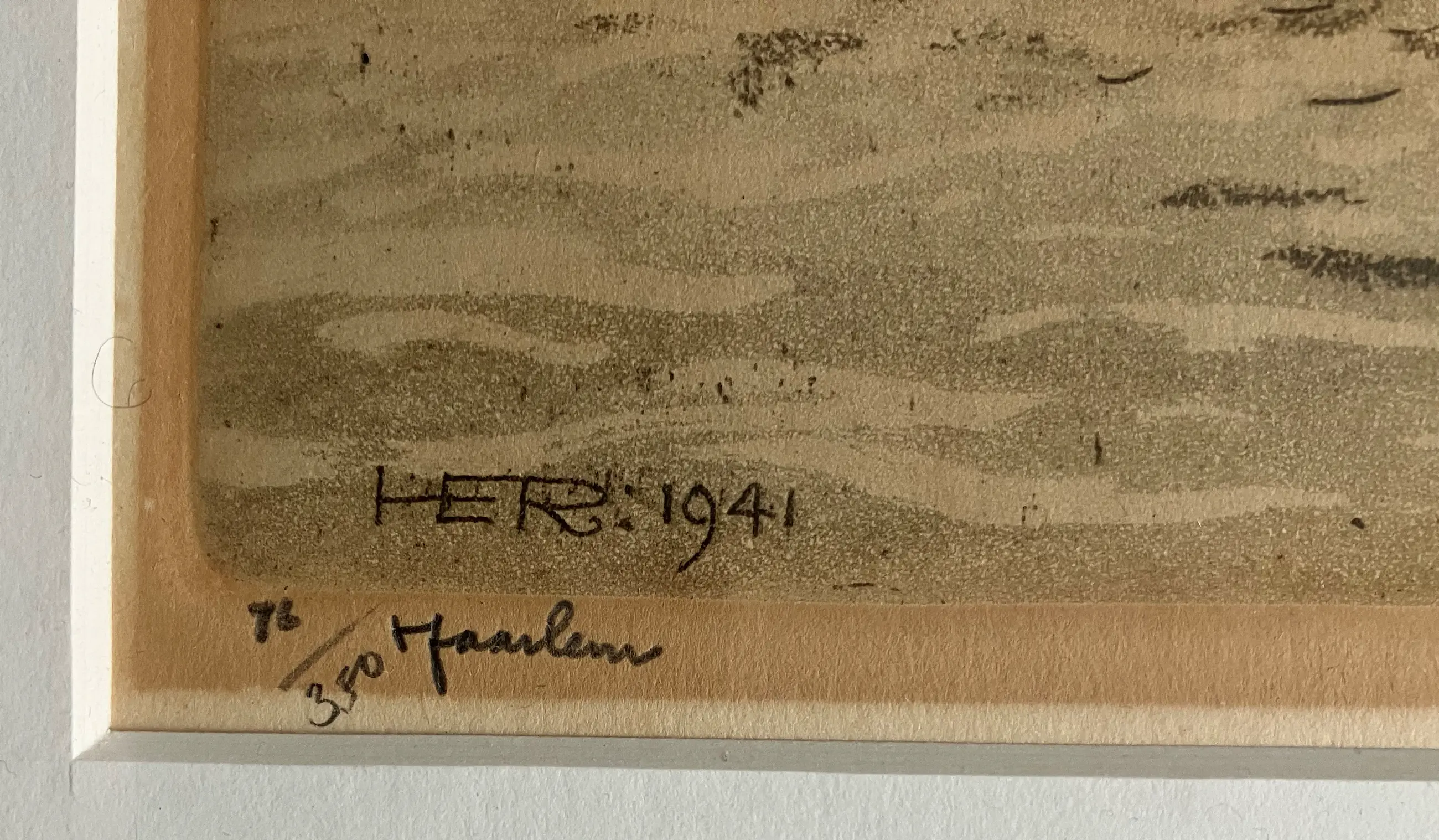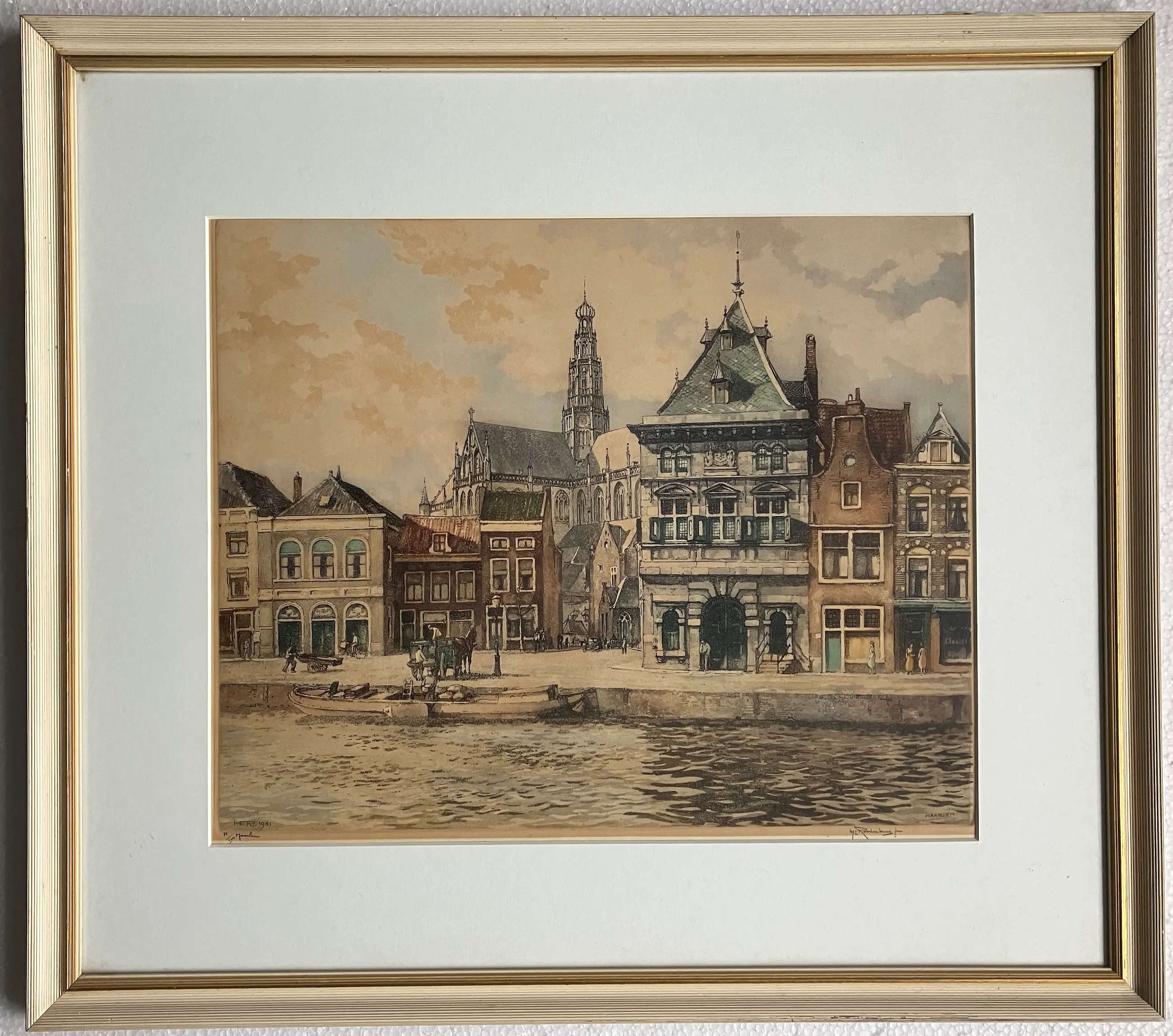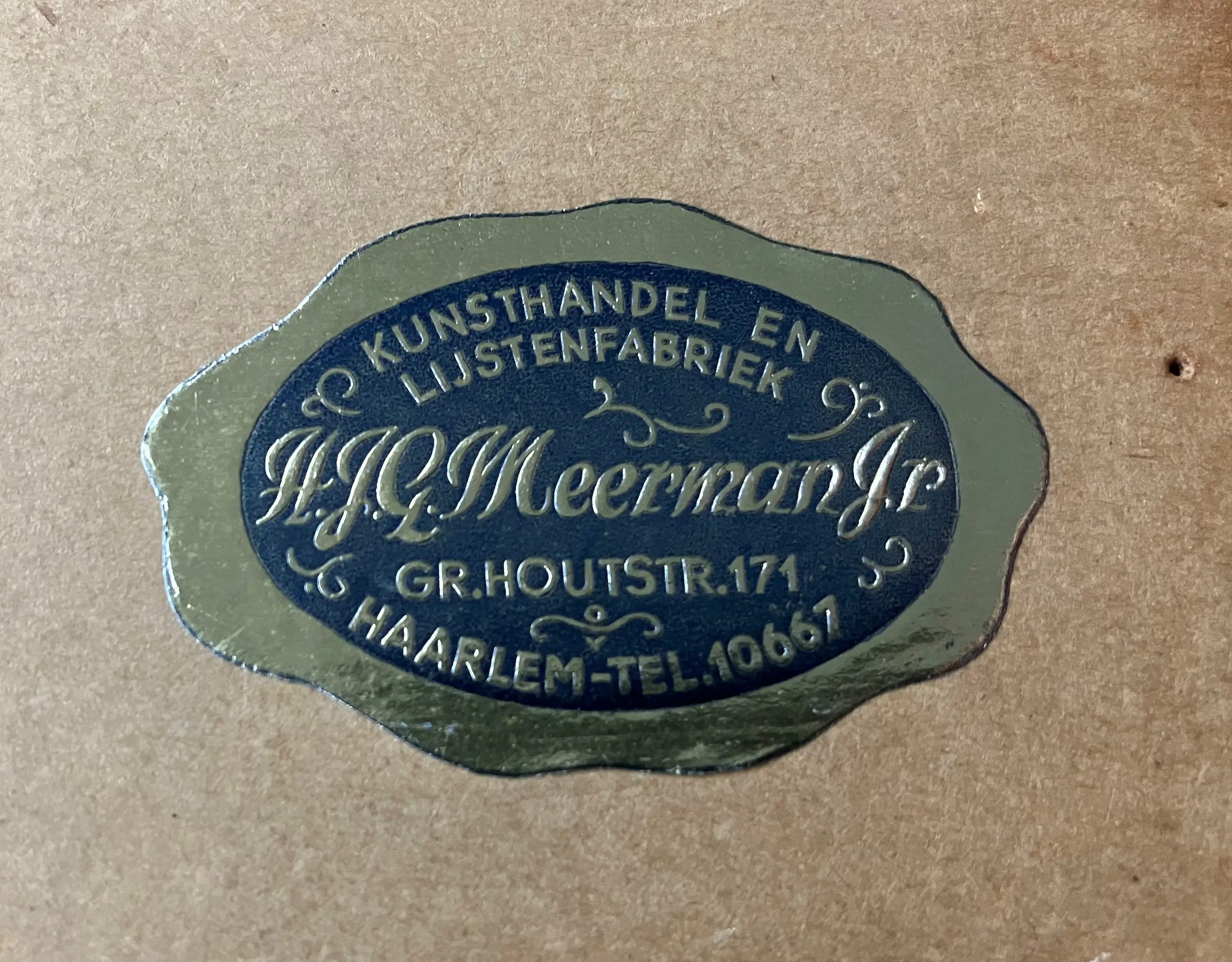 Papier is verbruind. Verder geen schade. Lijst in zeer goede staat