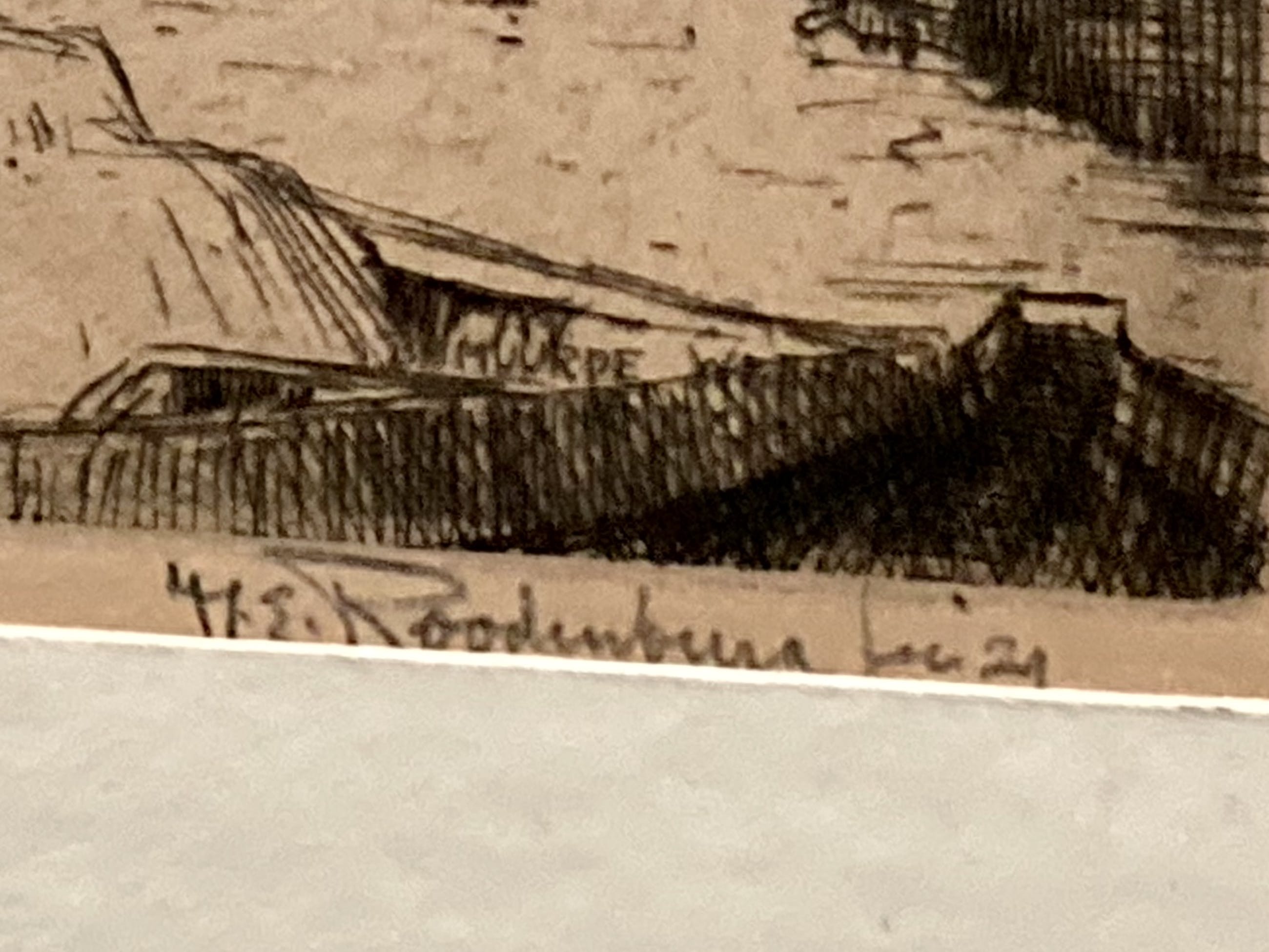 Werk is vergeeld, geen mooi passe-partout, lijst wat beschadigd.