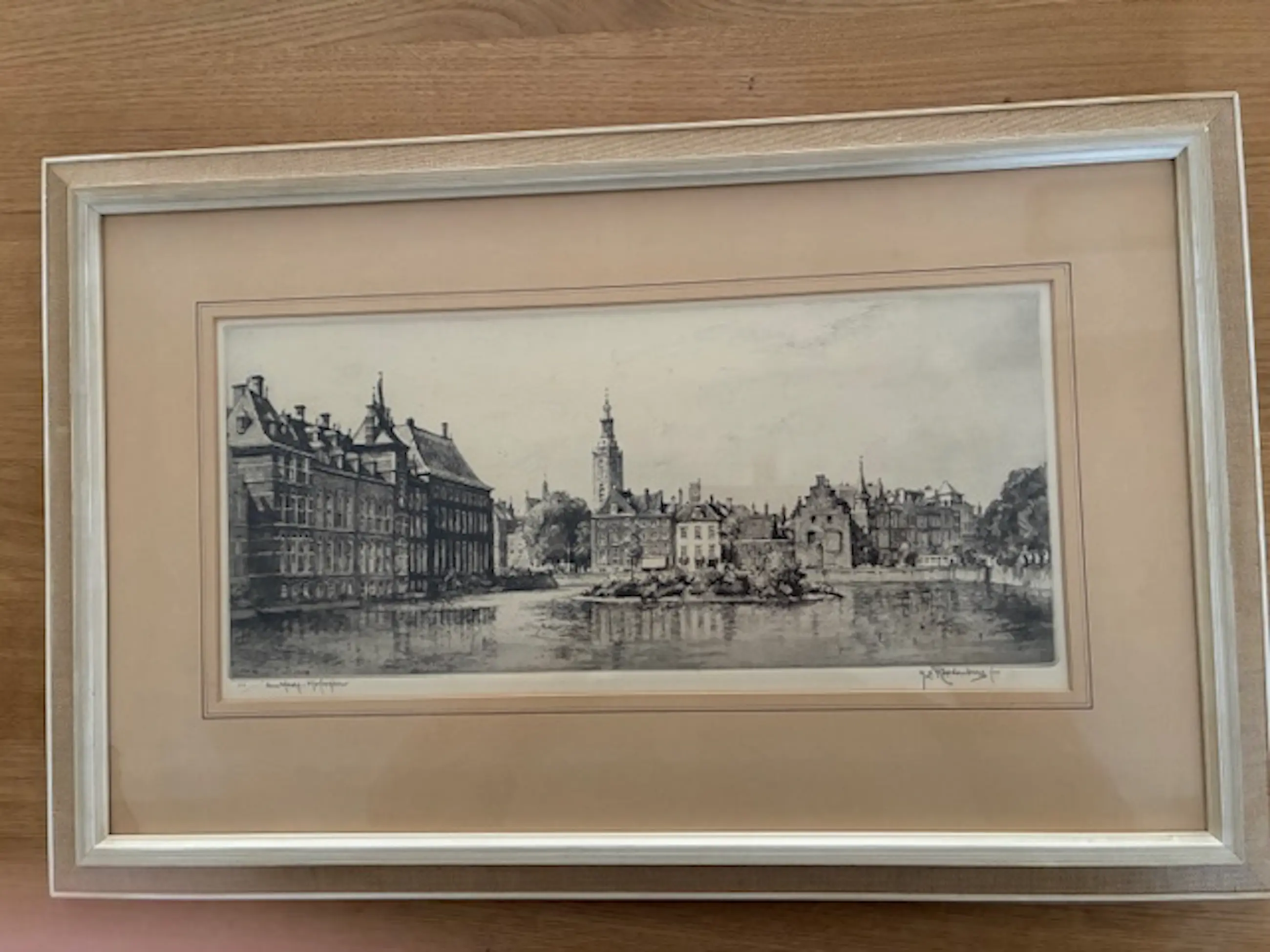 Roodenburg (1895 - 1987)was een veelzijdig kunstenaar, en geliefd om zijn etsen van stadsgezichten. U kijkt naar dit werk vanaf de Korte Vijverberg, met links het Binnenhof, aan de overkant de Gevangenpoort en verderop het Stadhuis. Gesigneerd en gedateerd '60 in de plaat en gesigneerd in potlood.
