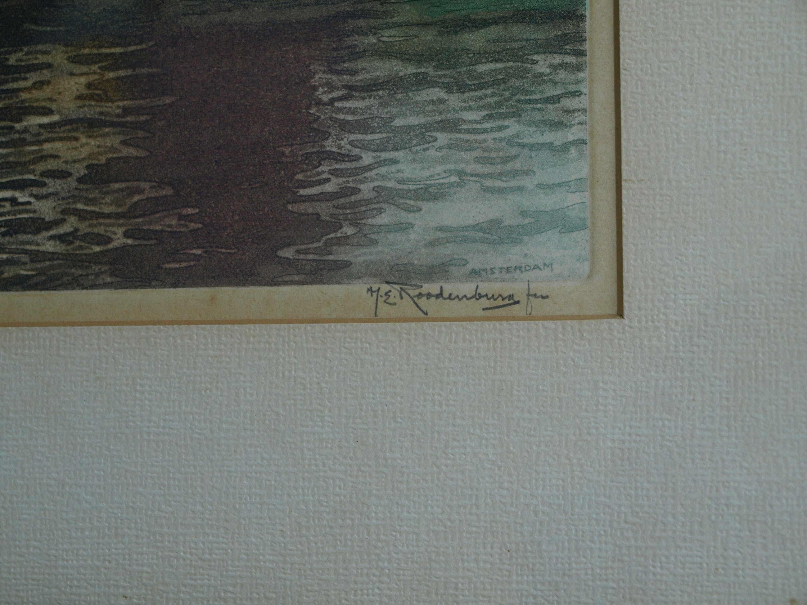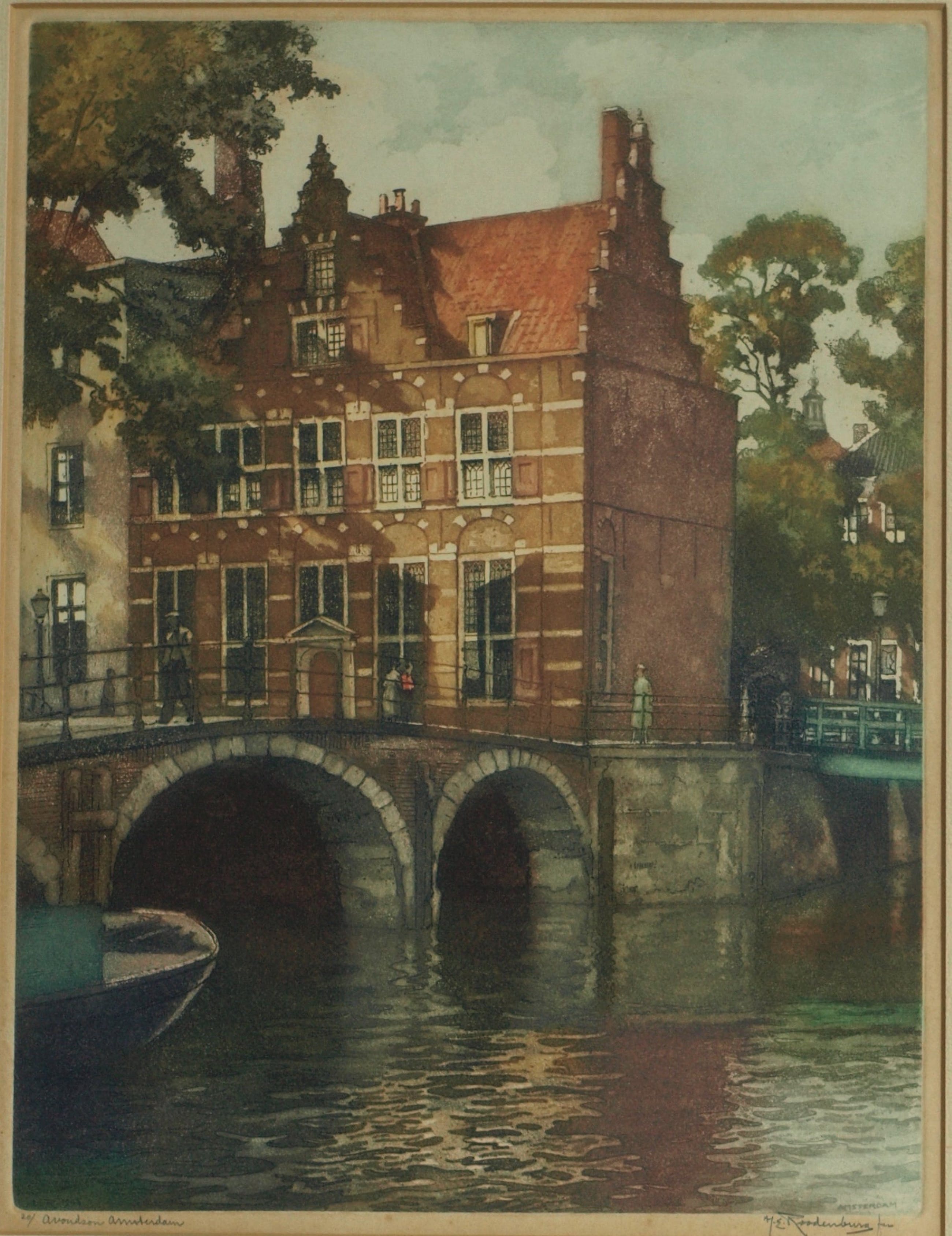 Een grote ingelijste ets uit 1948 van de Haagse kunstenaar Hendrikus Elias Roodenburg (1895-1987), met een voorstelling van een gracht in Amsterdam in de avondzon.