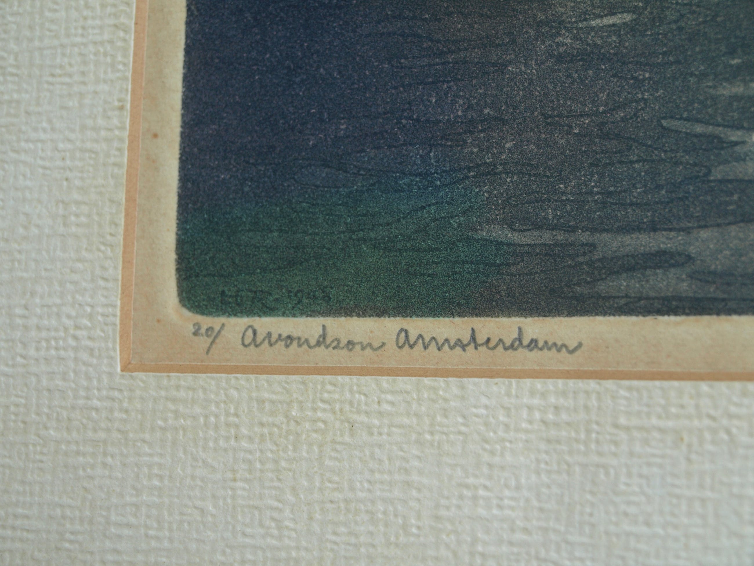 -Gesigneerd, genummerd (‘20’) en getiteld (“Avondzon Amsterdam”) met potlood en ook met het monogram van de kunstenaar en het jaartal linksonder in de ets: ‘HER 1948’.