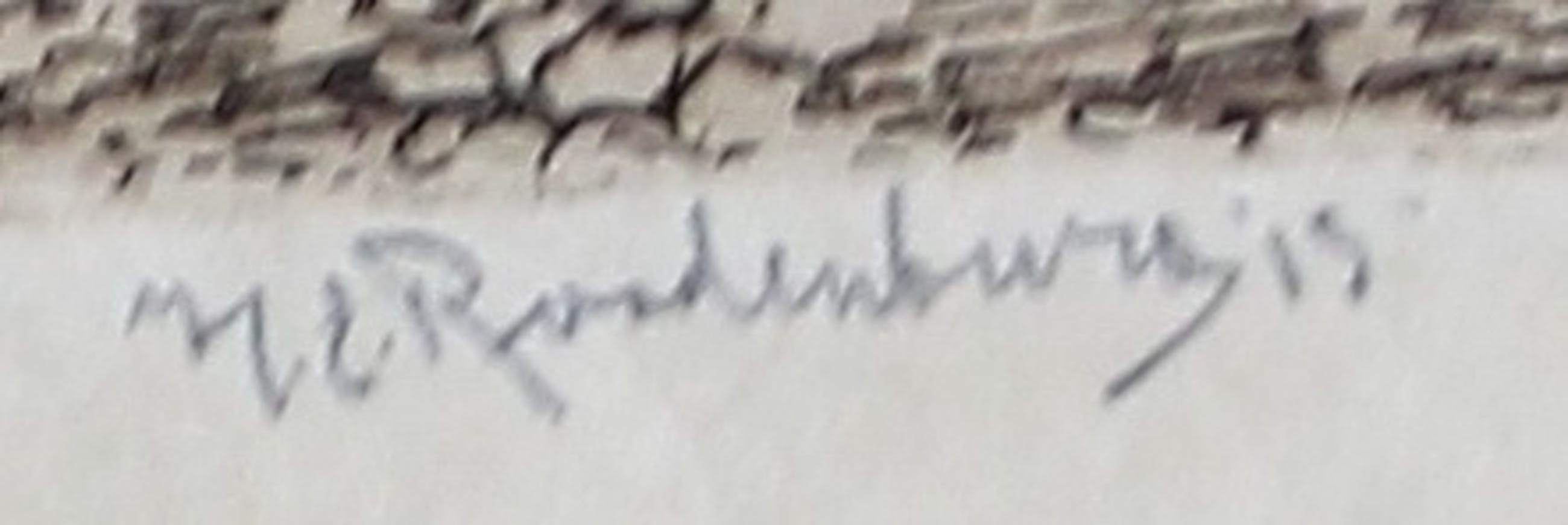 | Het werk is in goede staat. Er zitten wel wat vlekjes en plakresten op de rand om het werk heen. Goed ingelijst, valt dit in de lijst/onder de passepartout. | |||