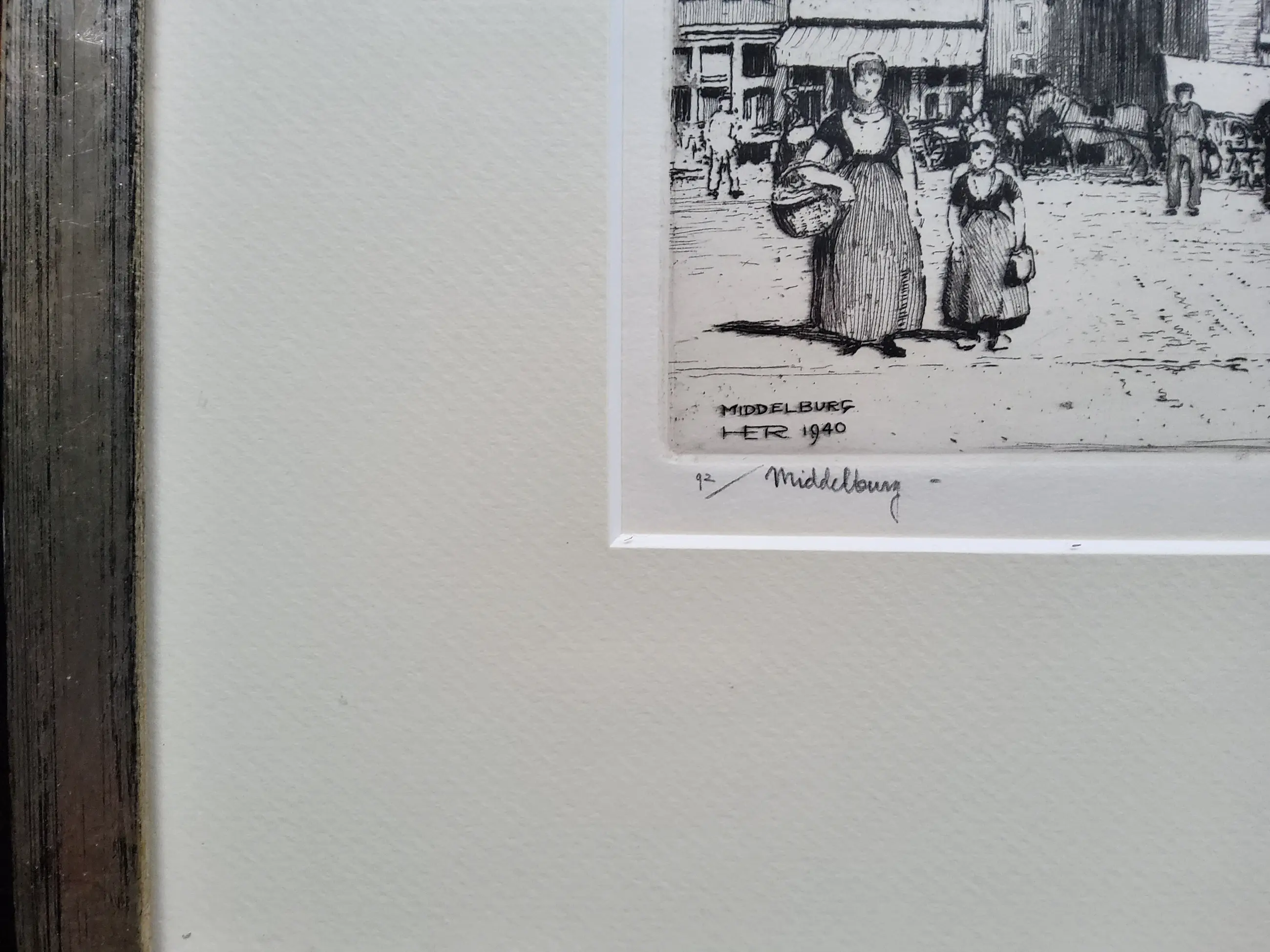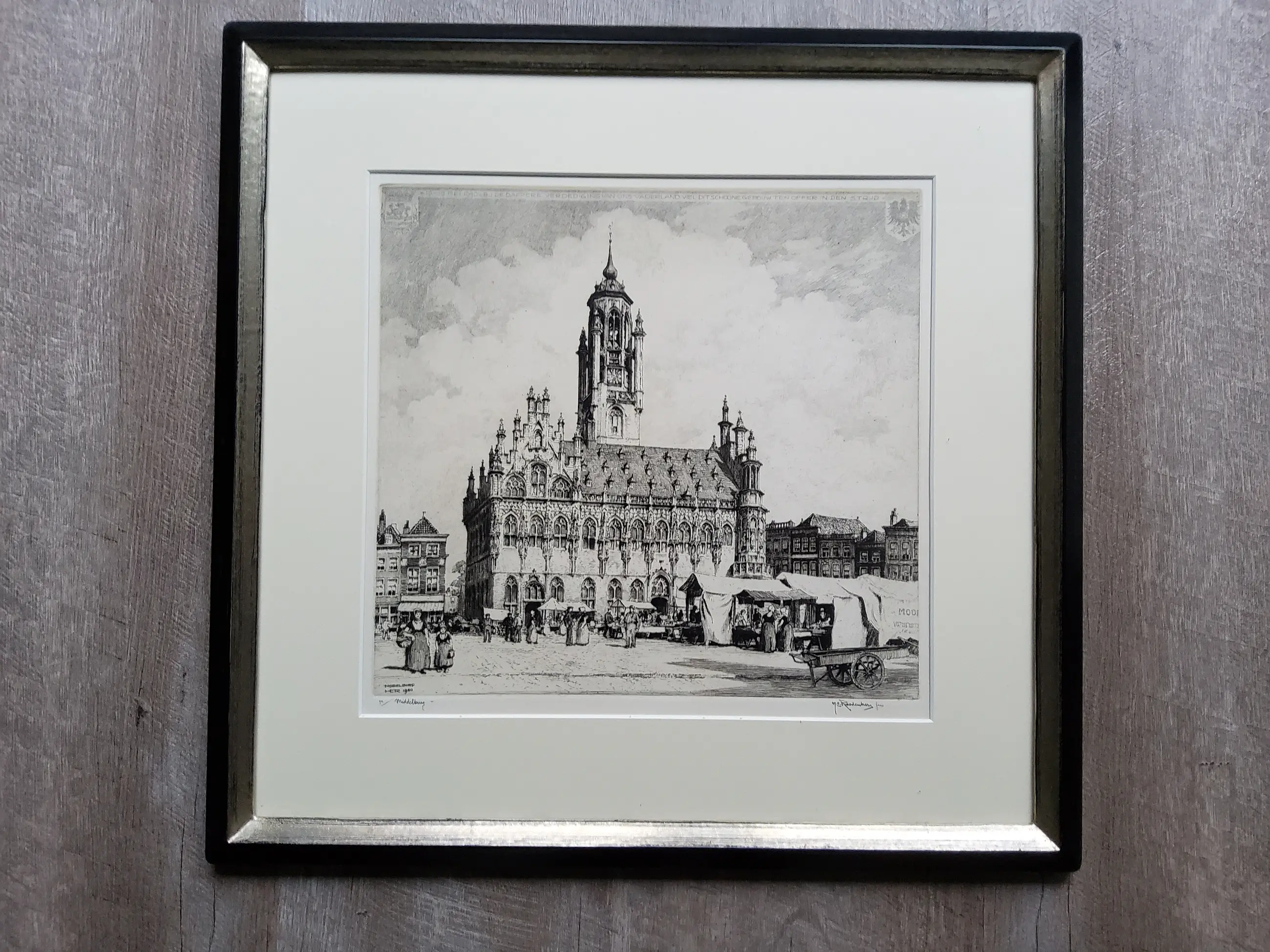 Ets van het straatbeeld rondom het stadhuis van Middelburg in 1940.