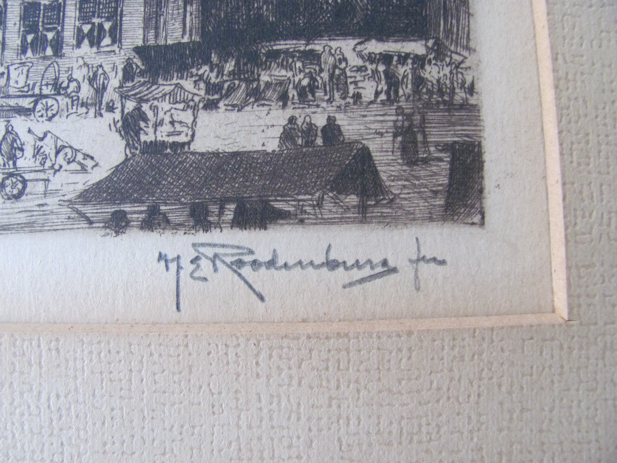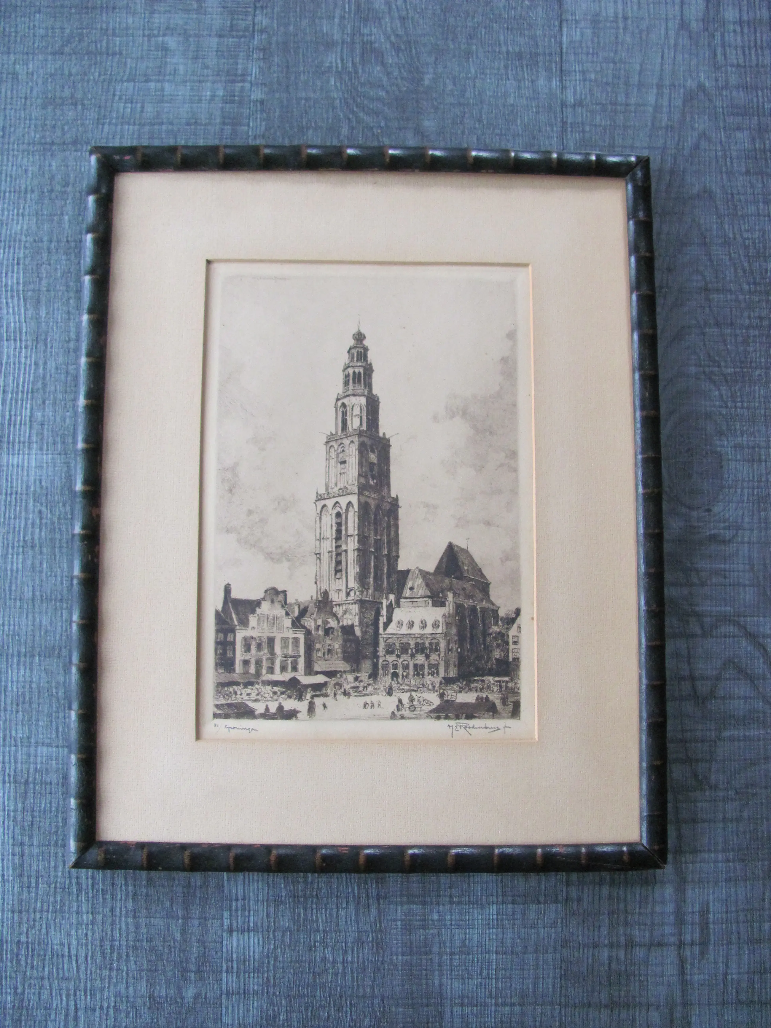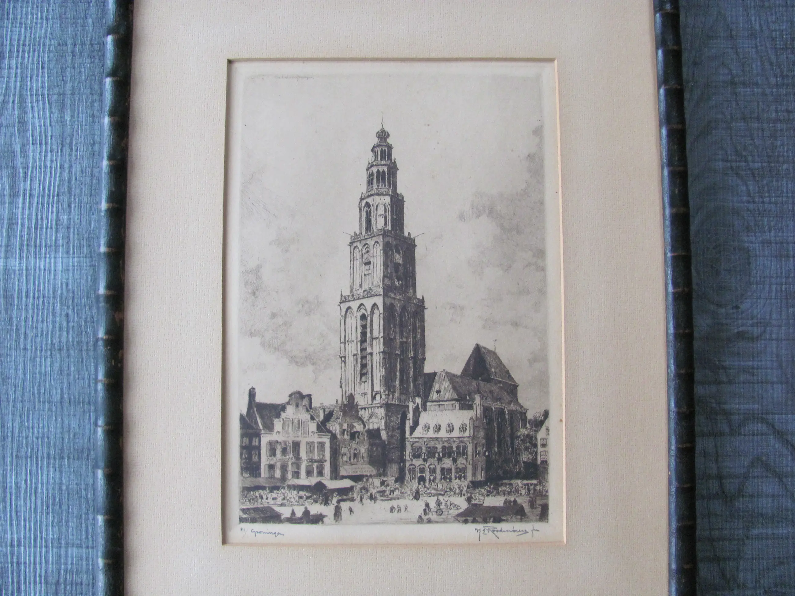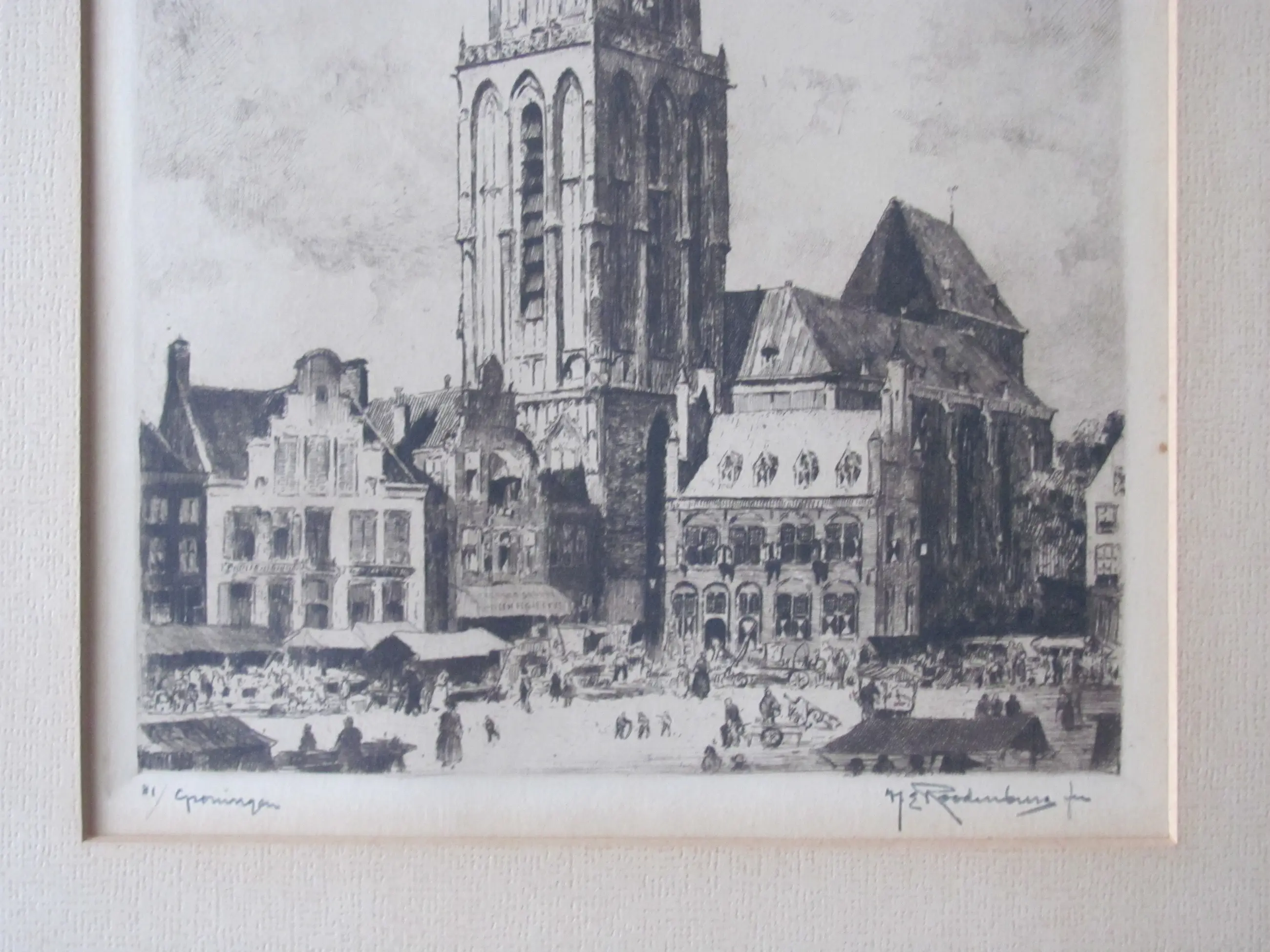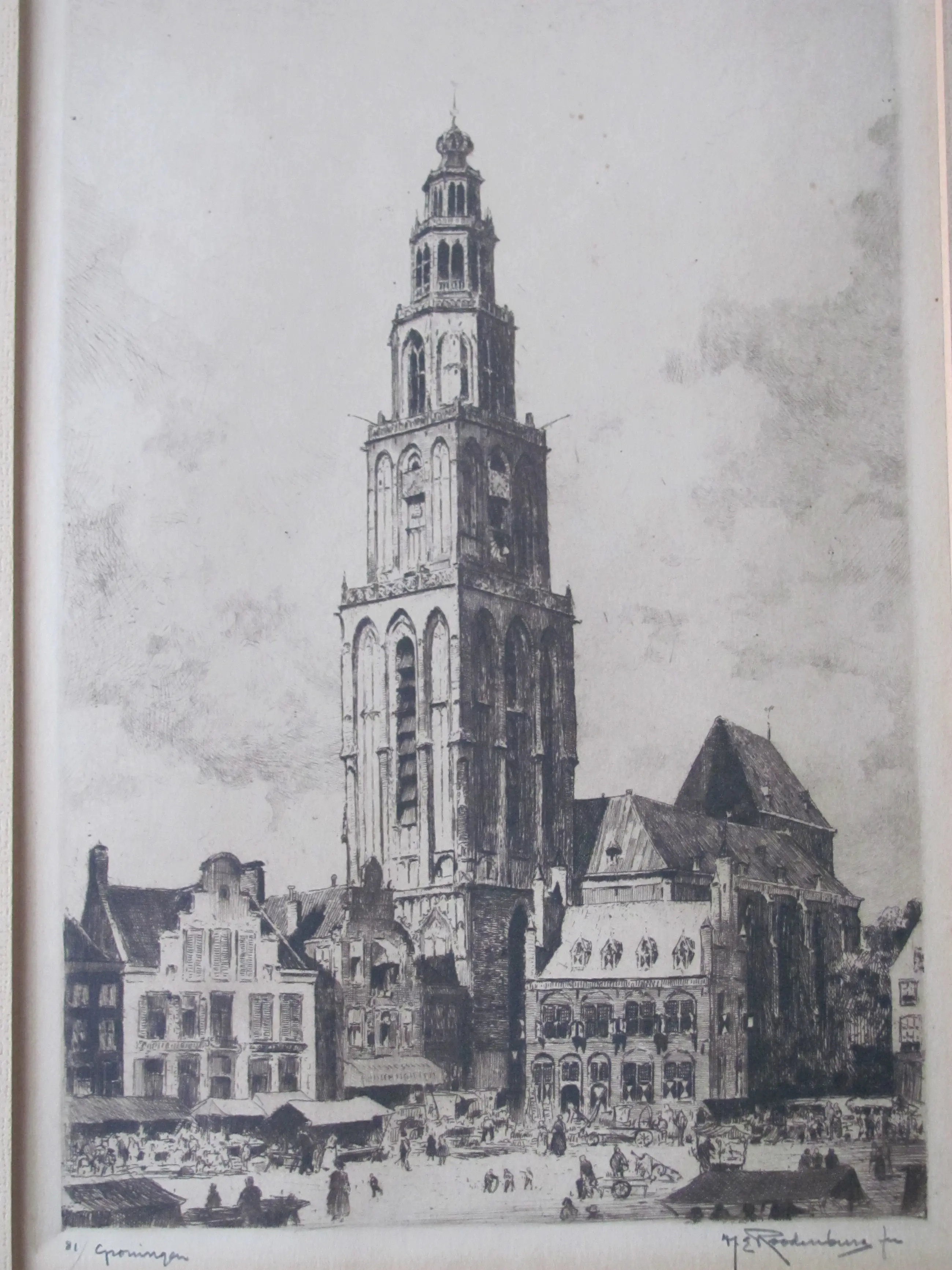 Mooie, grote ets van H.E. Roodenburg van de Martinitoren in Groningen. Ondanks de ouderdom zijn ets en lijst in goede staat. Genummerd linksonde: 81/ Groningen Gesigneerd rechtsonder: H.E. Roodenburg