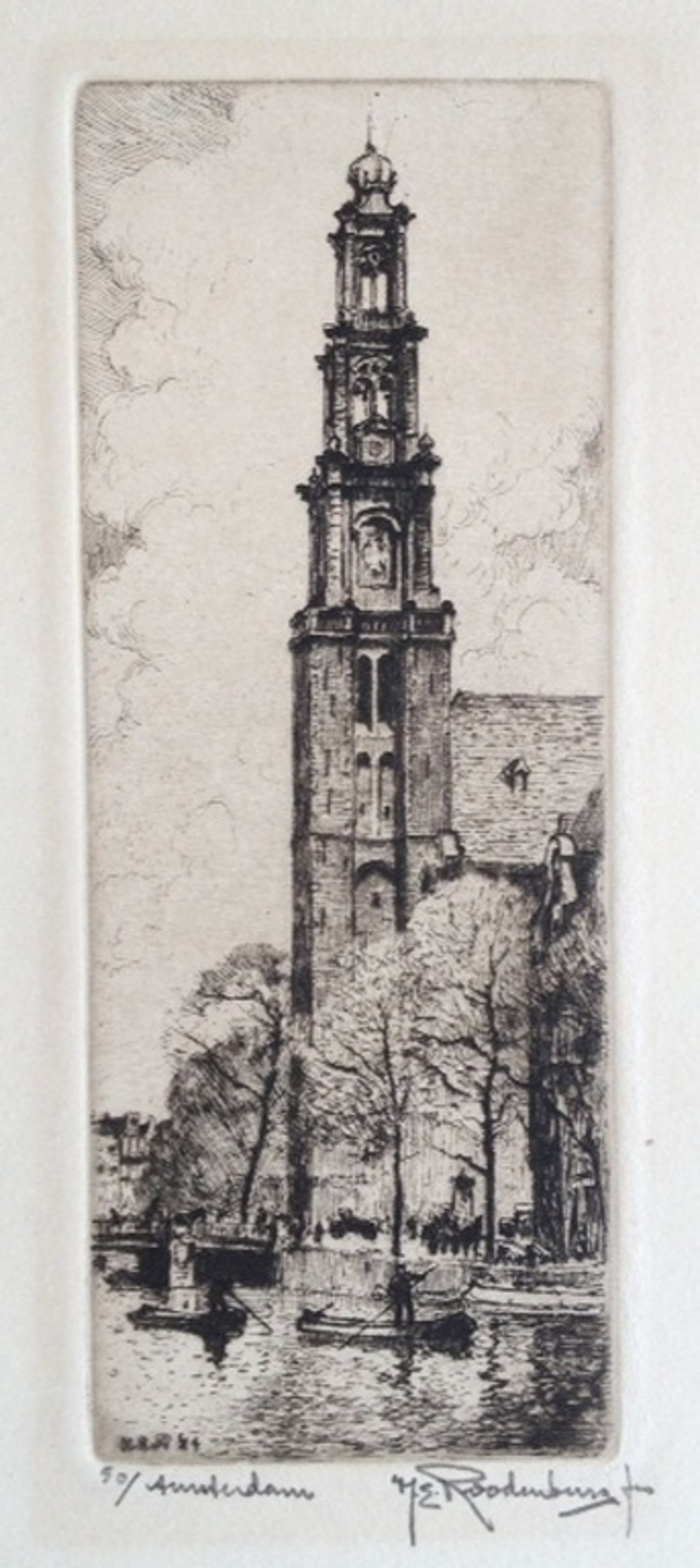 Losbladige ets door Roodenburg van de Westertoren in Amsterdam. In een zeer mooie staat.
