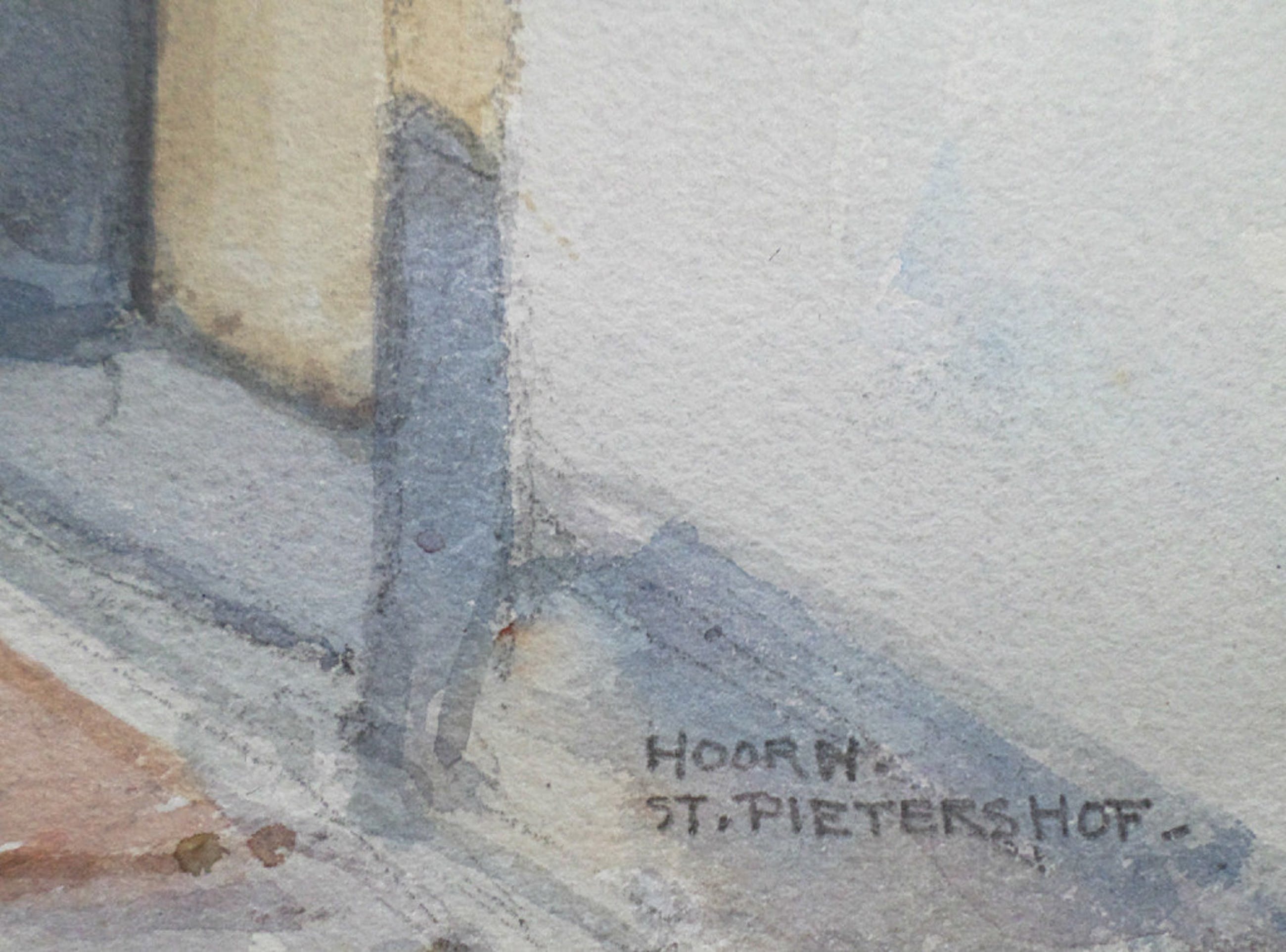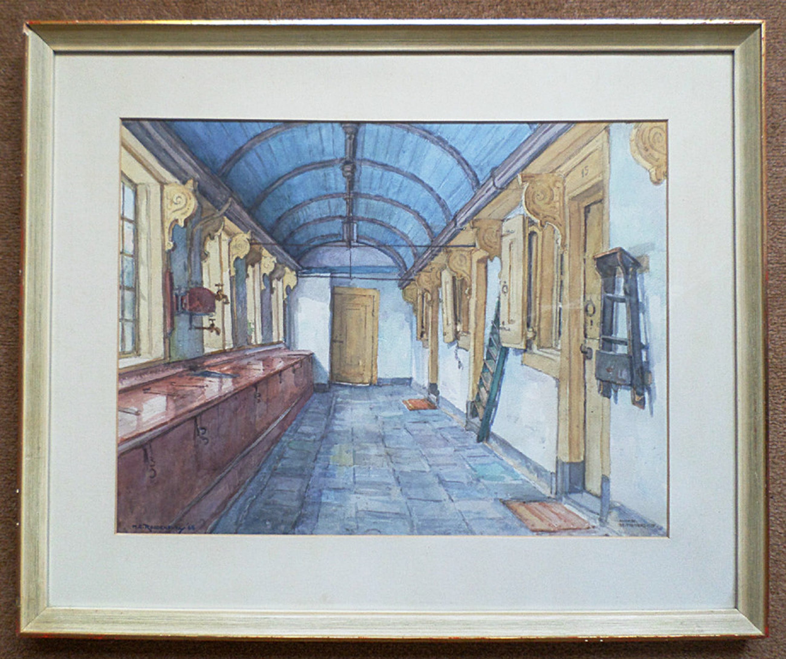 Schitterende aquarel van H.E. Roodenburg uit 1968 in originele lijst, achter glas en passepartout. Handgesigneerd en gedateerd met verf linksonder en “Hoorn, St. Pietershof” in potlood rechtsonder. Op de achterkant zit een atelierstikker van de kunstenaar (zie foto). Alles in zeer goede staat.