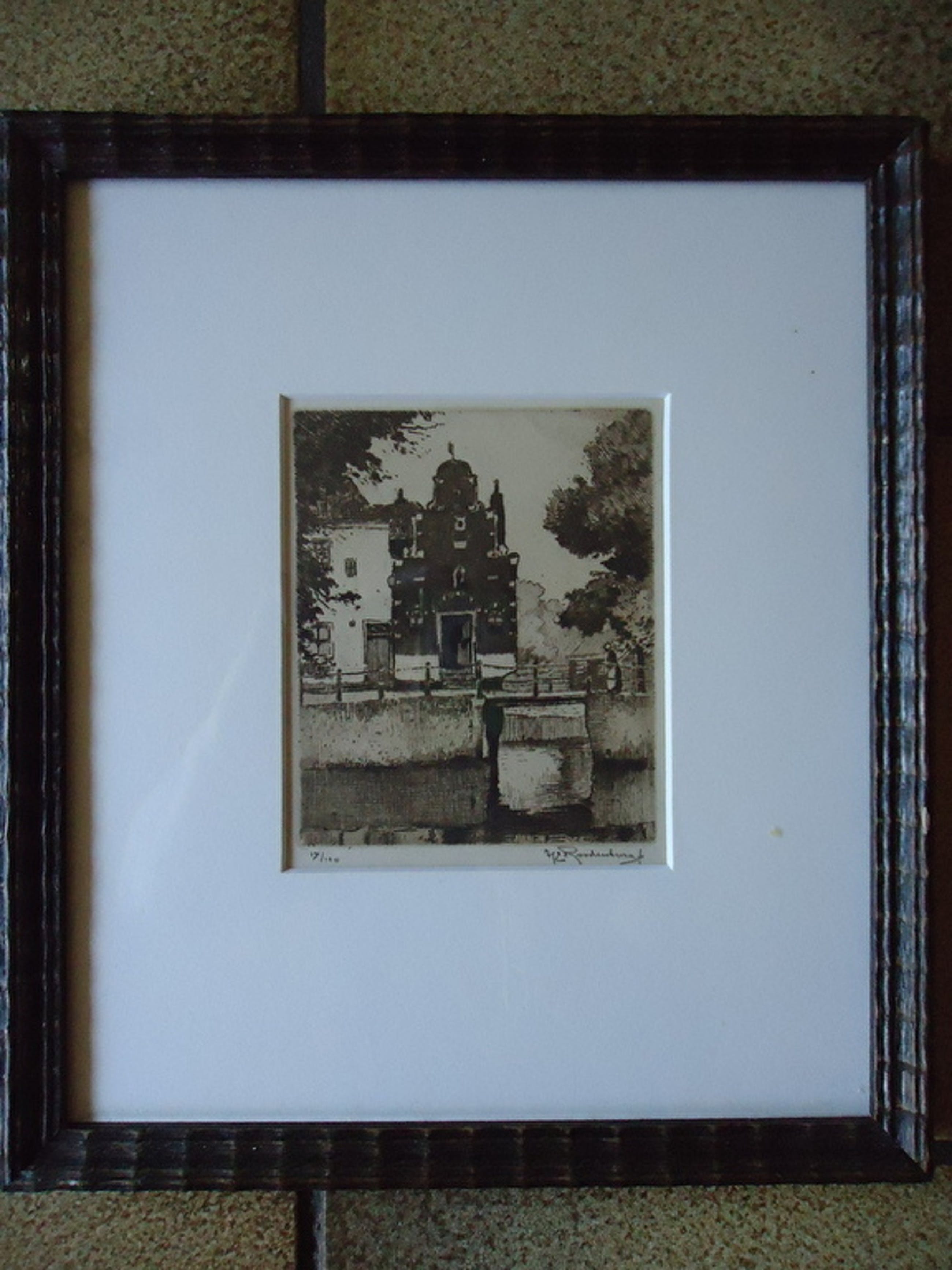 Ets : 12 x 10 cm. Met zuurvrije passe-partout en lijst : 28 x 24 cm.
