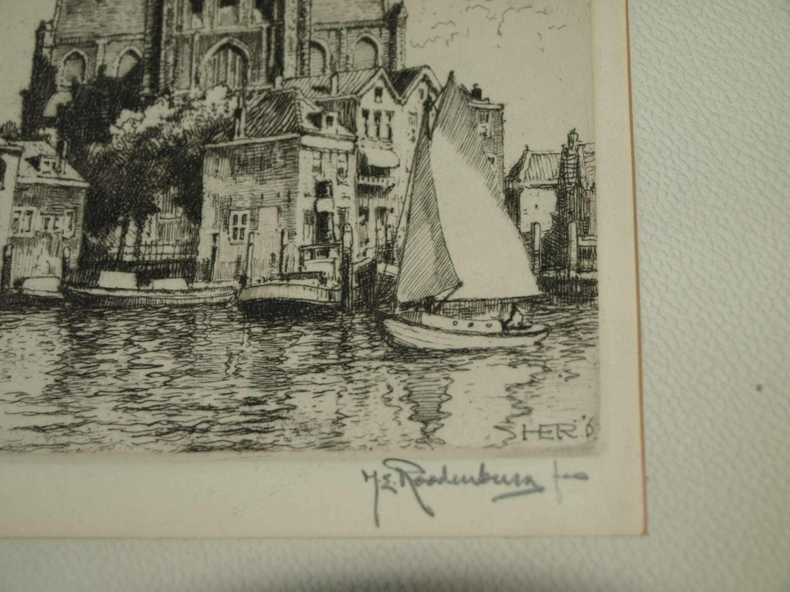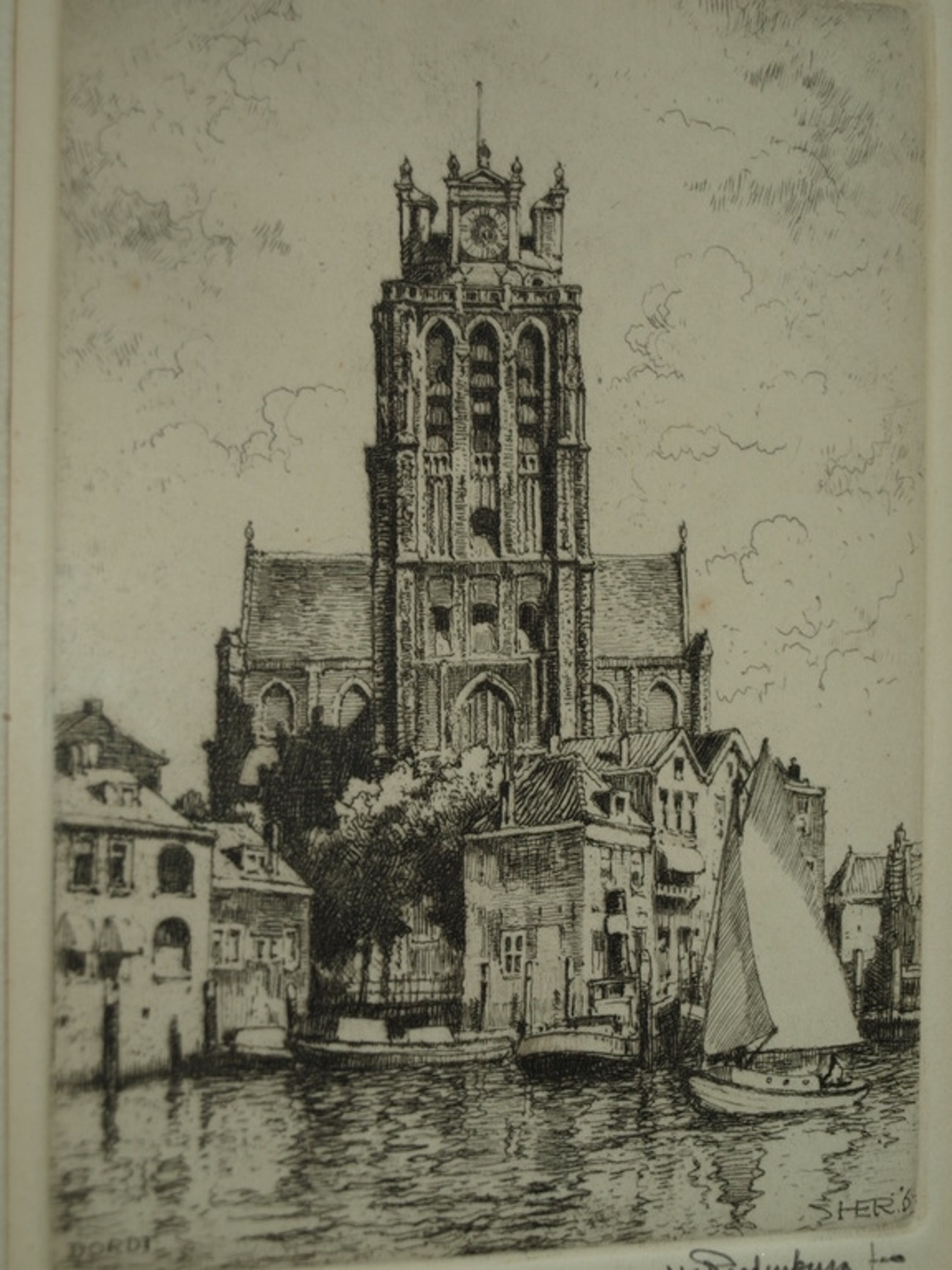 Een ingelijste ets van de Haagse kunstenaar Hendrikus Elias Roodenburg uit 1963. De voorstelling op de ets is De Grote of Onze-Lieve-Vrouwekerk in Dordtecht.