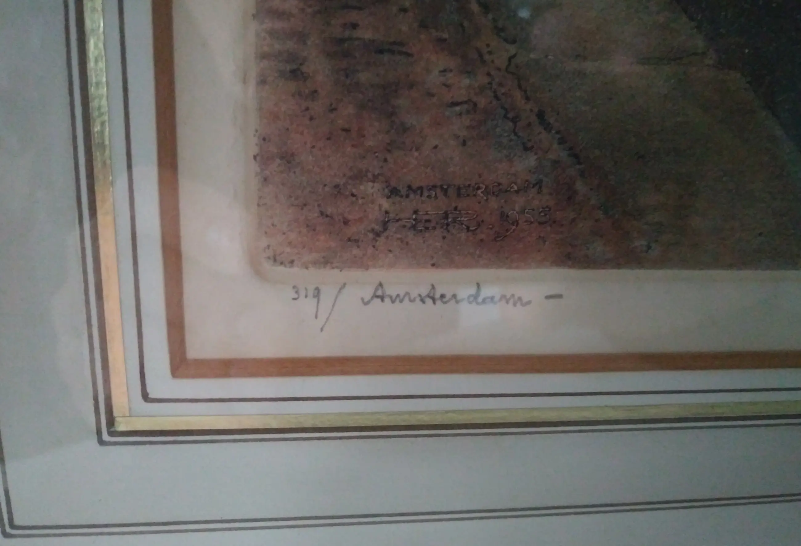 Moie kleurenets van Westertoren met Prinsengracht te Amsterdam. In zeer goede staat. (U ziet lichtreflecties op de glasplaat. Bevinden zich dus niet in de ets).