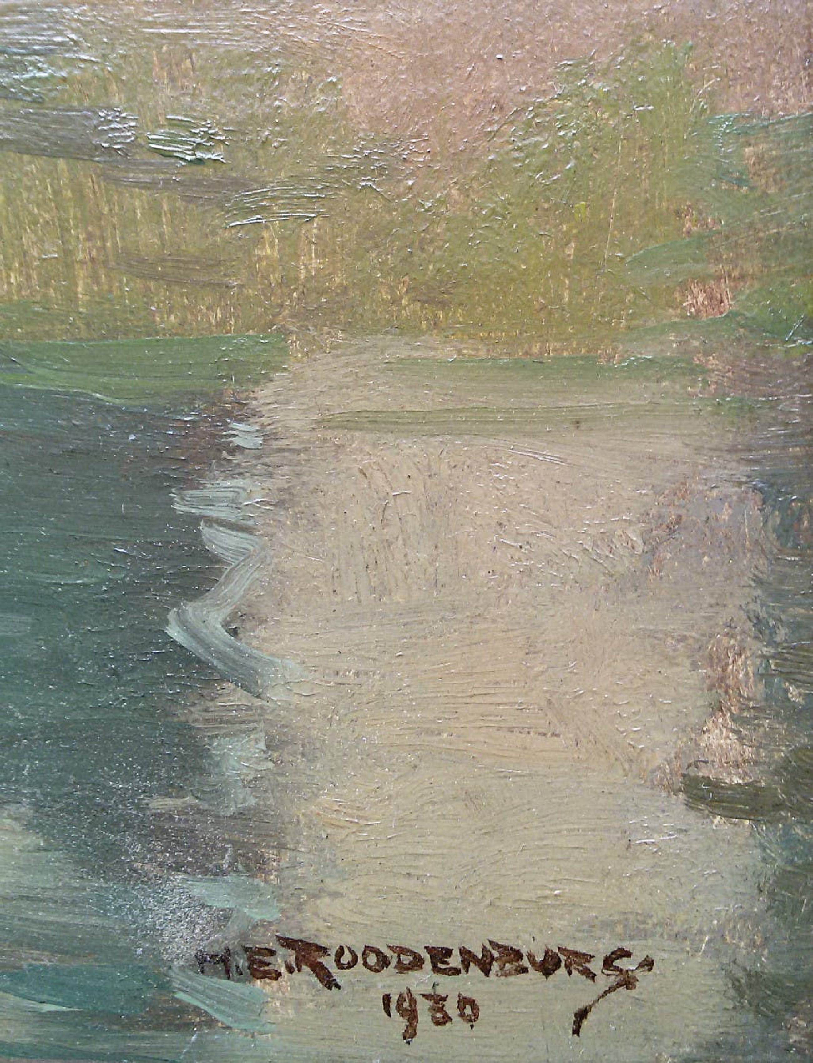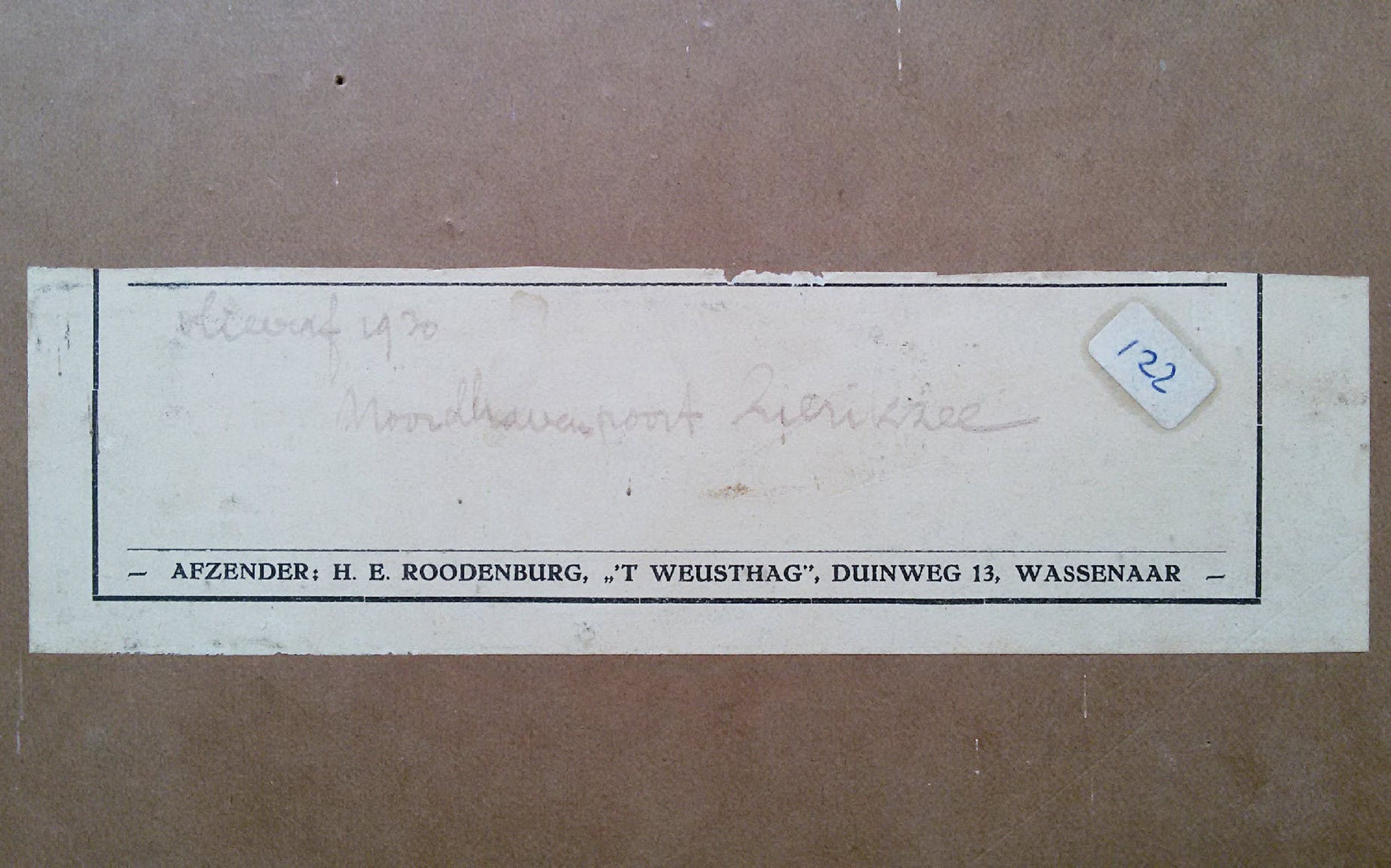Karakteristiek werk van Hendrik Roodenburg, een gezicht op de Noordhavenpoort te Zierikzee. Olieverf marouflé op paneel, rechtsonder gesigneerd en gedateerd (1930). In zeer goede conditie.