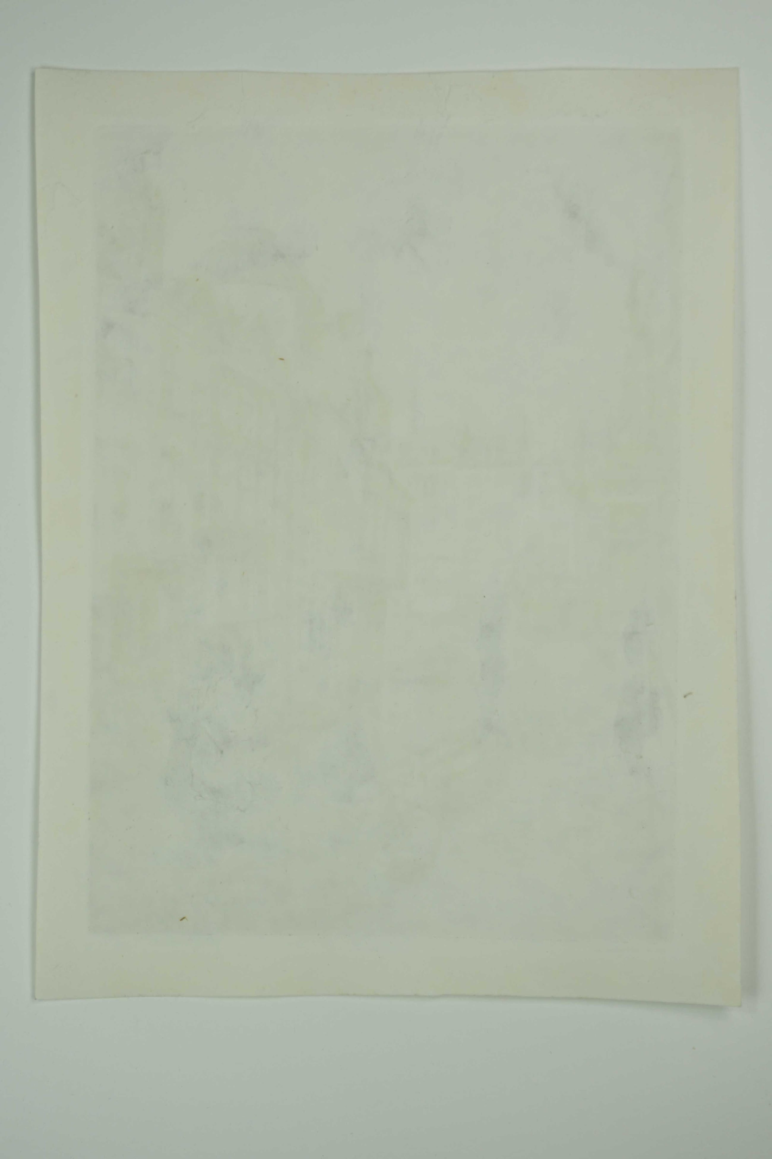 Conditie: Goed, Papier is wat beschadigd in de marge en op verso. Op sommige plekken is het papier hierdoor dun. Voldoende marge, licht glooiend papier.