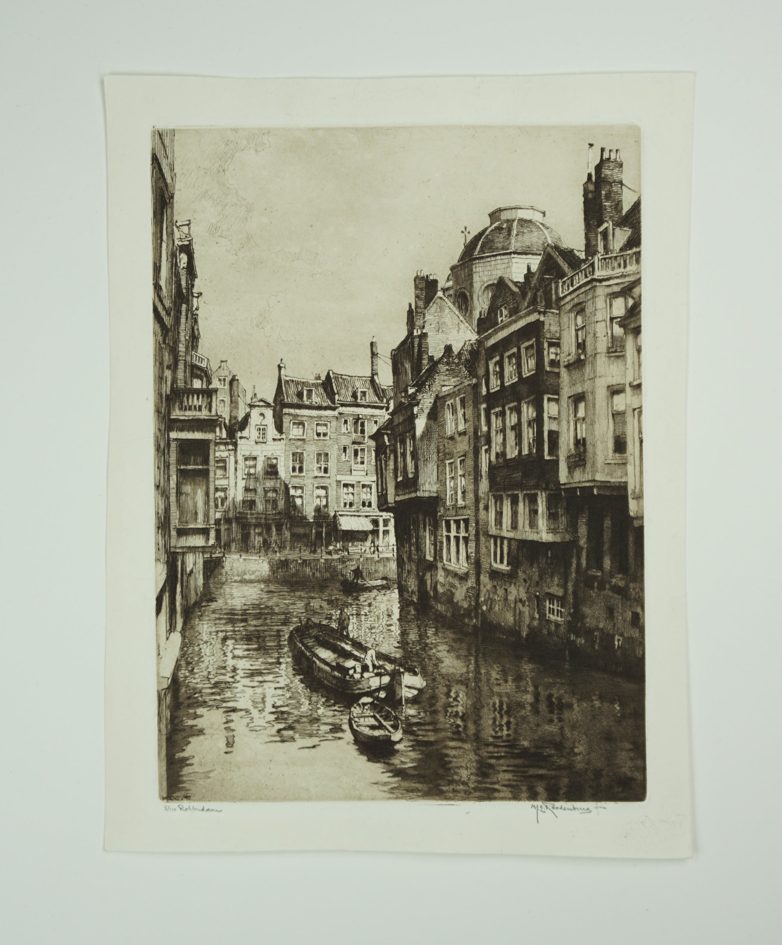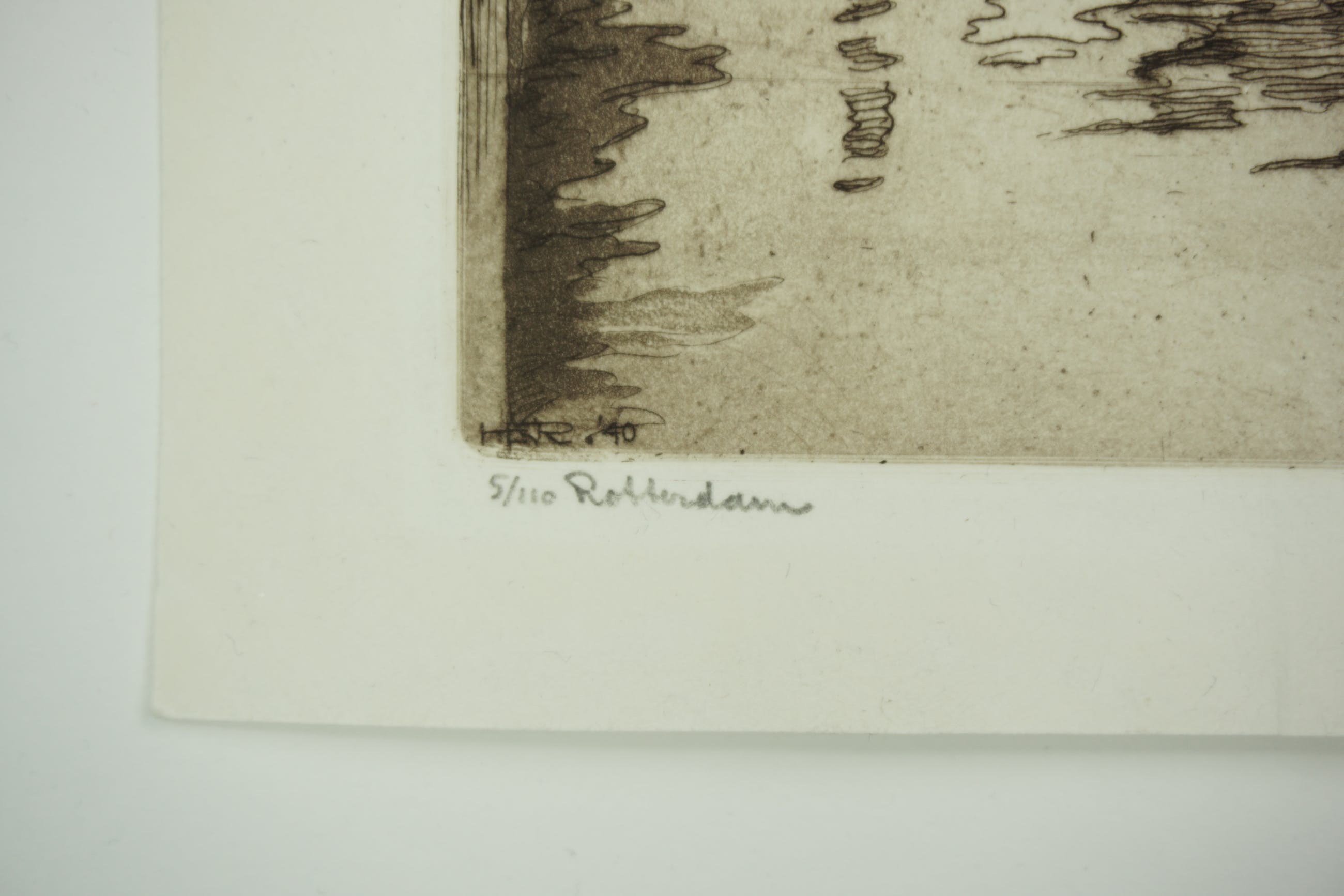 Ets van Rotterdam gemaakt door Hendrik Elias Roodenburg in 1940. Handgesigneerd en gemomongrammeerd in de plaat.