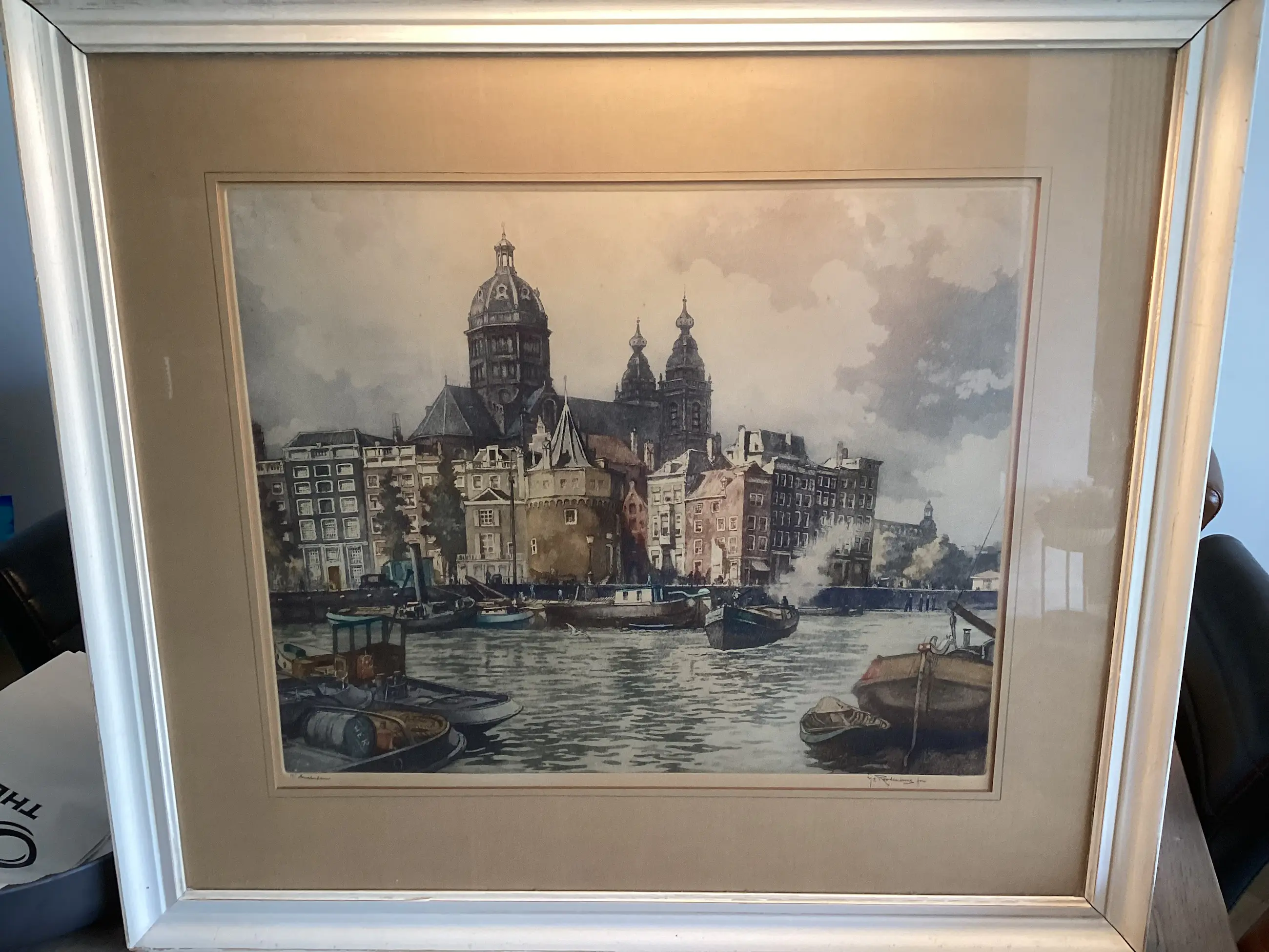 Unieke weergave van de Schreierstoren (oorspronkelijk gebouwd als deel van de stadsmuur) en de basiliek van de Heilige Nicolaas aan het Open Havenfront, dat onderdeel is van het IJ, in Amsterdam. In houten lijst, achter glas met dubbel passe-partout.