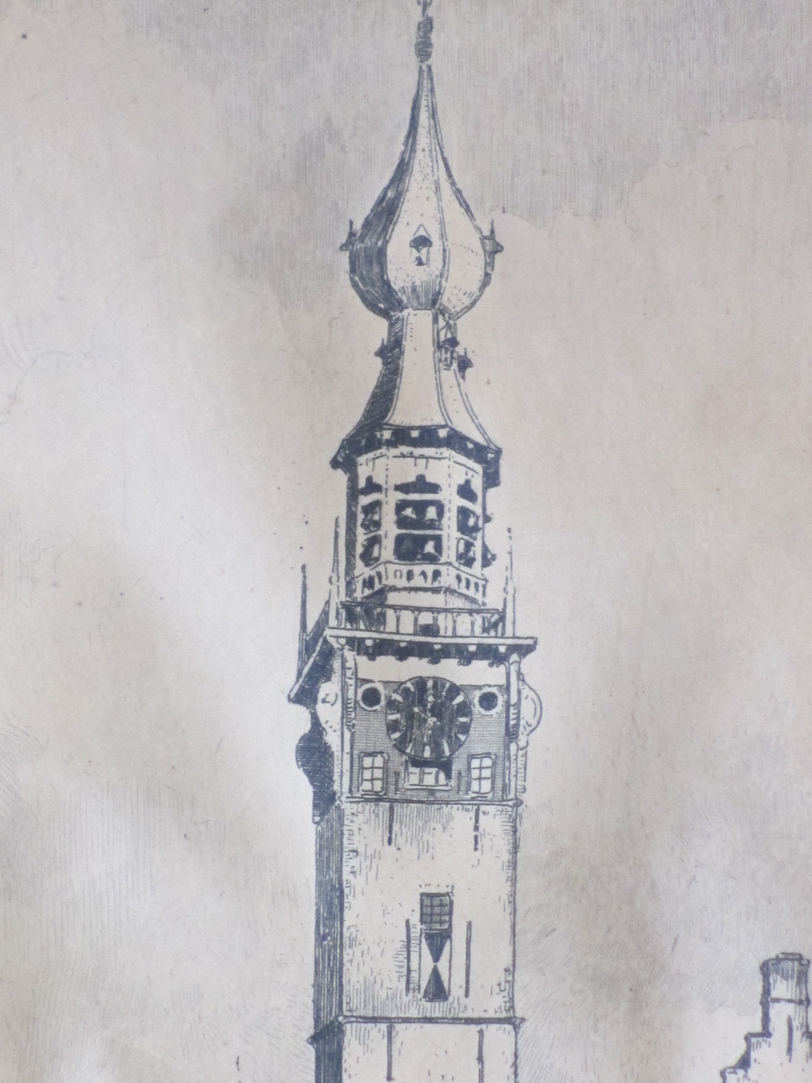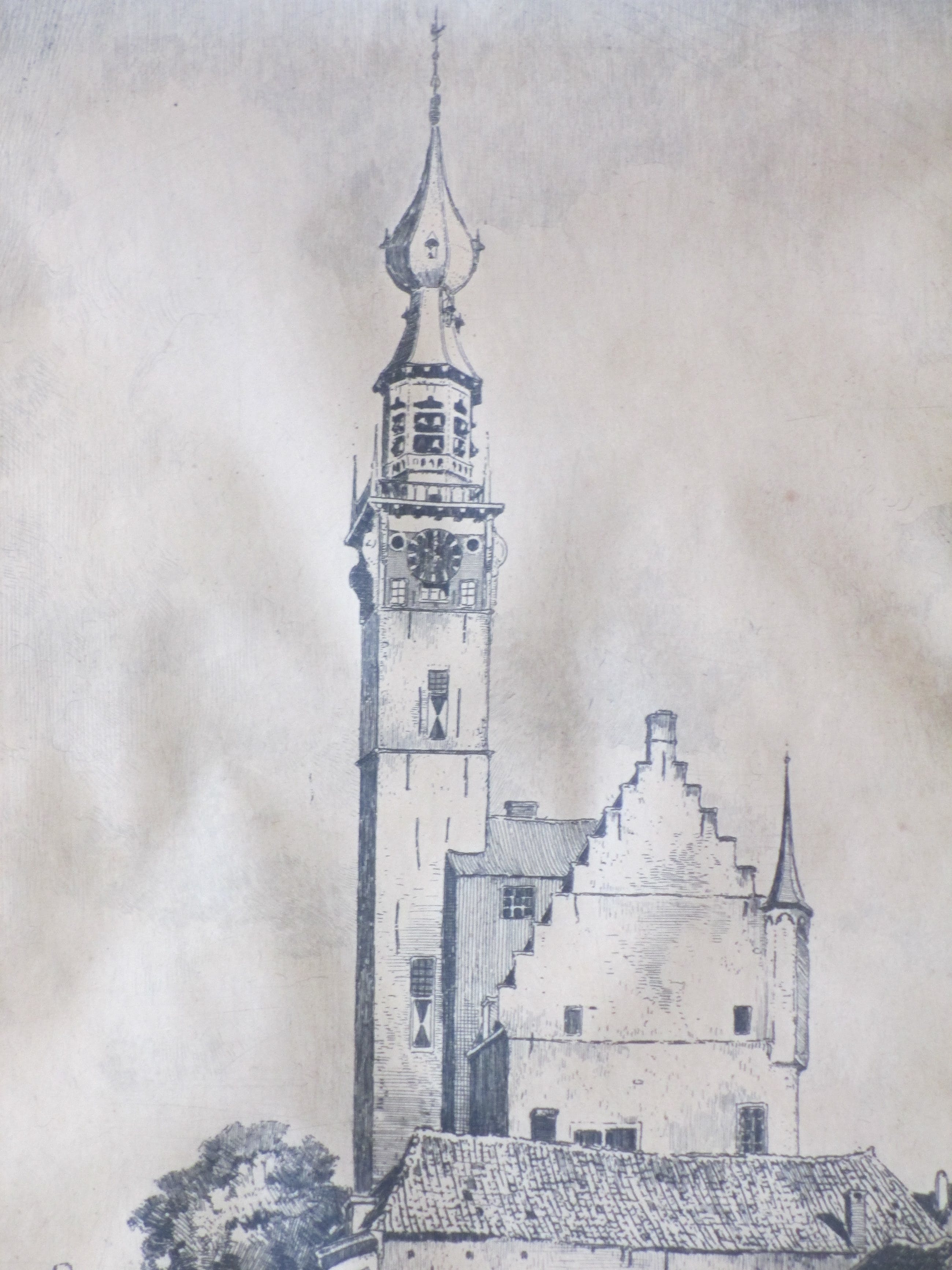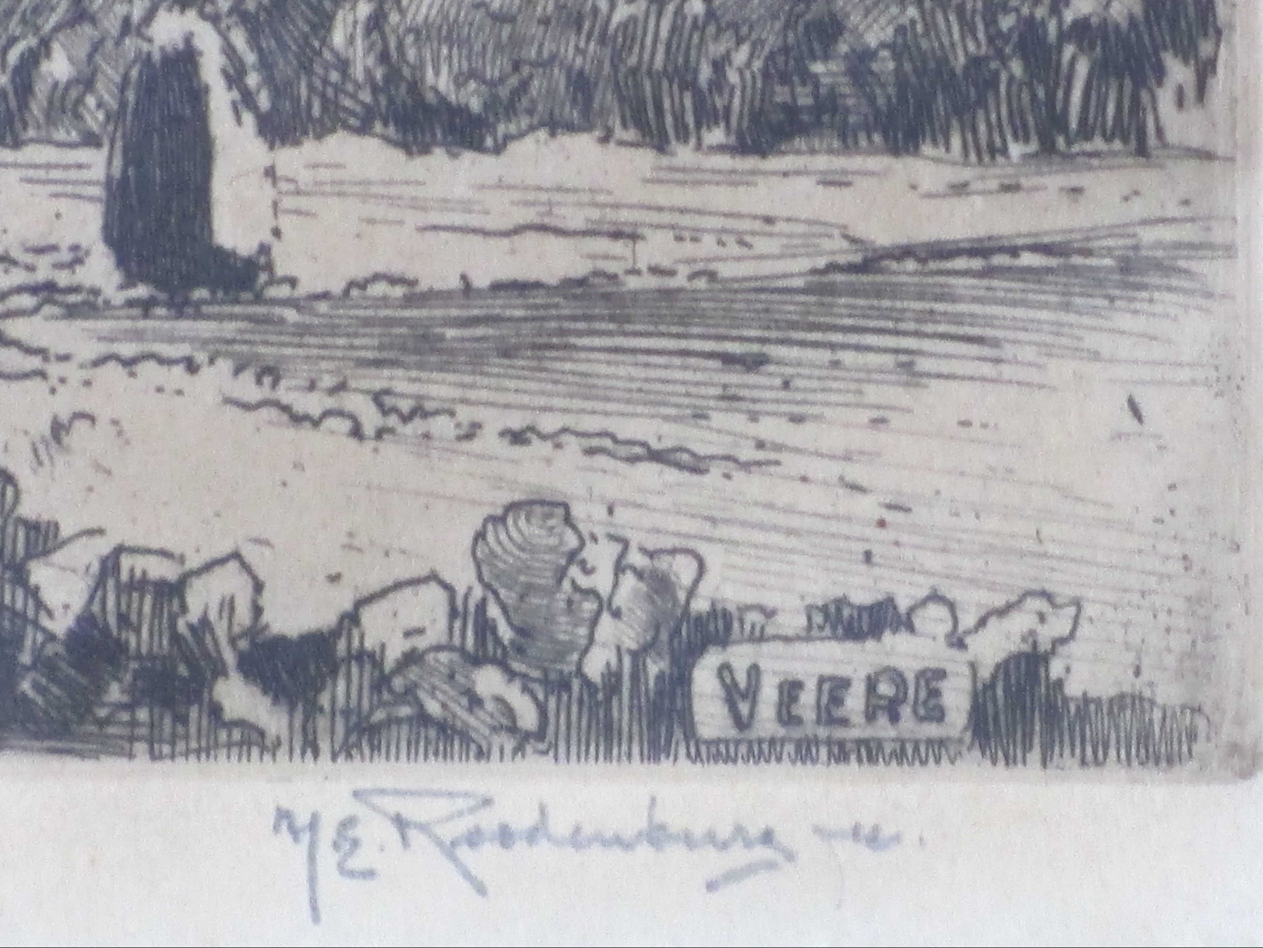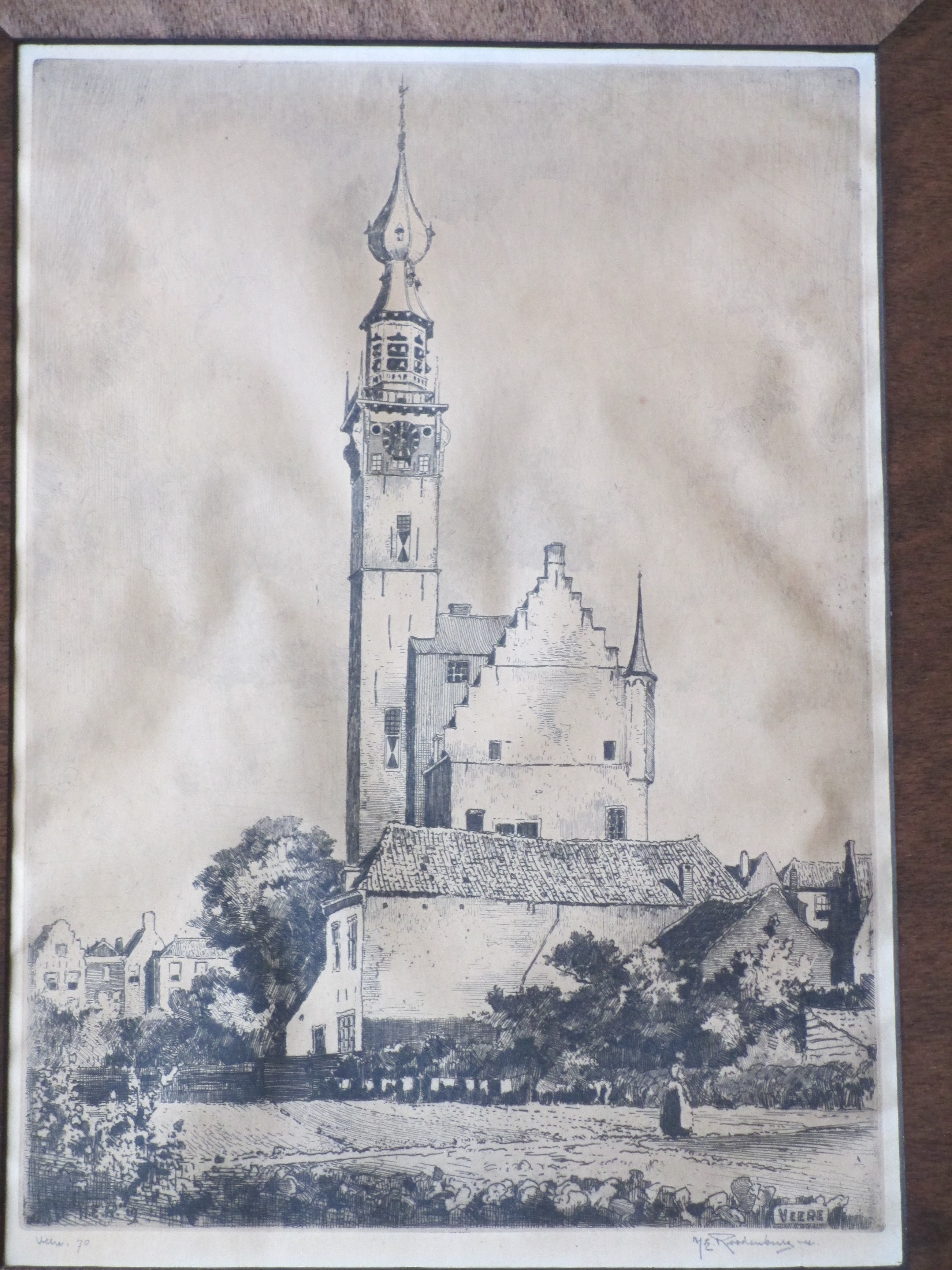 Bijzondere ets door Hendrik Roodenburg. Voorstelling van de stadhuistoren in Veere. Ets onder passepartout, beeldmaat 32x23, p.p.maat 48x36 Gesigneerd in potlood r.o.: 'H.E.Roodenburg' Tevens gemonogrammeerd en gedateerd l.o. in de druk: 'H.E.R. '19' Dit is bijzonder te noemen, want deze ets komt niet voor in de oeuvrecatalogus van Roodenburg. Wel een vergelijkbare, maar veel kleinere ets uit 1916; H.E.Roodenburg - Topografisch etser - GK.E. - 1916 - 16 Getiteld en genummerd in potlood l.o.: 'Veere 70' Authenticiteit volledig gegarandeerd