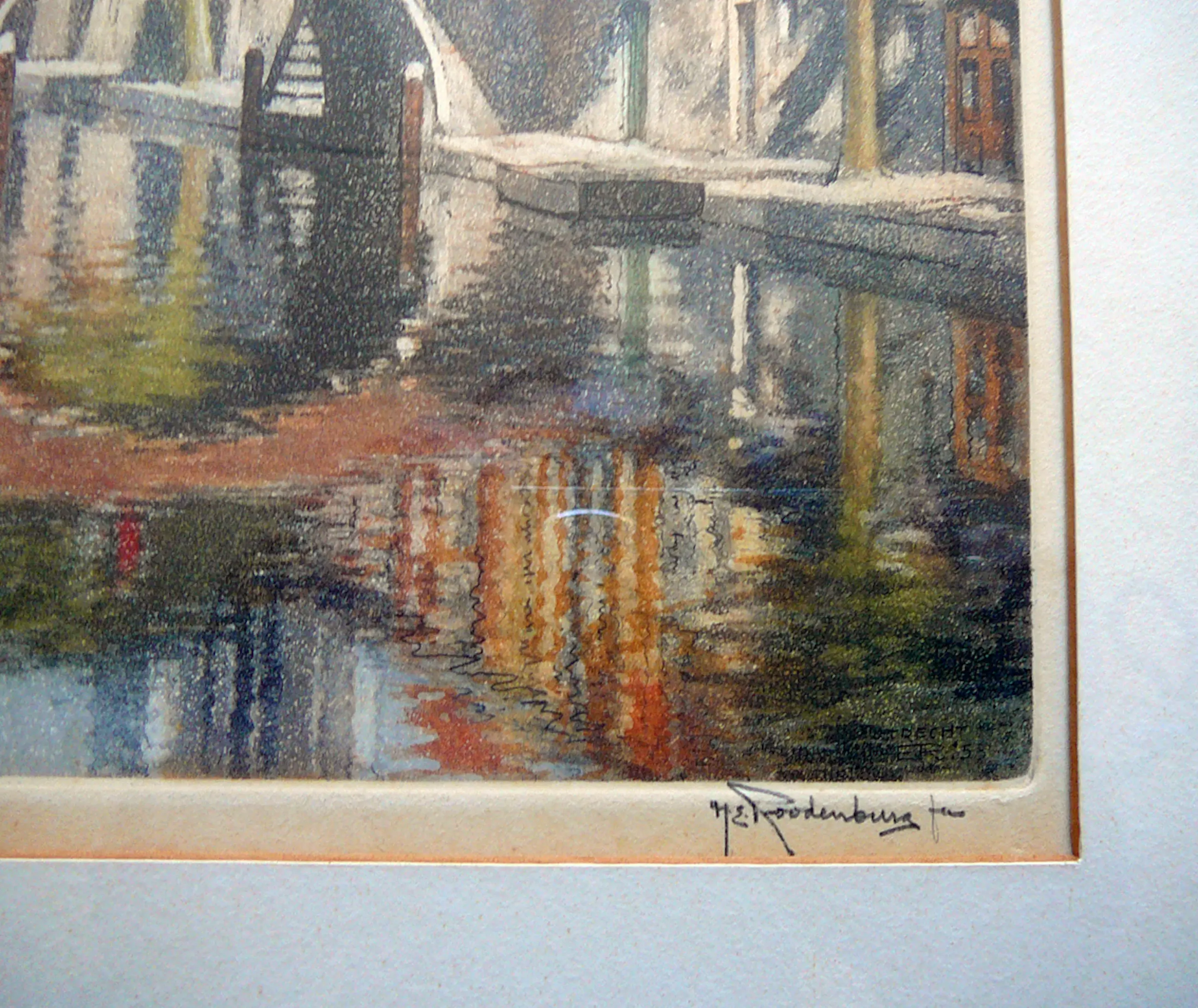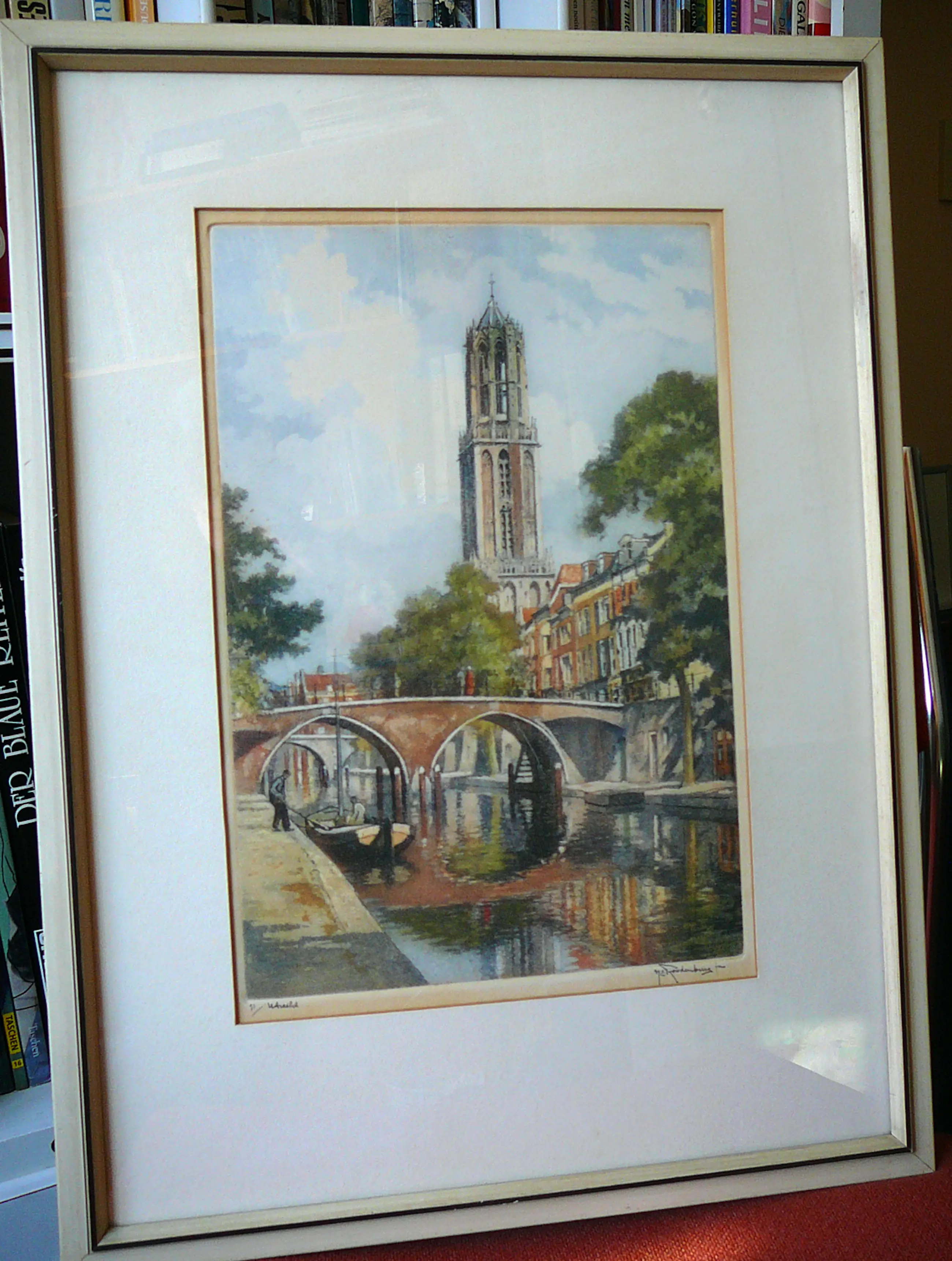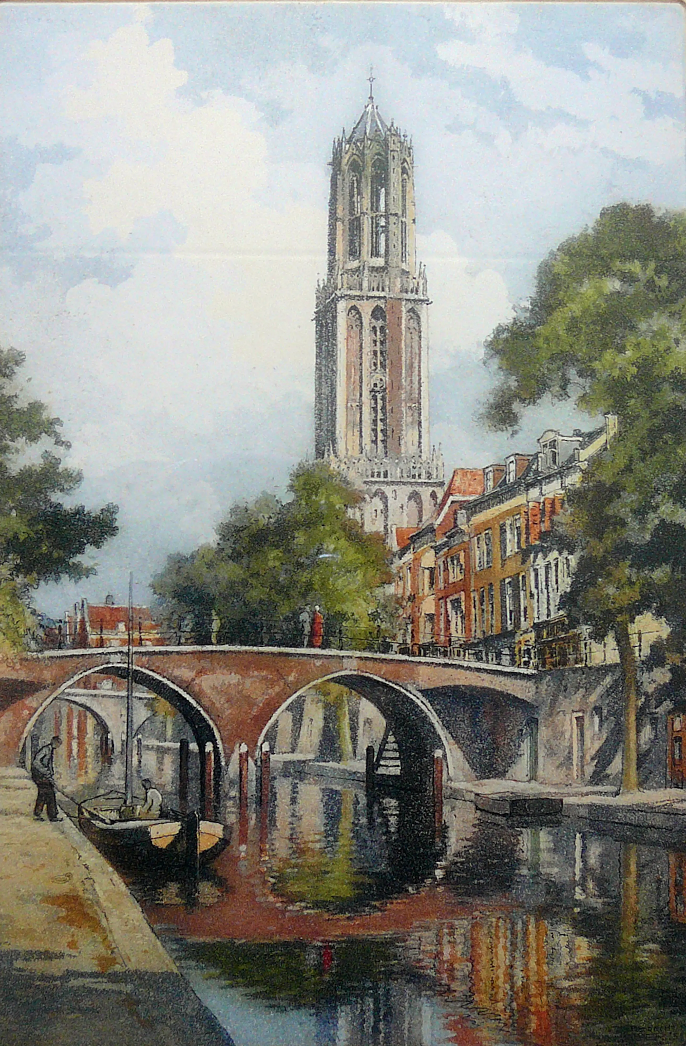 Schitterende, klassieke en historische ets van de hand van Hendricus Elias Roodenburg met zicht op de Utrechtse Dom vanaf de Oudegracht. De ets is genummerd 93 en gedateerd tussen 1930 en 1935. Daarbij verkeert zowel de ets als de lijst in zeer goede conditie zonder noemenswaardige gebruikssporen. Afkomstig van de eveneens legendarische Kunsthandel Brugsma aan de Choorstraat te Utrecht.