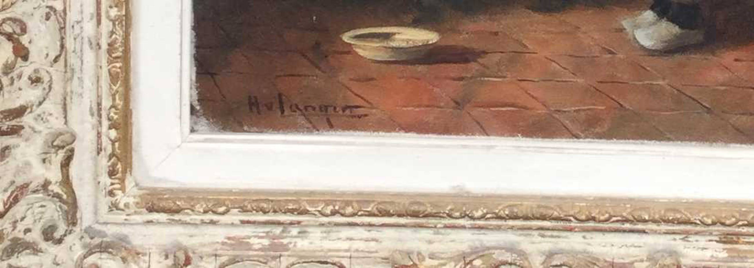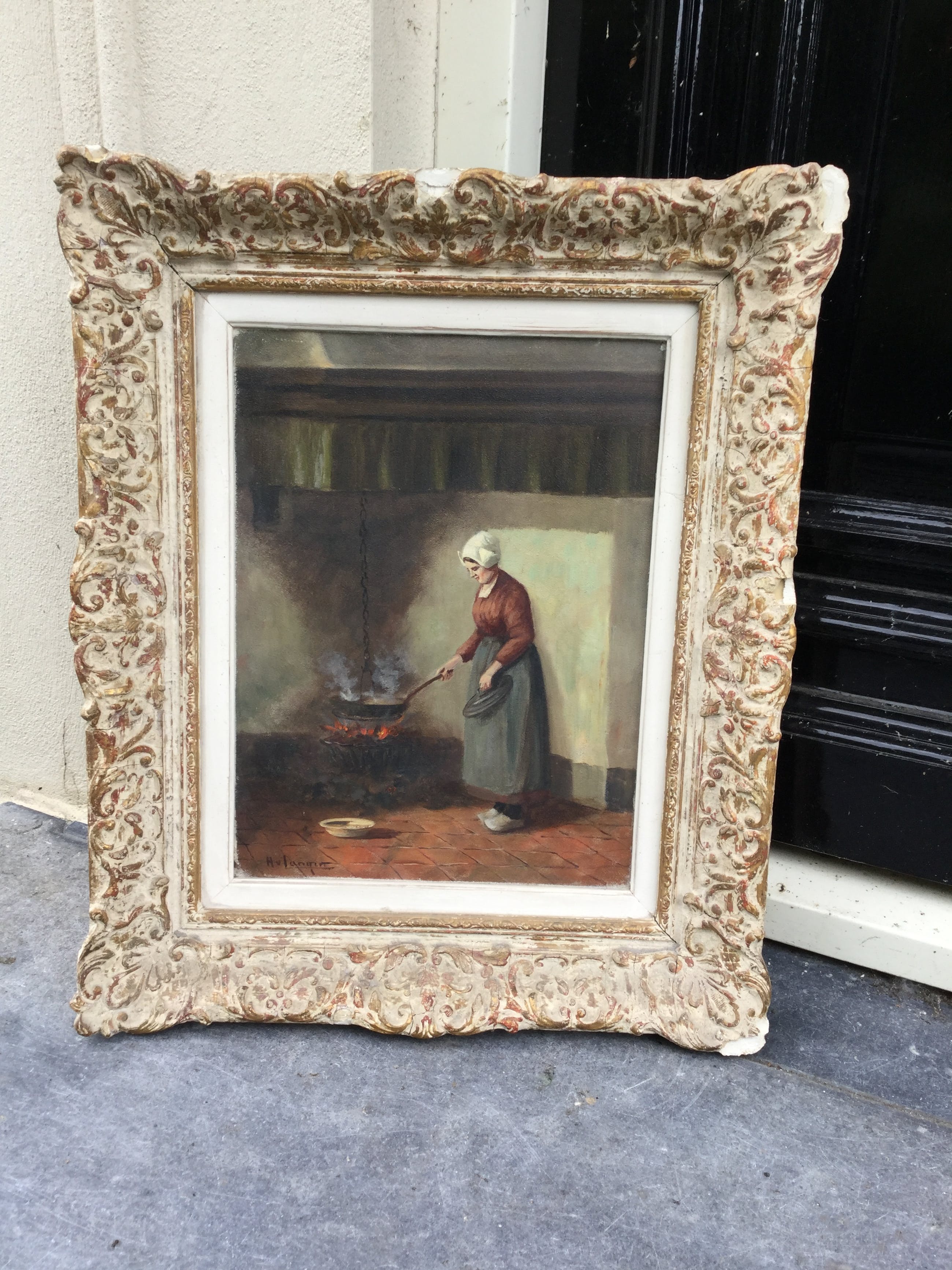 | Doek bevat oppervlaktevuil en verkleurde vernis door de tijd, doek bobbelt en is slap, lijst bevat oppervlaktevuil en slijtschade door de tijd, ornamentschade. | |